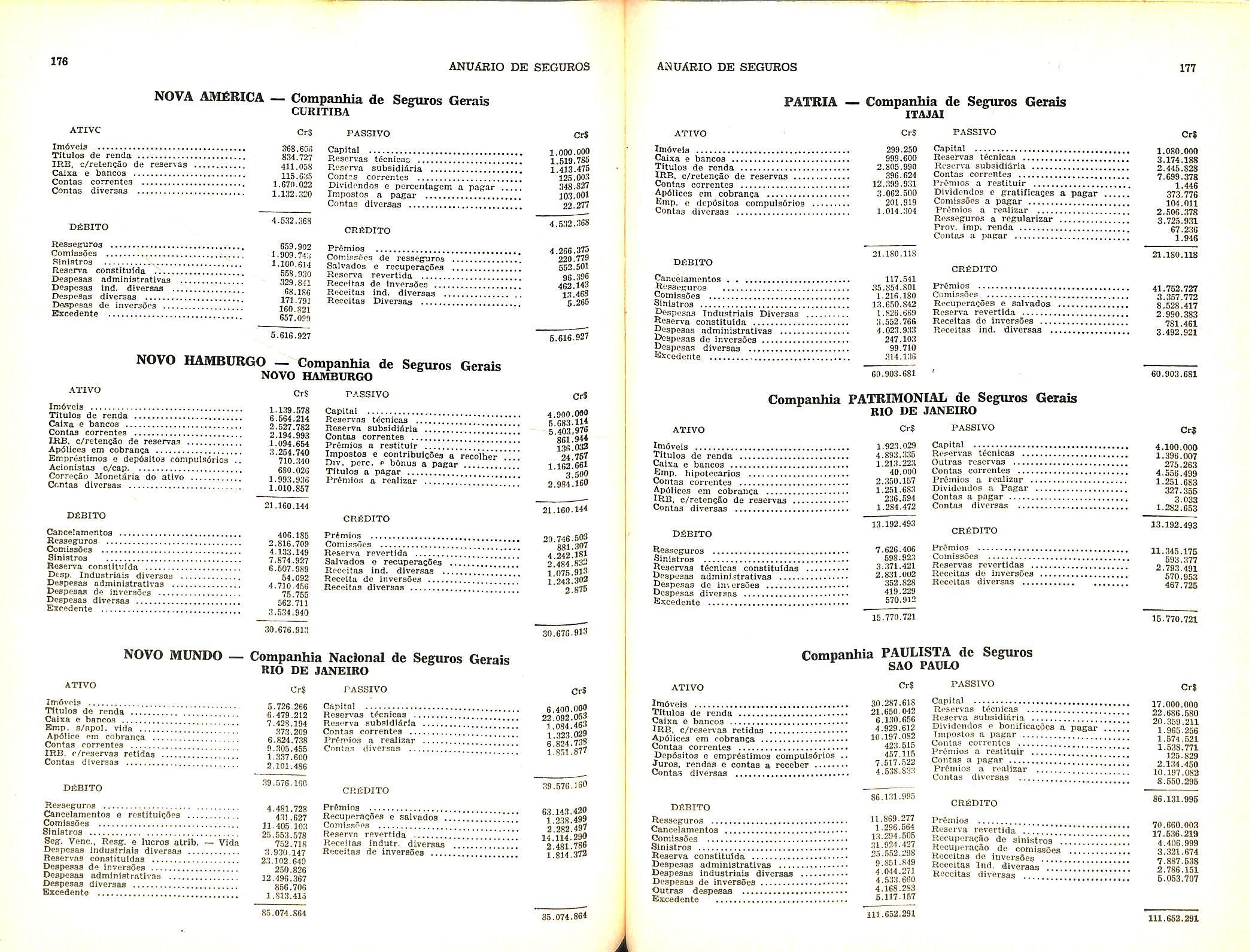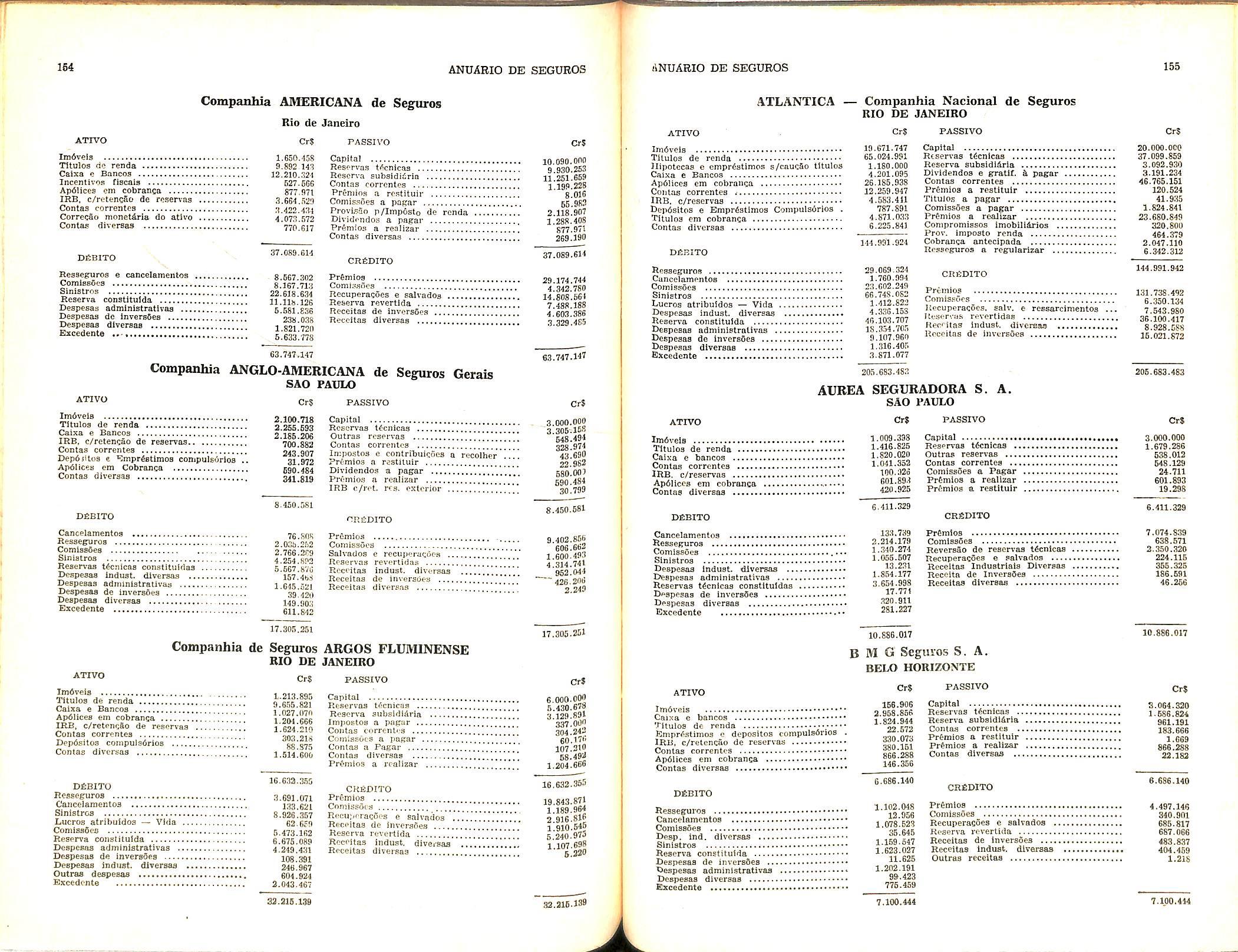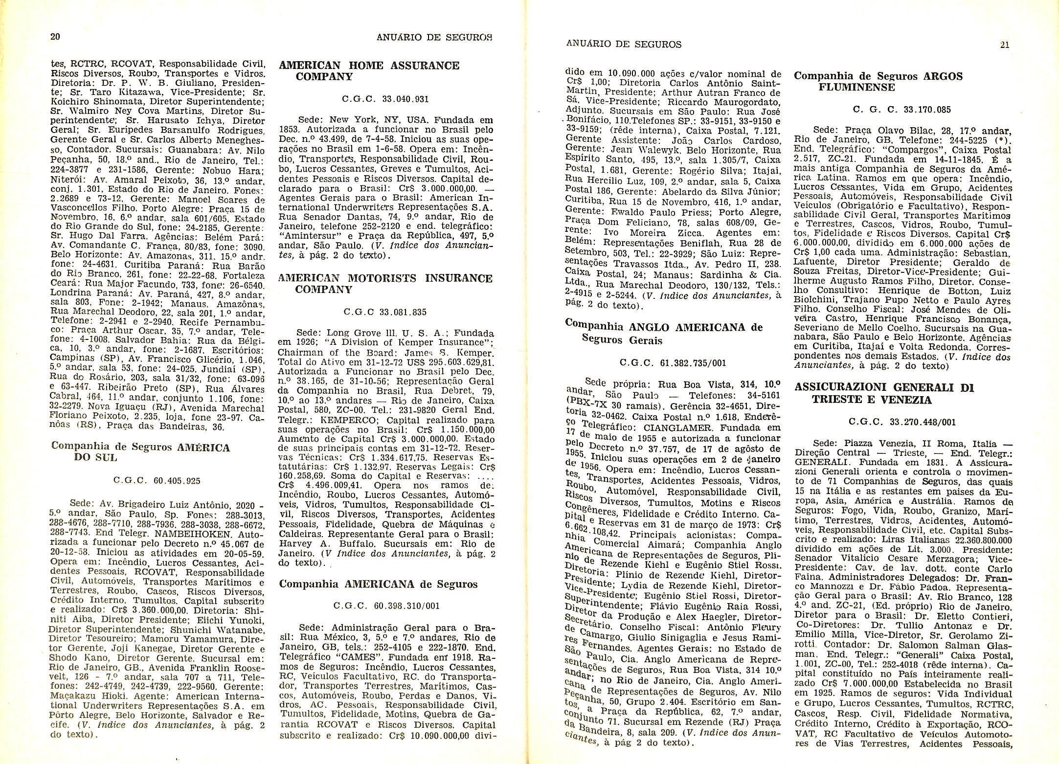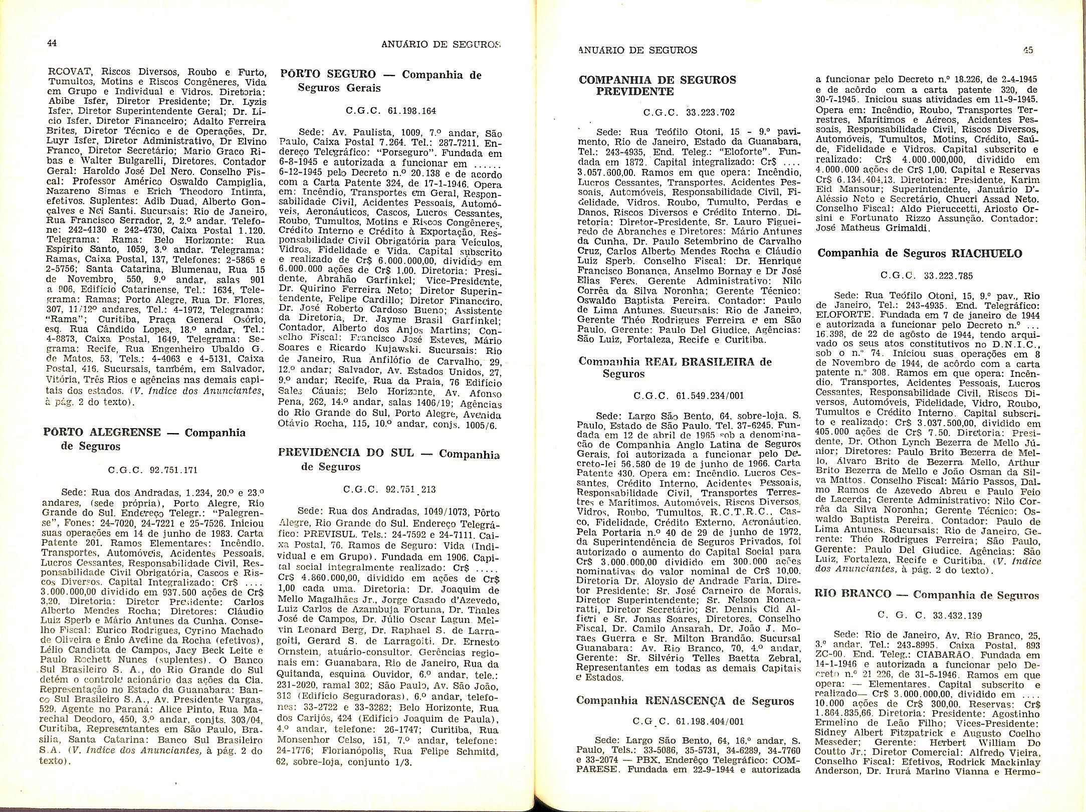 America Latina, Anglo Americana, Aurea Seguradora, Central, Commercio e Industria. Cruzeiro do Sul, Estado de Sao Paulo, Fidelidade, Ipiranga, Indiana, Itaii Seguradora, Kyoei do Brasil, Lideranga Cap., Paulista, Phoenix Paulista, Piratininga, Porto Seguro, Real Brasileira, Renaseenga, Saga Corretores, Sao Paulo. Sul Brasil e Vera Cruz,