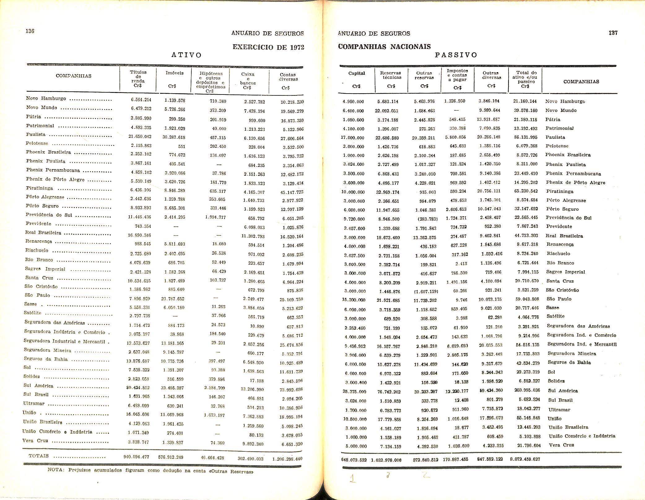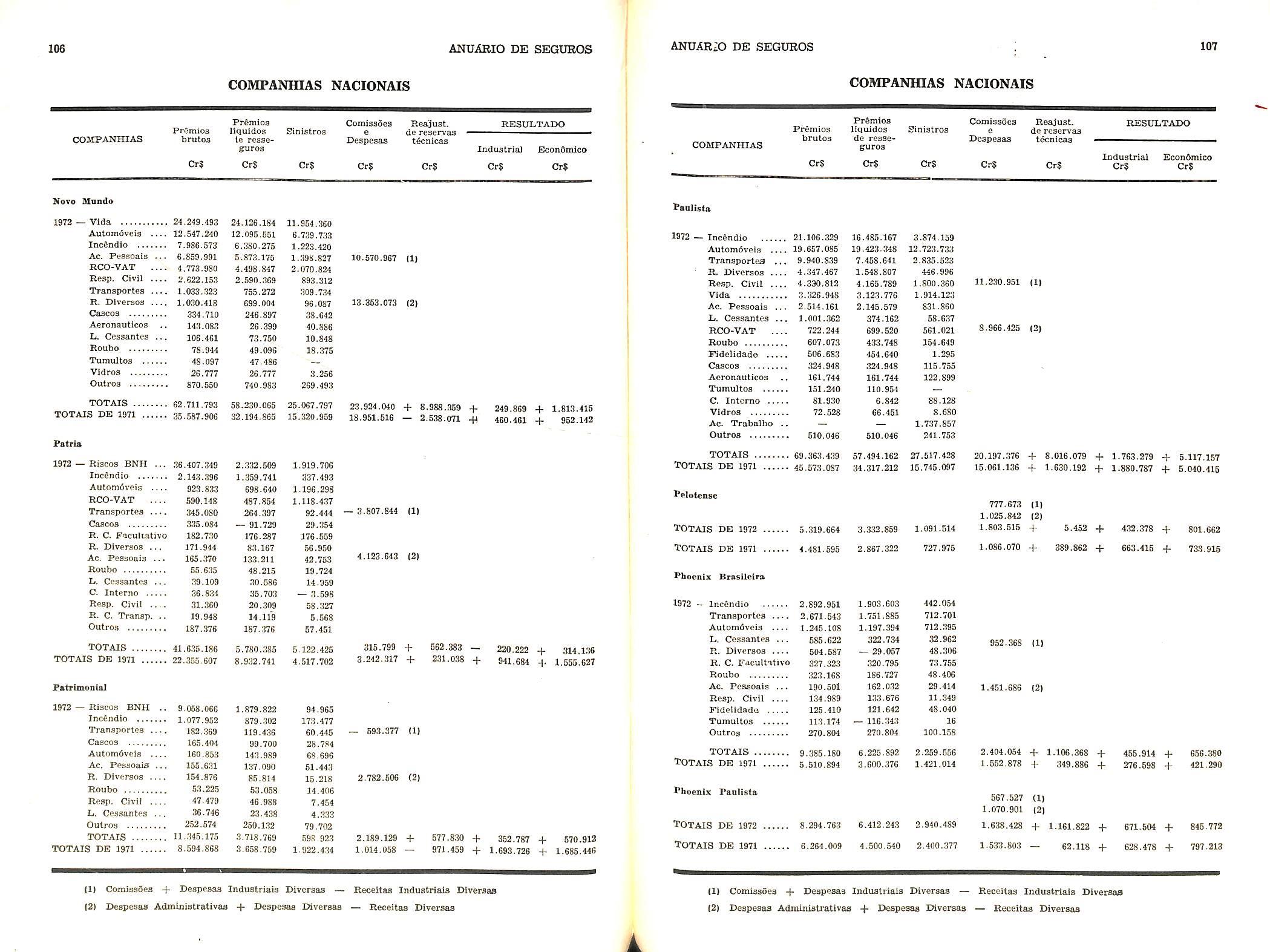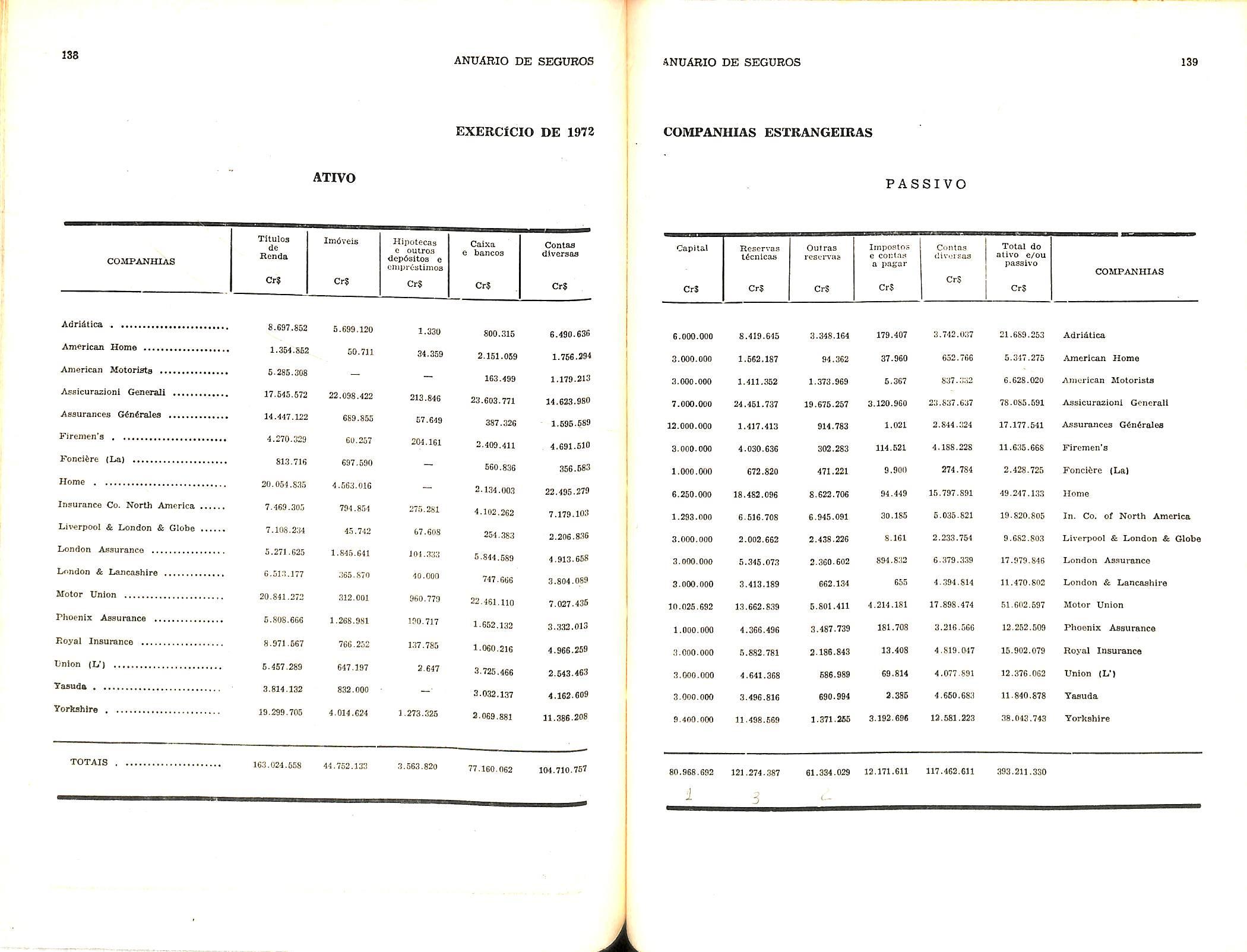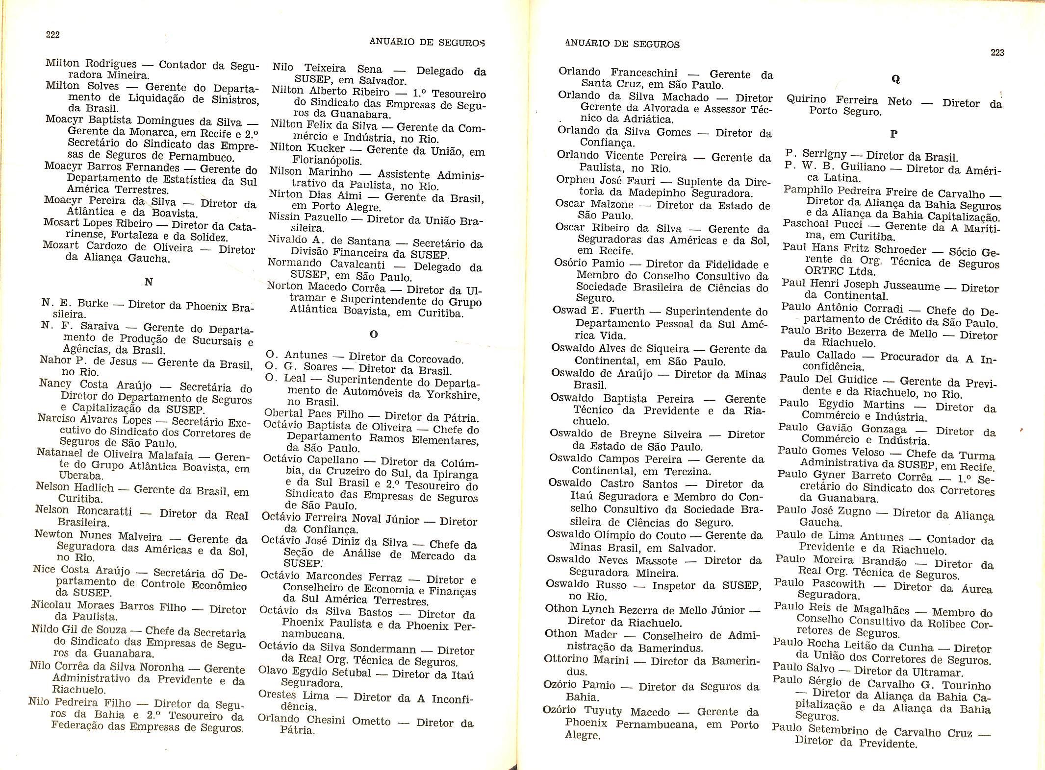America Latina, Anglo Americana, Aurea Seguradora, Central, Commercio e Industria. Cruzeiro do Sul, Estado de Sao Paulo, Fidelidade, Ipiranga, Indiana, Itaii Seguradora, Kyoei do Brasil, Lideranga Cap., Paulista, Phoenix Paulista, Piratininga, Porto Seguro, Real Brasileira, Renaseenga, Saga Corretores, Sao Paulo. Sul Brasil e Vera Cruz,