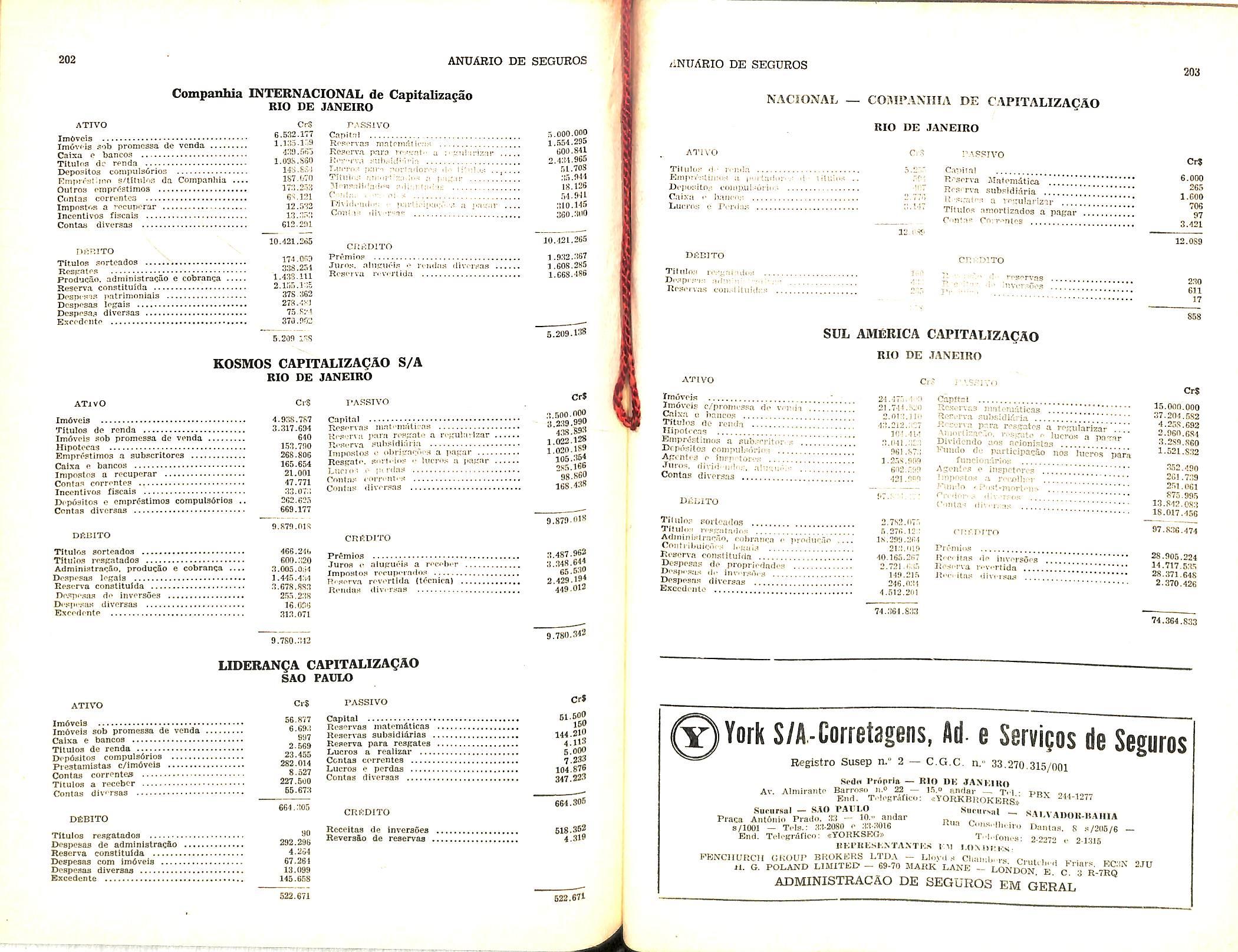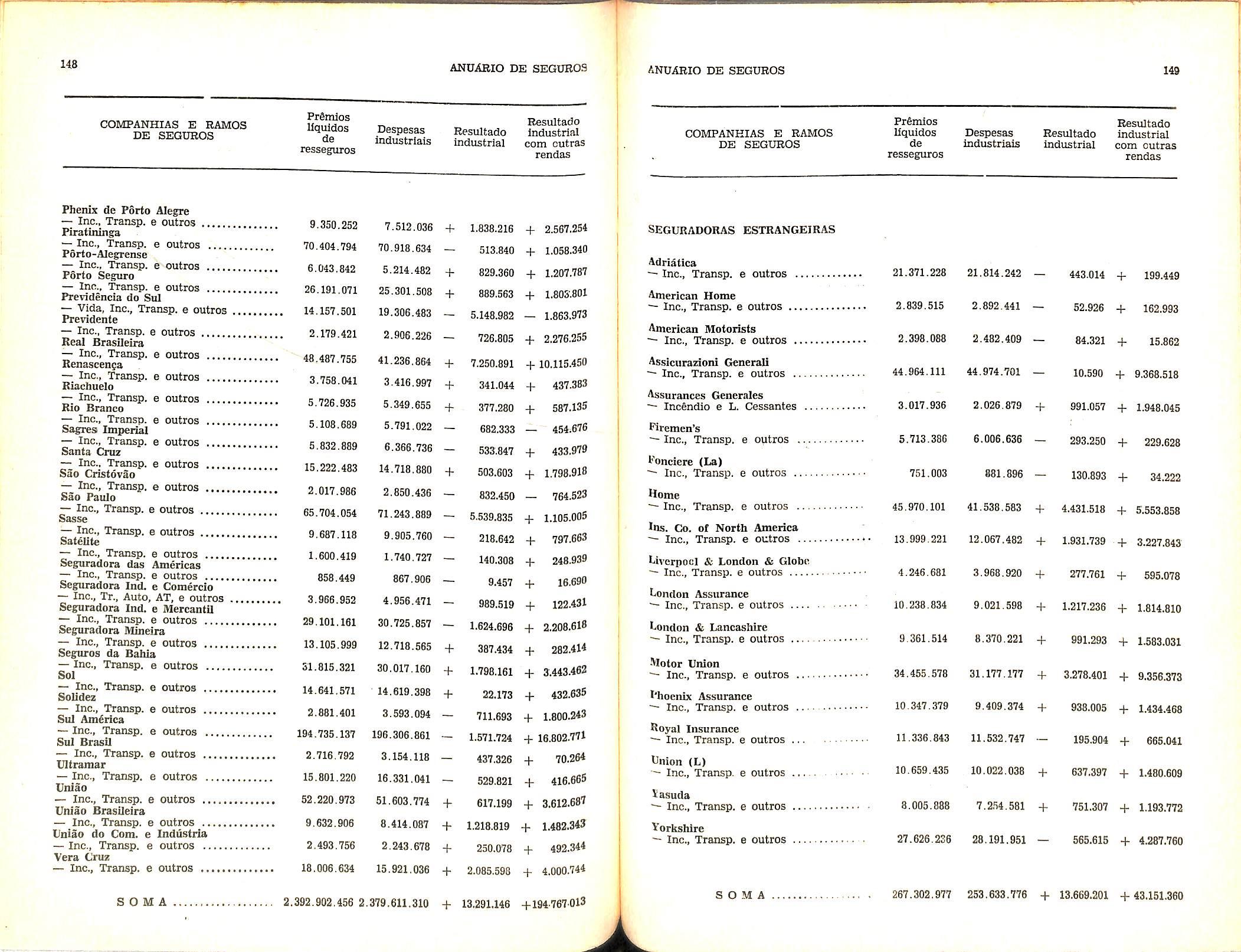 sileira, Phoenix Pernambucana, Previdente, Riachuelo, Rio Branco, Royal Ins., Sao Paulo, Santa Cruz, Securitas Uniao Corretores, Seguradora Indiistria e Comercio, Seguradora Industriale Mercantil, Seguradora Mineira, Sol, Solidez, Sul America Cap., Sul Ameri ca _Terrestres, Sul America Vida Uniao, Uniao Brasileira, York Corretores e Yorkshire. Wood & Cia. Ltda London Assurance e London & Lancas hire.