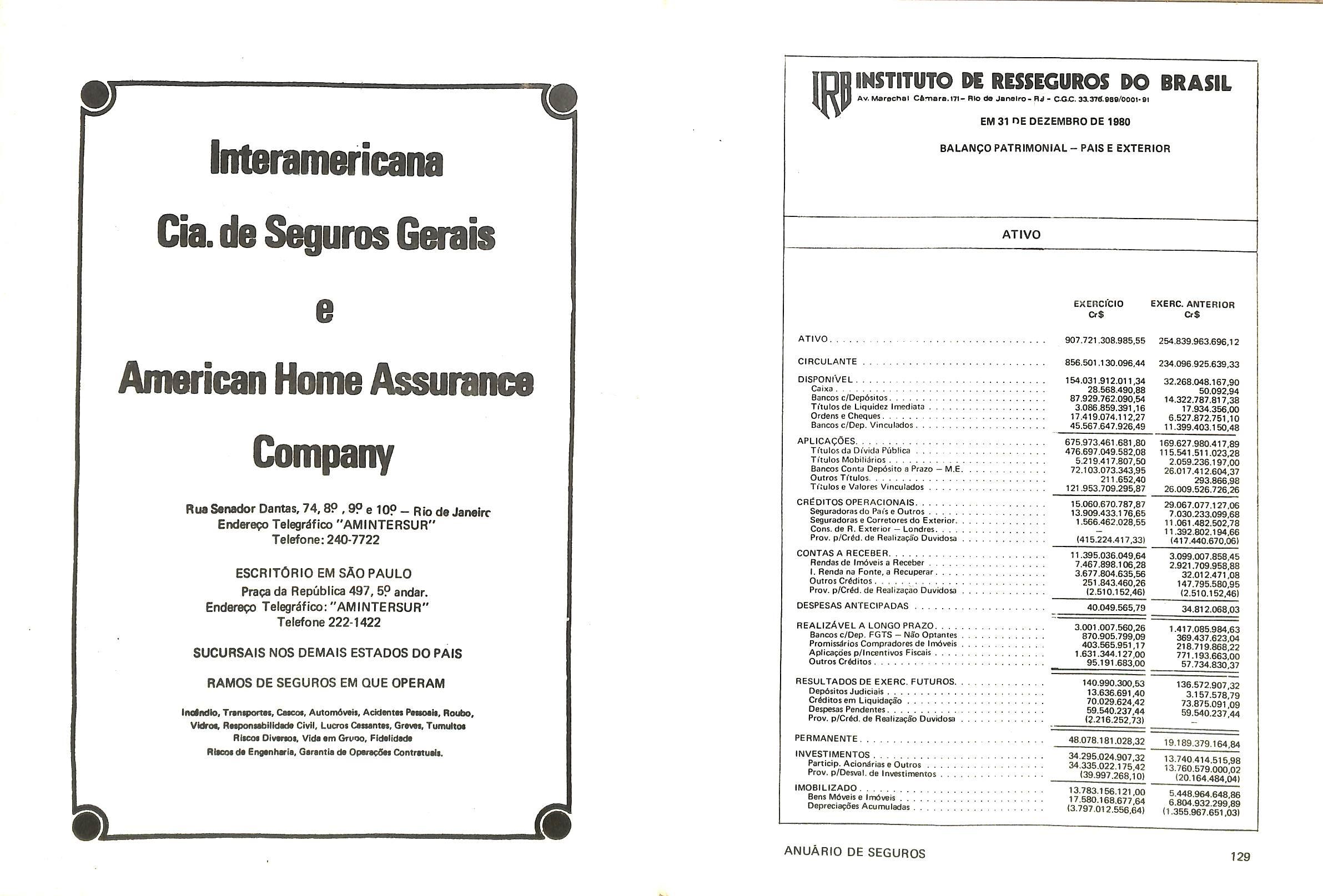 Sede;Av.Sao Luiz,50-26'and.Sao Paulo(SP].Tel.:[011)256-2522.CEP 01046.Polo Decreto n'18.669 de 29 de maic de 1929 e concedida a au to ri7.agio pam iniciar ^uaa operagoes de oe^uros,com o noms de Companhia Adriatica de Seguros. Em 10 de abril de 1980 conforms portaria n^214-A do MF.passou a ser uma Sociedade brasileiro com a denominagao de Companhia Adriatica de Se guros Gerais — CAS. A Adriatica faz parte do grupo oegurador RI UNI ONE AORIATICA DI SICURTA - RAS.coir. se de em (lilano-Corso Italia,23/25-1talia.operando em 43 paises. Capi tal Social no Brasil:Cr$