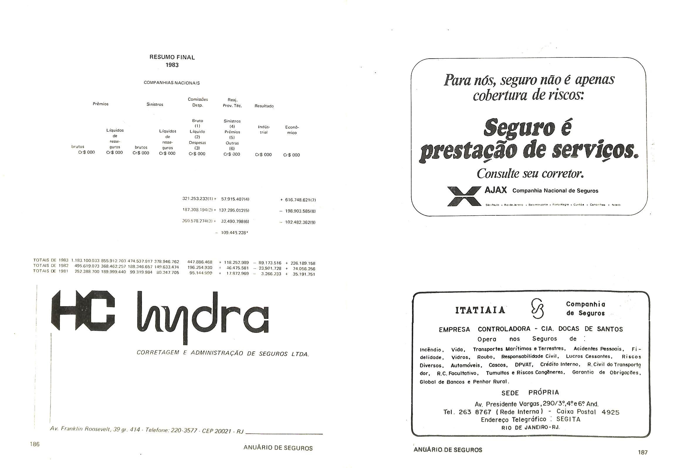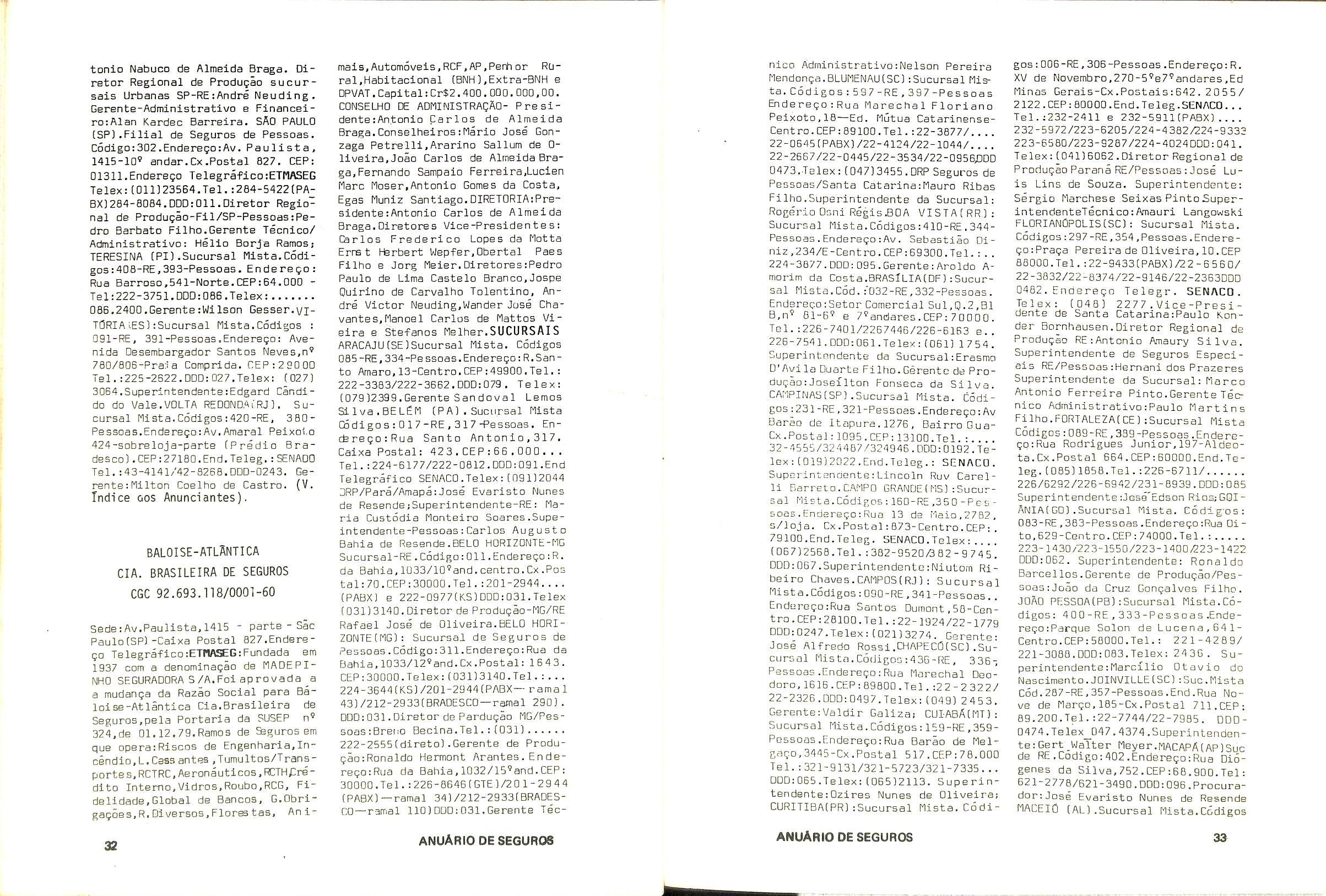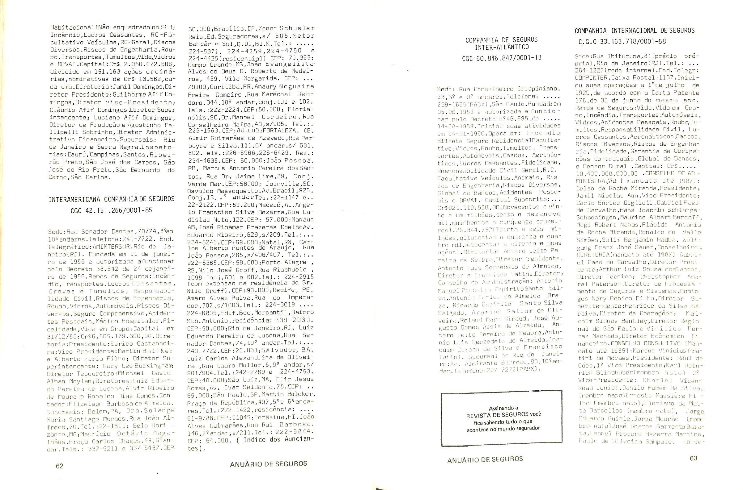 minagao em 02 oe margo de 1971,pela portaria 13 da SUSEP; autorizada a operar nos seguros do ramo Vida pela Carta Patente n' 495 de acordo com a portaria n' 11 da SUSEP, de 26/01/1982.Capital de Reserve: Cr$ 5.110.899.000,00.Produgao de premi□s cobrados em 1983: Cr$ 12.530.209.000.00.OPERA EM TOODS OS RAMOS DE SEGUROS.Diretor-Presiden te: Roberto Muniz Rondon jDiretor Superintendente:Adolpho Bertoche FiIhojDiretor Comercial:Dalvares Barros de Mattos;Diretores:Paulo Ber toche e Samuel Naschpitz.SUCURSAIS