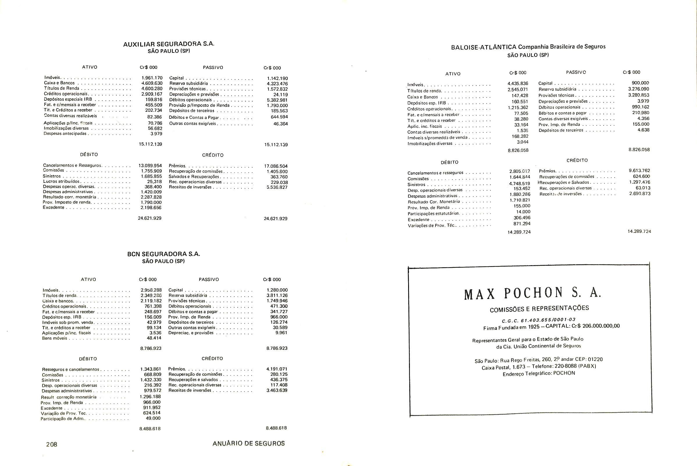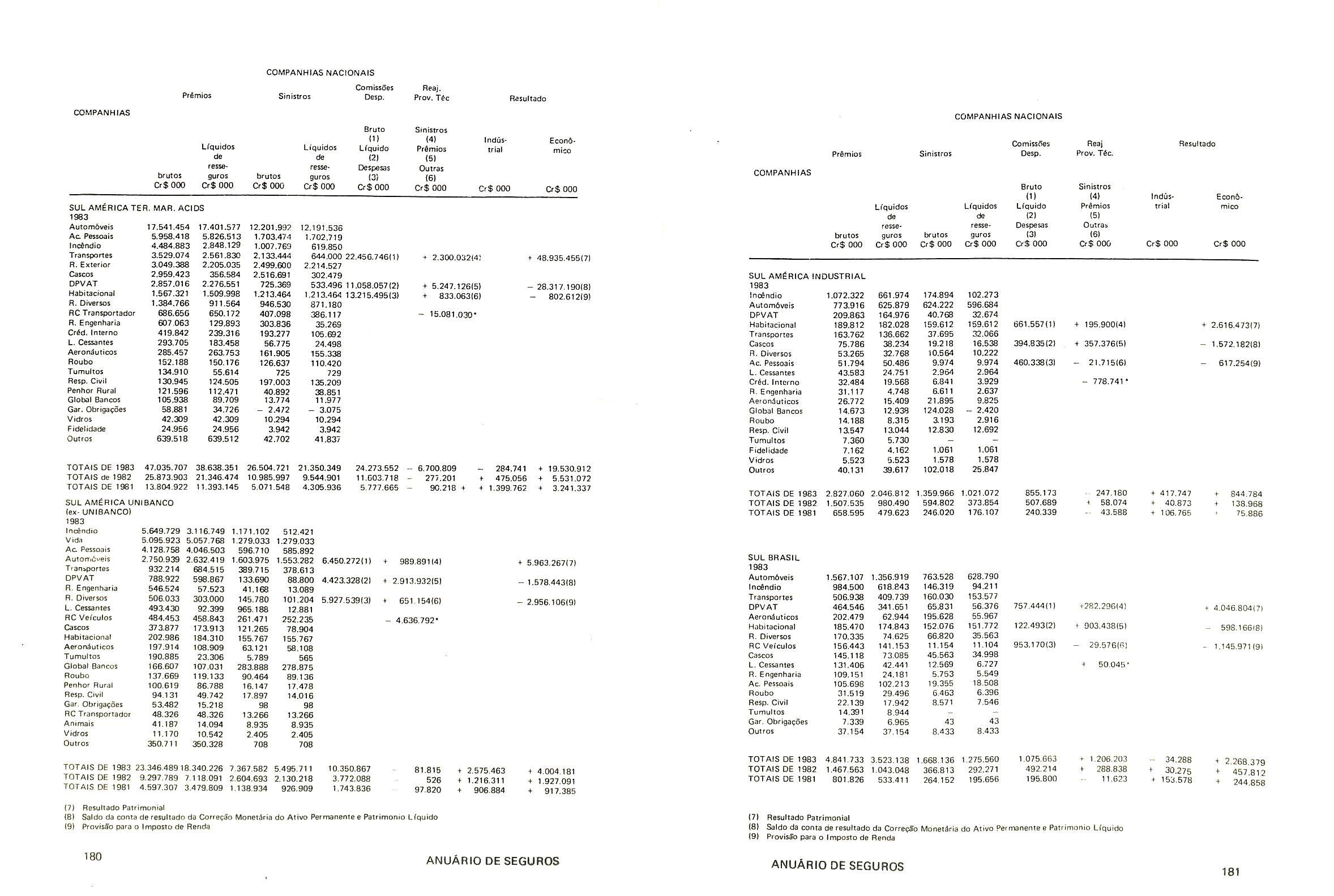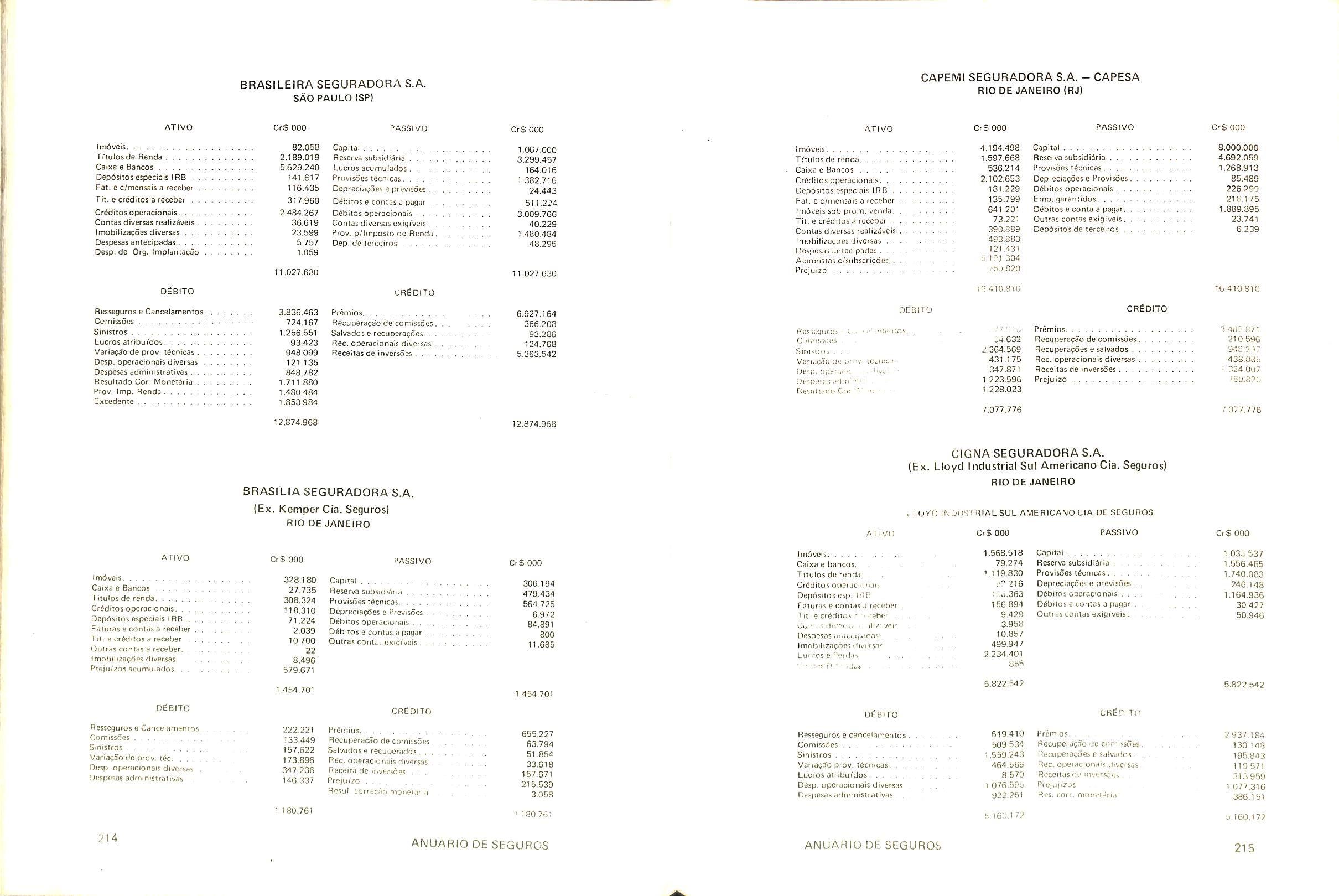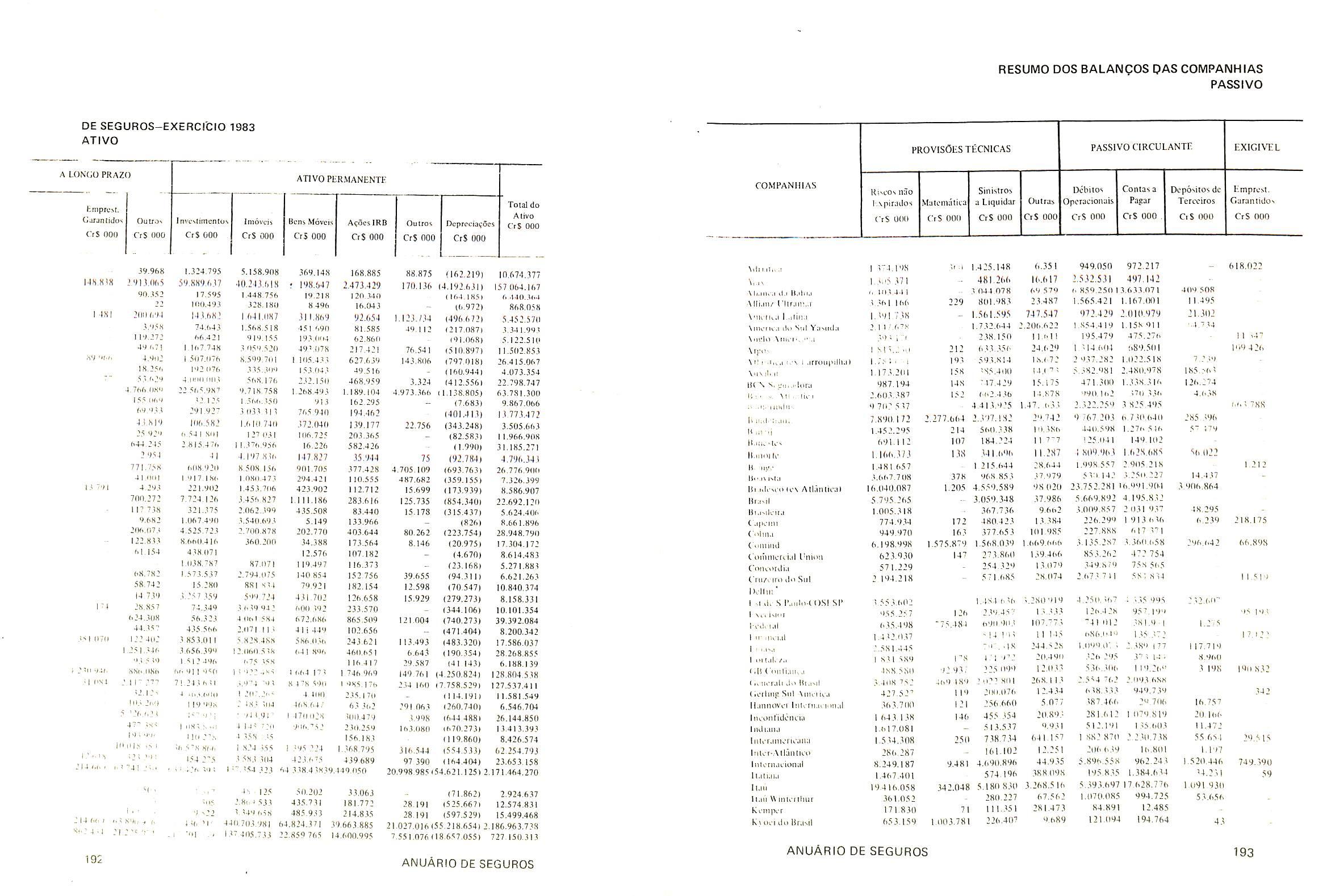 minagao em 02 oe margo de 1971,pela portaria 13 da SUSEP; autorizada a operar nos seguros do ramo Vida pela Carta Patente n' 495 de acordo com a portaria n' 11 da SUSEP, de 26/01/1982.Capital de Reserve: Cr$ 5.110.899.000,00.Produgao de premi□s cobrados em 1983: Cr$ 12.530.209.000.00.OPERA EM TOODS OS RAMOS DE SEGUROS.Diretor-Presiden te: Roberto Muniz Rondon jDiretor Superintendente:Adolpho Bertoche FiIhojDiretor Comercial:Dalvares Barros de Mattos;Diretores:Paulo Ber toche e Samuel Naschpitz.SUCURSAIS
