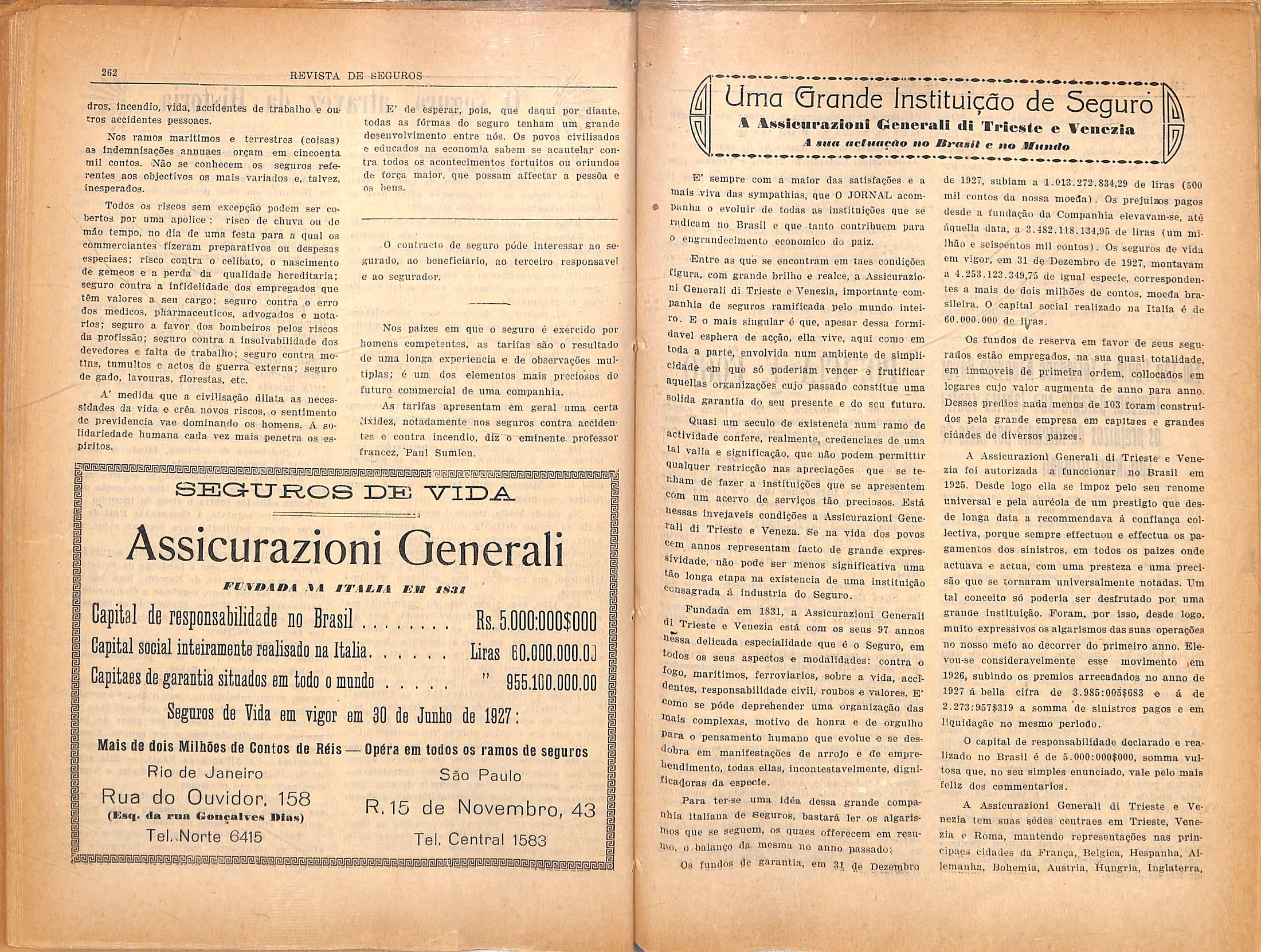 A Assicurazioni Generali di Trieste e Vene zia foi autorizada a funccionar no Brasil em 1925. Desde logo ella se impoz pelo seu renomo universal e pela aurdola de um prestiglo que des de longa data a recommendava A couflanga collectiva, porque sempre effectuou e effectua os pagamentos dos siuistros, em todos os paizes onde aetuava e actua, com uma presteza e uma preclsao que se lornaram unlversalmeute notadas. Um tal coiiceito so poderla ser deslrutado por uma grande iustltuigao. Foram, por isso, desde logo, multo expressivos osalgarlsmos dassuas oiieragoes no nosso melo ao decorrer do primelro anno. Elevi)u-se consideravelmeute esse movlmento ,em 1926, subludo os premios arrecadados no anno de 1927 A bella cifra de 3.985:005f683 « A de 2.273:9579319 a somma de siulsti-os pagos e em Itquldagac no mesmo periodo.