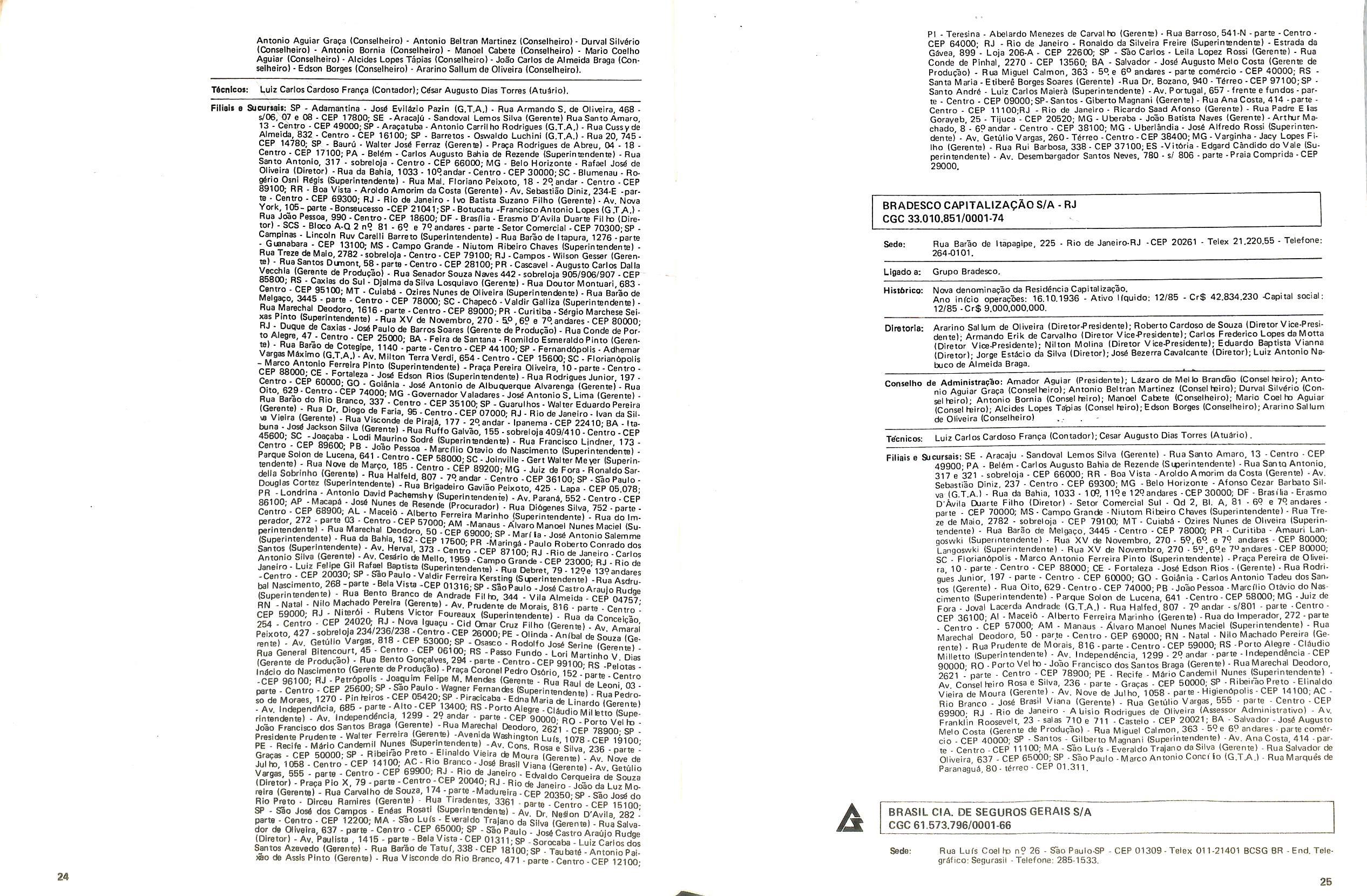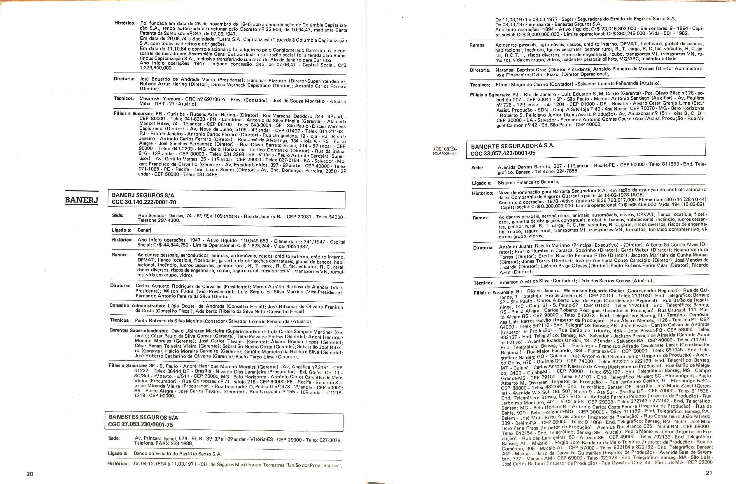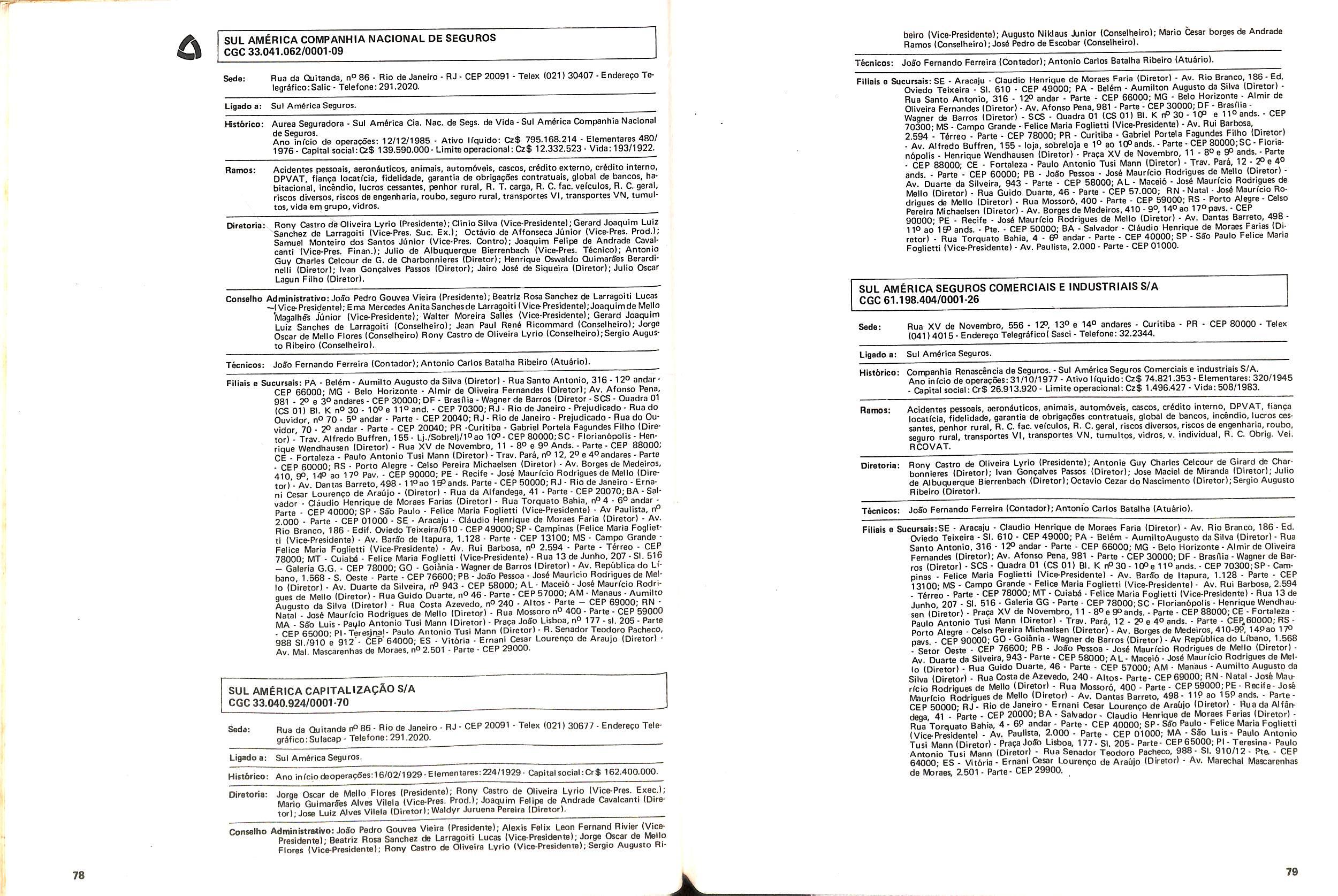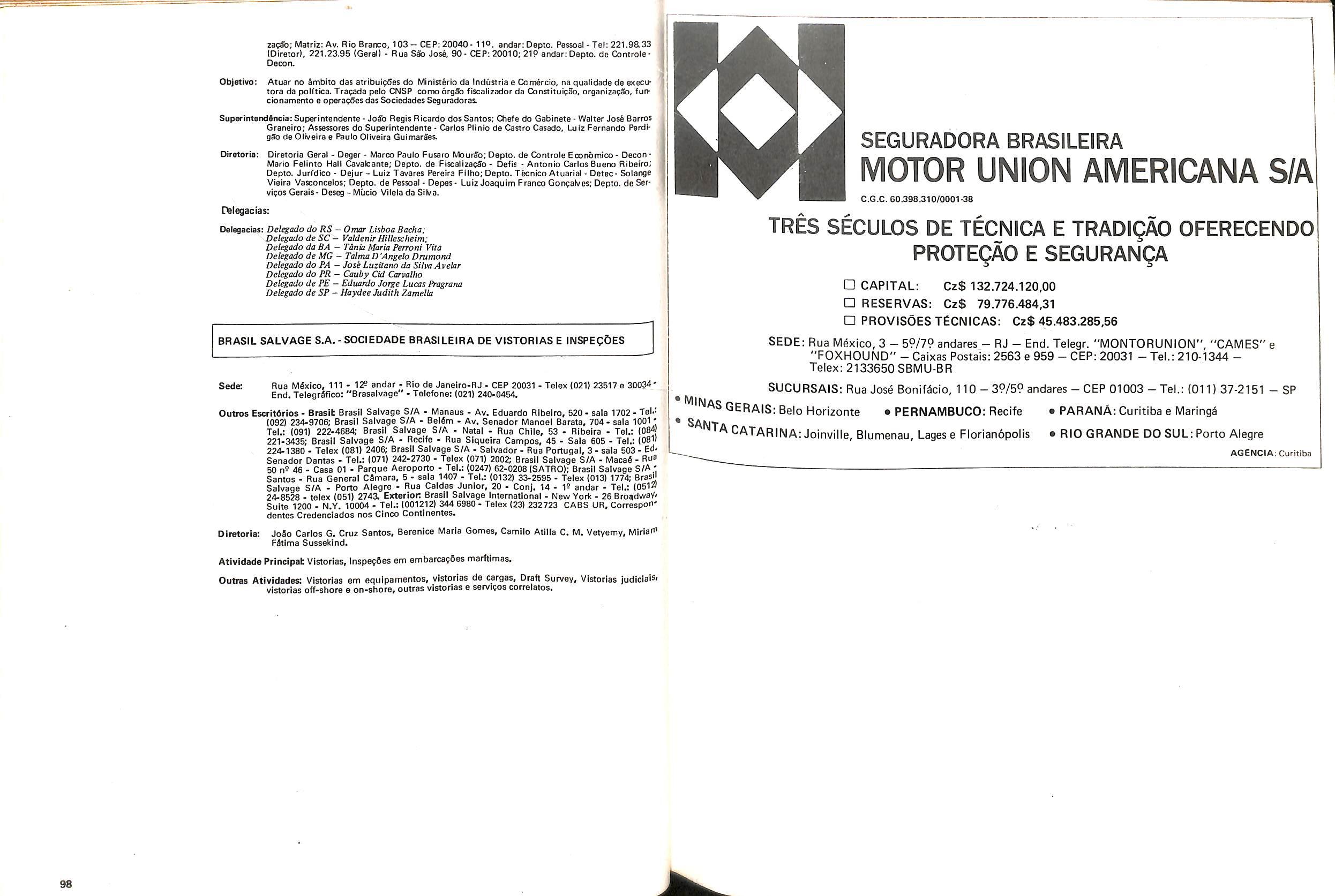 Filiais e Sucursais; AL • Maceib - Jose Maria Cavalcantl Silva (Gerente), Prapa dos Palmares, 36 — Edif. delmiro Gouveia - CEP 57.000; CE • Fortalezs - Francisco Almir Pinto ISupgrintendente), Rua GuiIherme Rocha, 253 CEP 60.000; ES • Vitbria • Daniel Martins (Gerente), Av. Princesa Isabel, 629 • 12) and. CJ. 1203 - CEP 29.000, Telex:(027)2286, End. telegrSfico: CADS BR; MG • Belo Horlzonte • Adeir Teixeira de Oliveira (Superlntendente), Av. Getulio Vargas, 668 89 and. CEP 30.000, Telex (031)1068, End. Telegrefico: CADS BR: PR • Curitiba - Norival Zambone Turola (Superintendente), Rua Comendador Araujo, 143 - s/60 e 65 - CEP 80.000 Telex:(041)2434, End. Telegrifico:CADS BR;SC • Joinville - Joao Hartin (Gerente), Rua Luis Niemeyer, 53 — s/7 e 8 - CEP 89.200;PE • Recife • Samuel Othon Ferraz Pimentel (Superinten dente), Rua Riachuelo, 105 - Cj. 218/222/223/225 • CEP 50.000, Telex:(081)1749, End. Telegrafico: CADS BR; RS - Porto Alegre • Rua 7 de Setembro, 722 • 6P and. Ed. City Banit CEP 90.0(X) Telex:(0512)26.9921: RJ - Rio de Janeiro (Massimo Dominici (Diretor) Av. Pres. Vargas. 463- 8° and. CEP 20.000(021)21520 End. TelegrSfico:CADS BR;PA • Beiem - EMBRASER - Emp. Bras. Serv. Rep. Ltda - Travessa 1? de Margo, 241 s/504 - Edif. Nuno Alvares CEP 66000; RS - Porto Alegre • AGENSEL - Agencia de Scguros Ltda - Rua General Vltorlno, 330 - 79and. CEP 90.000.
