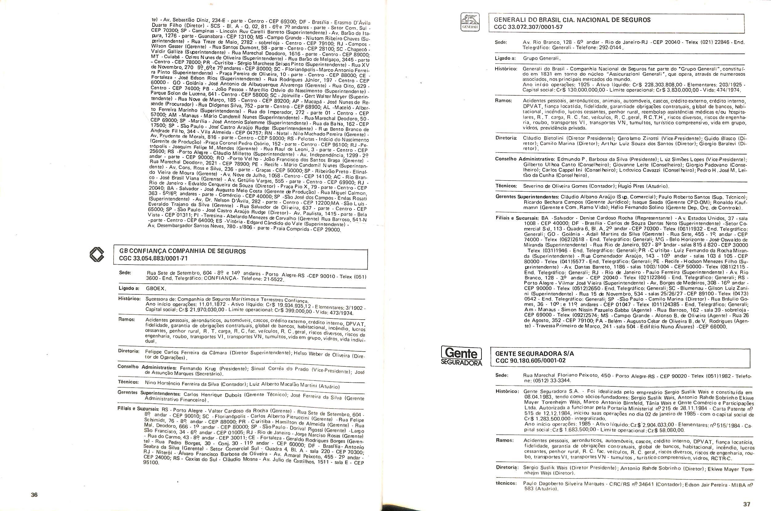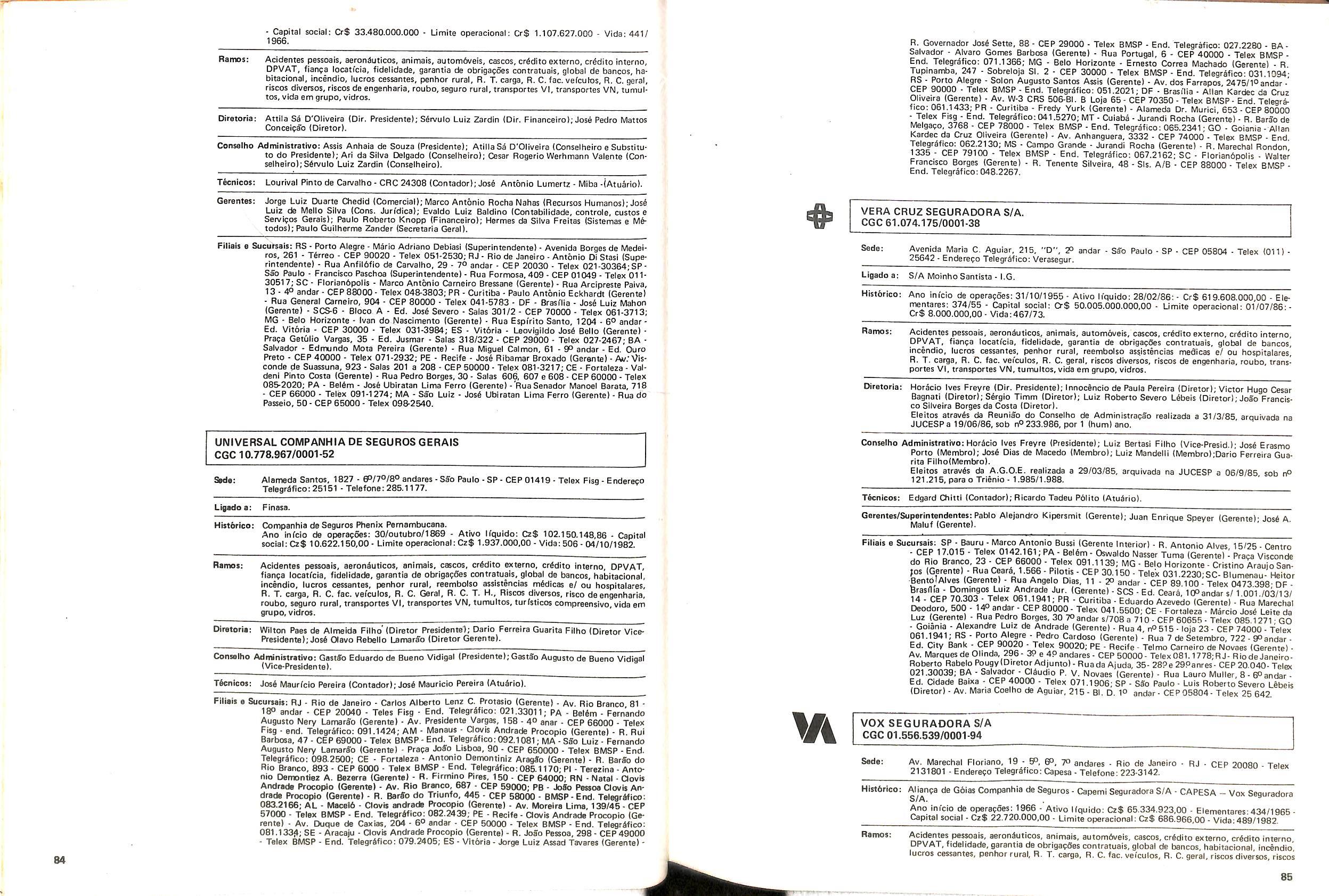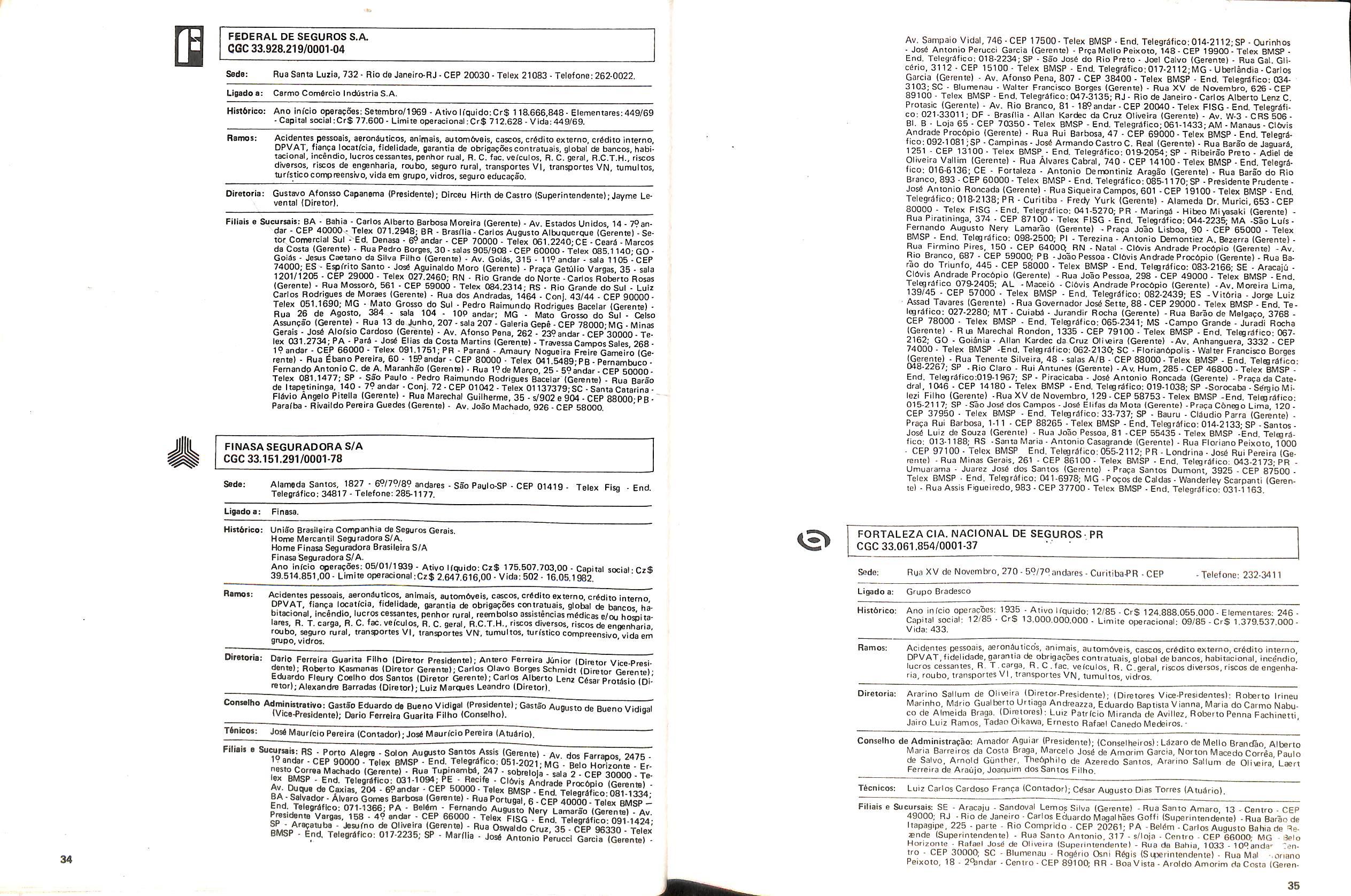 Filiais e Sucursais; AL • Maceib - Jose Maria Cavalcantl Silva (Gerente), Prapa dos Palmares, 36 — Edif. delmiro Gouveia - CEP 57.000; CE • Fortalezs - Francisco Almir Pinto ISupgrintendente), Rua GuiIherme Rocha, 253 CEP 60.000; ES • Vitbria • Daniel Martins (Gerente), Av. Princesa Isabel, 629 • 12) and. CJ. 1203 - CEP 29.000, Telex:(027)2286, End. telegrSfico: CADS BR; MG • Belo Horlzonte • Adeir Teixeira de Oliveira (Superlntendente), Av. Getulio Vargas, 668 89 and. CEP 30.000, Telex (031)1068, End. Telegrefico: CADS BR: PR • Curitiba - Norival Zambone Turola (Superintendente), Rua Comendador Araujo, 143 - s/60 e 65 - CEP 80.000 Telex:(041)2434, End. Telegrifico:CADS BR;SC • Joinville - Joao Hartin (Gerente), Rua Luis Niemeyer, 53 — s/7 e 8 - CEP 89.200;PE • Recife • Samuel Othon Ferraz Pimentel (Superinten dente), Rua Riachuelo, 105 - Cj. 218/222/223/225 • CEP 50.000, Telex:(081)1749, End. Telegrafico: CADS BR; RS - Porto Alegre • Rua 7 de Setembro, 722 • 6P and. Ed. City Banit CEP 90.0(X) Telex:(0512)26.9921: RJ - Rio de Janeiro (Massimo Dominici (Diretor) Av. Pres. Vargas. 463- 8° and. CEP 20.000(021)21520 End. TelegrSfico:CADS BR;PA • Beiem - EMBRASER - Emp. Bras. Serv. Rep. Ltda - Travessa 1? de Margo, 241 s/504 - Edif. Nuno Alvares CEP 66000; RS - Porto Alegre • AGENSEL - Agencia de Scguros Ltda - Rua General Vltorlno, 330 - 79and. CEP 90.000.
