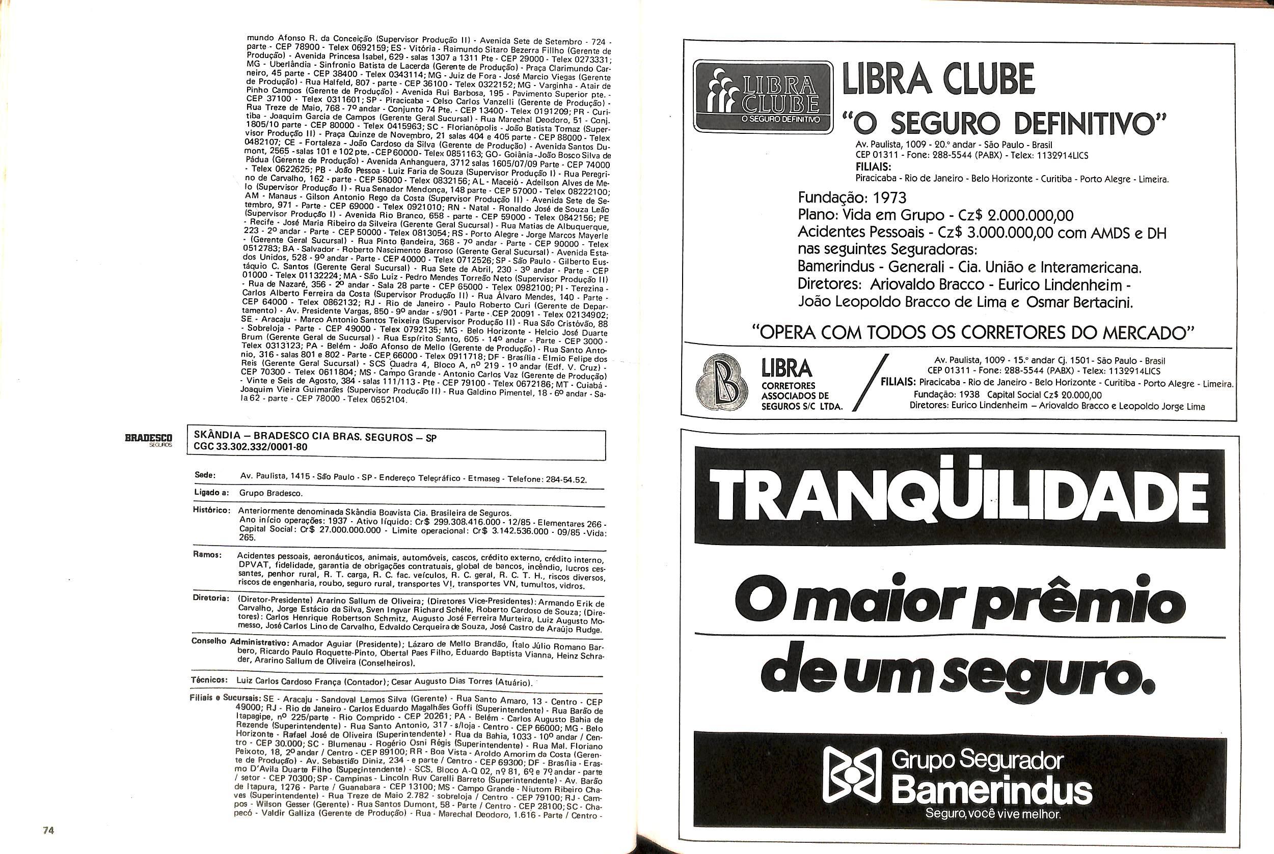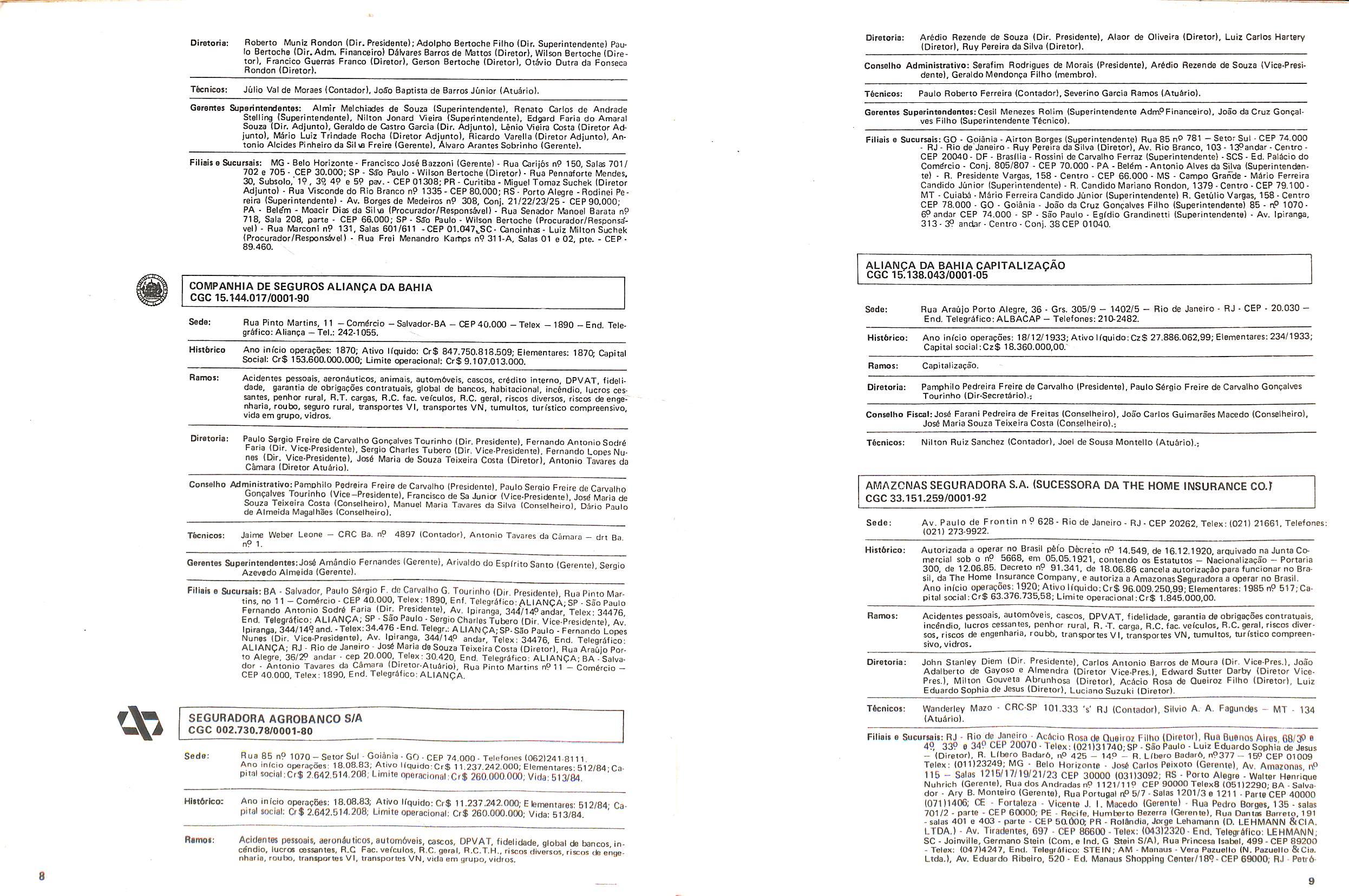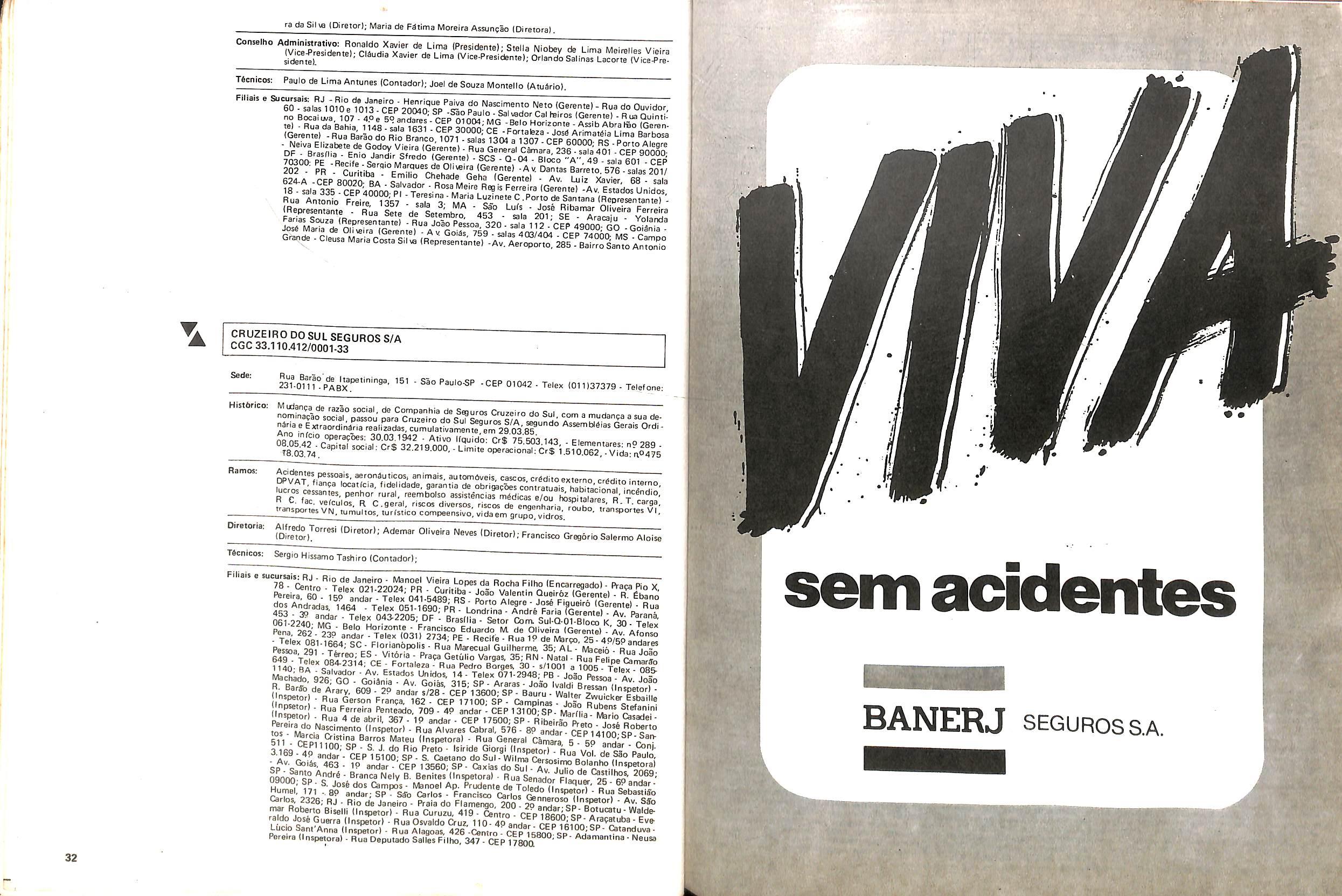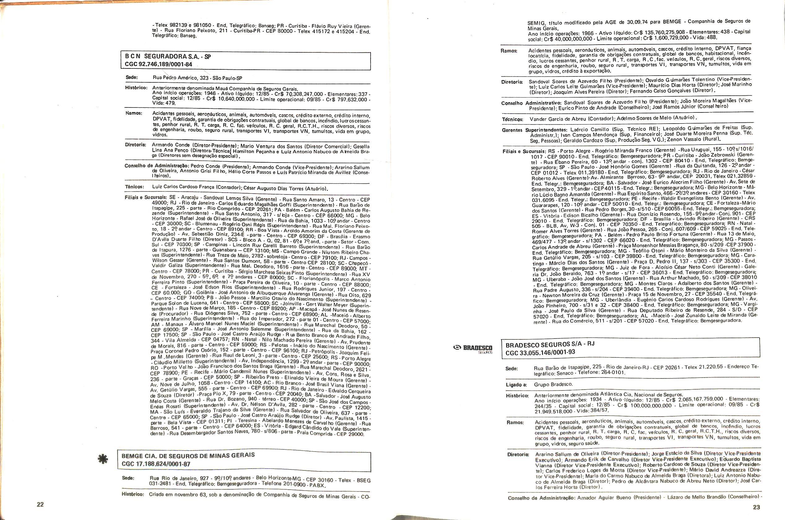 Filiais e Sucursais; AL • Maceib - Jose Maria Cavalcantl Silva (Gerente), Prapa dos Palmares, 36 — Edif. delmiro Gouveia - CEP 57.000; CE • Fortalezs - Francisco Almir Pinto ISupgrintendente), Rua GuiIherme Rocha, 253 CEP 60.000; ES • Vitbria • Daniel Martins (Gerente), Av. Princesa Isabel, 629 • 12) and. CJ. 1203 - CEP 29.000, Telex:(027)2286, End. telegrSfico: CADS BR; MG • Belo Horlzonte • Adeir Teixeira de Oliveira (Superlntendente), Av. Getulio Vargas, 668 89 and. CEP 30.000, Telex (031)1068, End. Telegrefico: CADS BR: PR • Curitiba - Norival Zambone Turola (Superintendente), Rua Comendador Araujo, 143 - s/60 e 65 - CEP 80.000 Telex:(041)2434, End. Telegrifico:CADS BR;SC • Joinville - Joao Hartin (Gerente), Rua Luis Niemeyer, 53 — s/7 e 8 - CEP 89.200;PE • Recife • Samuel Othon Ferraz Pimentel (Superinten dente), Rua Riachuelo, 105 - Cj. 218/222/223/225 • CEP 50.000, Telex:(081)1749, End. Telegrafico: CADS BR; RS - Porto Alegre • Rua 7 de Setembro, 722 • 6P and. Ed. City Banit CEP 90.0(X) Telex:(0512)26.9921: RJ - Rio de Janeiro (Massimo Dominici (Diretor) Av. Pres. Vargas. 463- 8° and. CEP 20.000(021)21520 End. TelegrSfico:CADS BR;PA • Beiem - EMBRASER - Emp. Bras. Serv. Rep. Ltda - Travessa 1? de Margo, 241 s/504 - Edif. Nuno Alvares CEP 66000; RS - Porto Alegre • AGENSEL - Agencia de Scguros Ltda - Rua General Vltorlno, 330 - 79and. CEP 90.000.