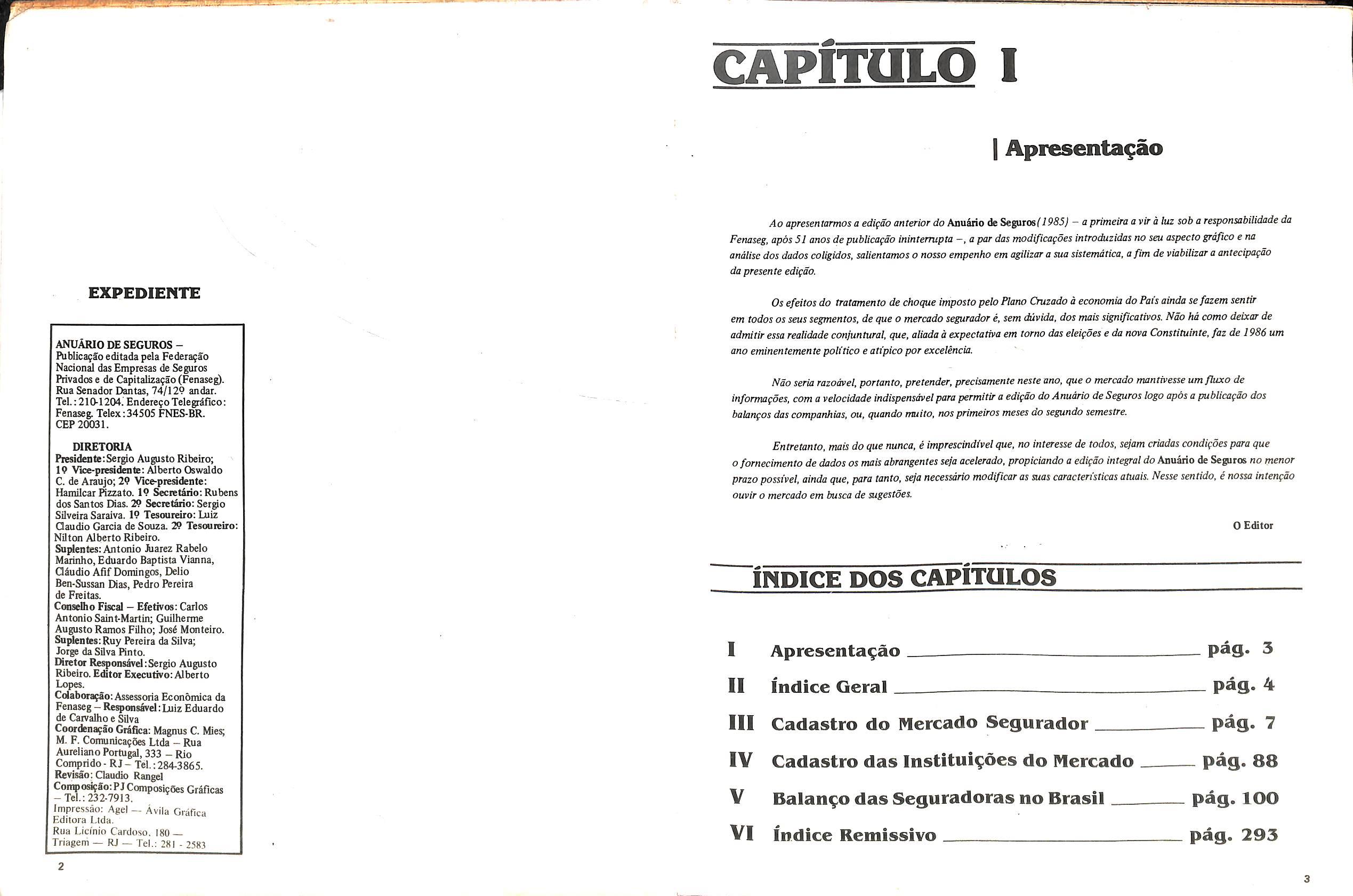 Ao apresentarmos a edifao anterior do Aouirio de Seguros/i955/ — aprimeiraavir a luz sob a responsabilidade da Fenaseg, apos 51 anas de publicafdo ininterrupta —,a par das modificagoes introduzidas no seu aspecto grdfico e na andlise dos dados coligidos, salientamos o nosso empenho em agilizar a sua sistemdrica, afim de viabilizar a antecipagdo da presente edigdo.