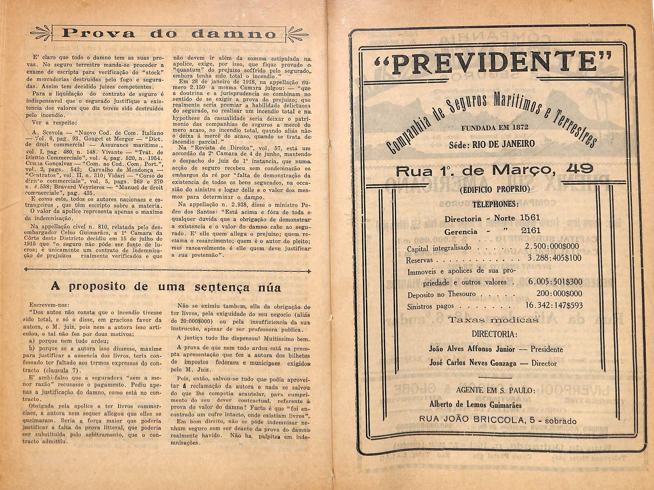 de abalisados autores nacionaes e estrangeiros, mas o que ja escrevemos e sufficiente para demonstr.ir que, quando data venia disssmos ao comegar este ligeiro e despretencioso commentario, escripto ao correr da penna, que a sentenga ora analysada, tinha se afa^'^do dos verdadeiros principios reguiadores da indemnisagao nos contratos de seguro, nao avangamos uma proposigao va e temararia, que nao poderia ser sustontada. Ao contrario, affirmamos principios universaes, geralmente admittidos e consagra dos nas legisiagoes dos povos cultos, os quaes sao no sentido de exigir qua se faga prova do damno effectivamente soffrido com o sinistro havido, para que se possa obter, com fundamento legitimo, a justa indemnisagao que o con trato respactivo assegura.