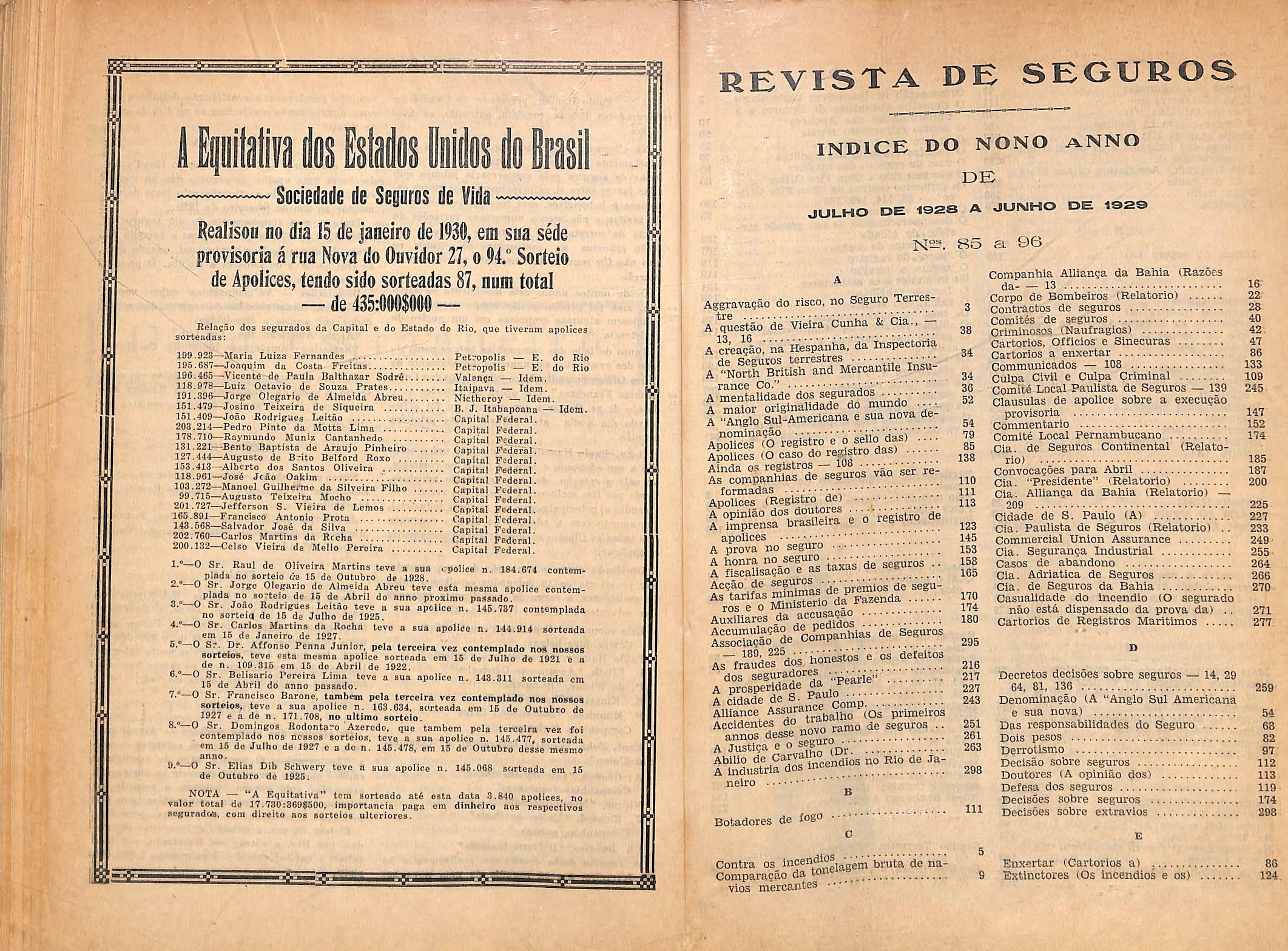 neiro B Botadores de fogo c Companhia AUianga da Bahia (Razoes da- -- 13 16Corpo de Bombeiros (Relatorio) 22Contractos de seguros 28 Comites de seguros 40 Oriminosos (Naufragios) 42. Cartorios, Officios e Sinecuras 47 Cartorios a enxertar 86 Communicados — 108 133 Culpa Civil e Culpa Criminal 109 Comite Local Paulista de Seguros — 139 245 • Clausulas de apolice sobre a execugao provisoria 147 Commentario 152 Comite Local Pernambucano 174 Cia. de Seguros Continental (Relato rio) 185 Convocaeoes para Abril 187 Cia. "Presidente" (Relatorio) 200 Cia. AlUanga da Bahia (Relatorio) 209 225 Cidade de S. Paulo (A) 227 Cia. Paulista de Seguros (Relatorio) .. 233 Commercial Union Assurance 249Cia. Seguran?a Industrial 255' Casos de abandono 264 Cia. Adriatica de Seguros 266 Cia. de Seguros da Bahia 270 Casuaiidade do incendio (O segurado nao esta dispensado da prova da) ., 271 Cartorios de Registros Maritimos 277. Contra os incendio Comparacao da ton vios mercantes Decretos decisoes sobre seguros — 14, 29 64, 81, 136 259 Denorainasao (A "Anglo Sul Americana e sua nova) 54 Das responsabilidades do Seguro 08 Dois pesos 82 Derrotlsmo 97" Decisao sobre seguros 112 Doutores (A opiniao dos) 113 Defesa dos seguros 119. Decisoes sobre seguros ; 174, iii- Decisoes sobre extravlos 298 E 5 Enxertar (Cartorios a) 86 9 Extinctores (Os Incendlos e os) 124.