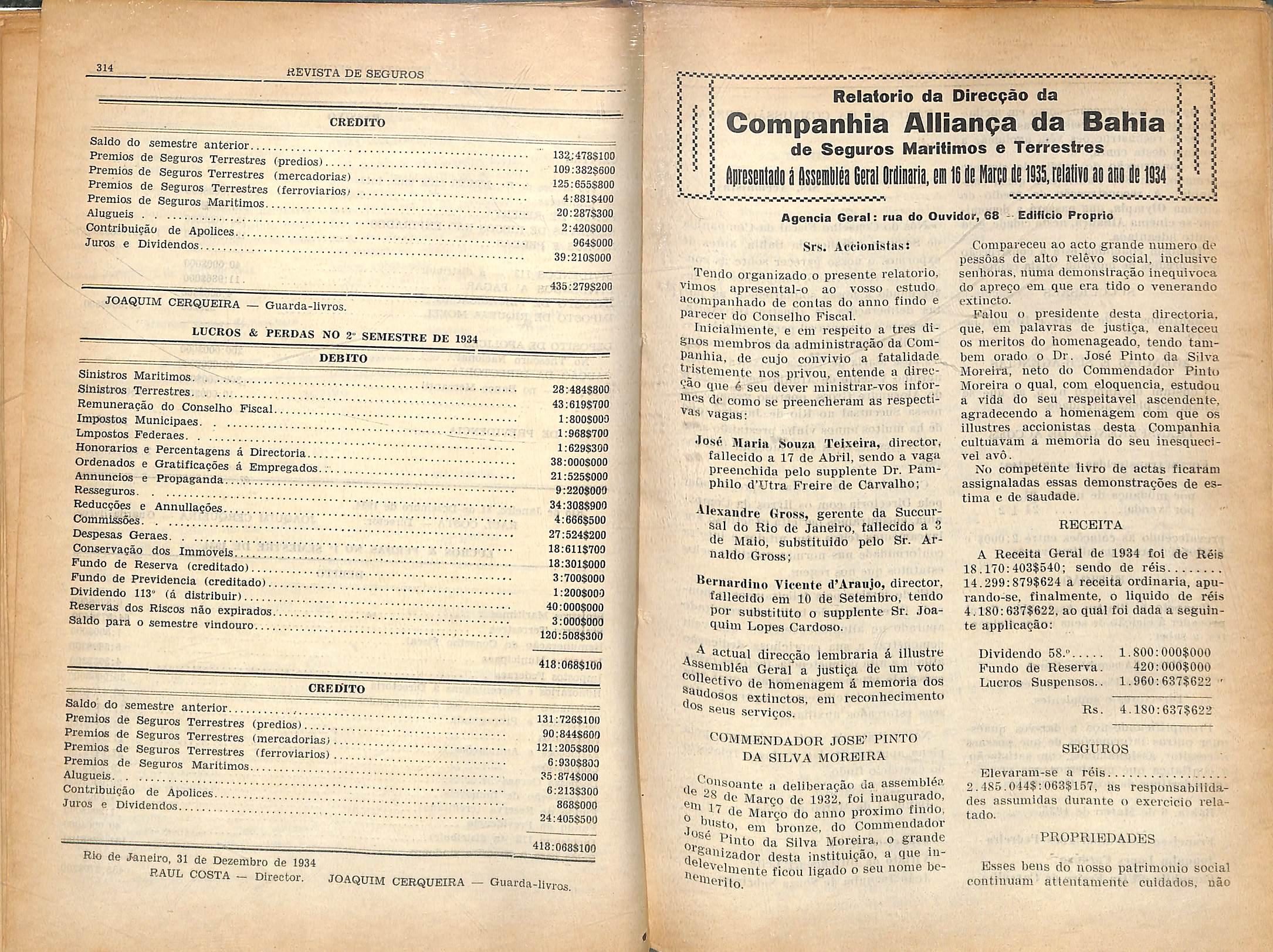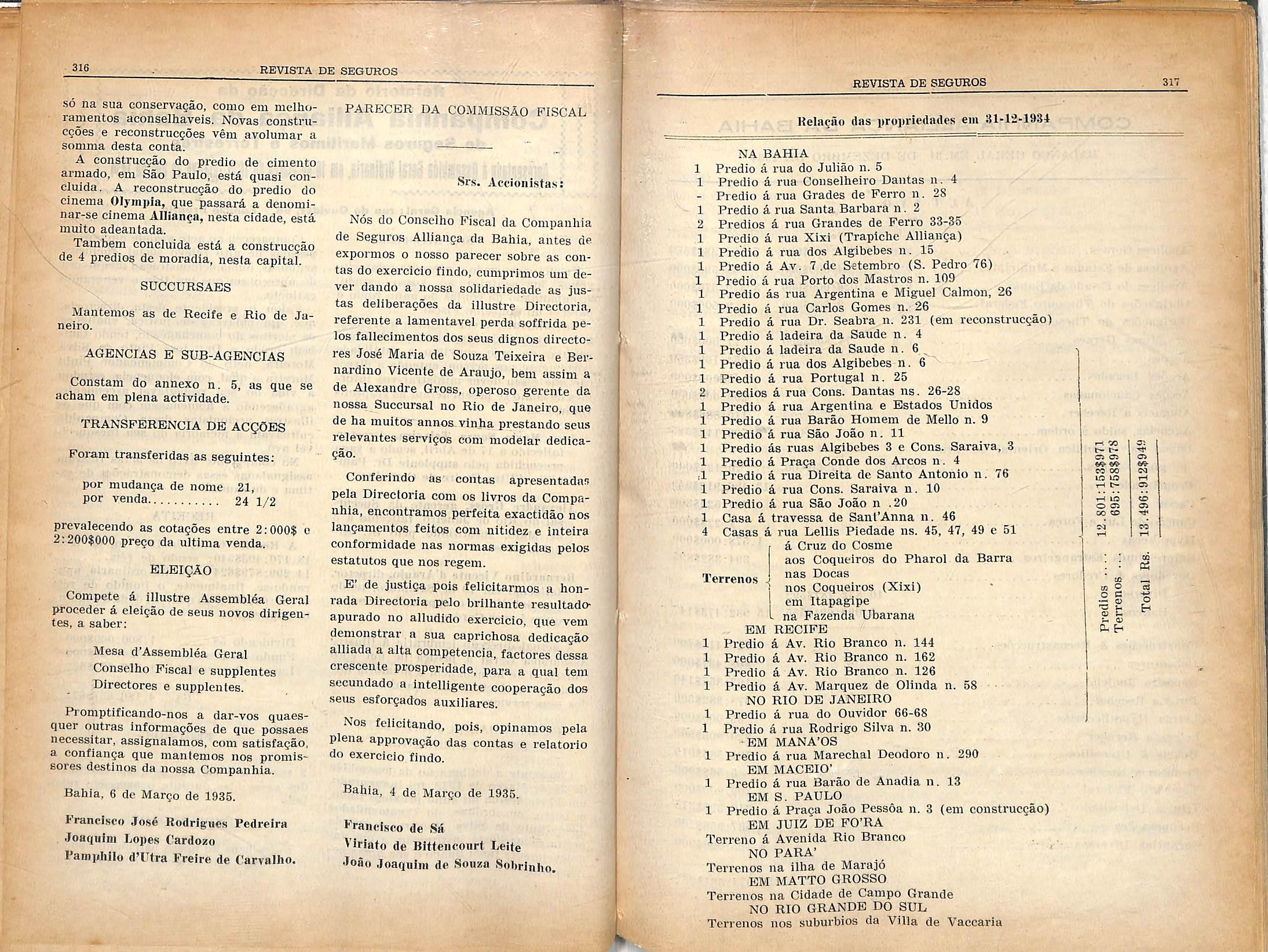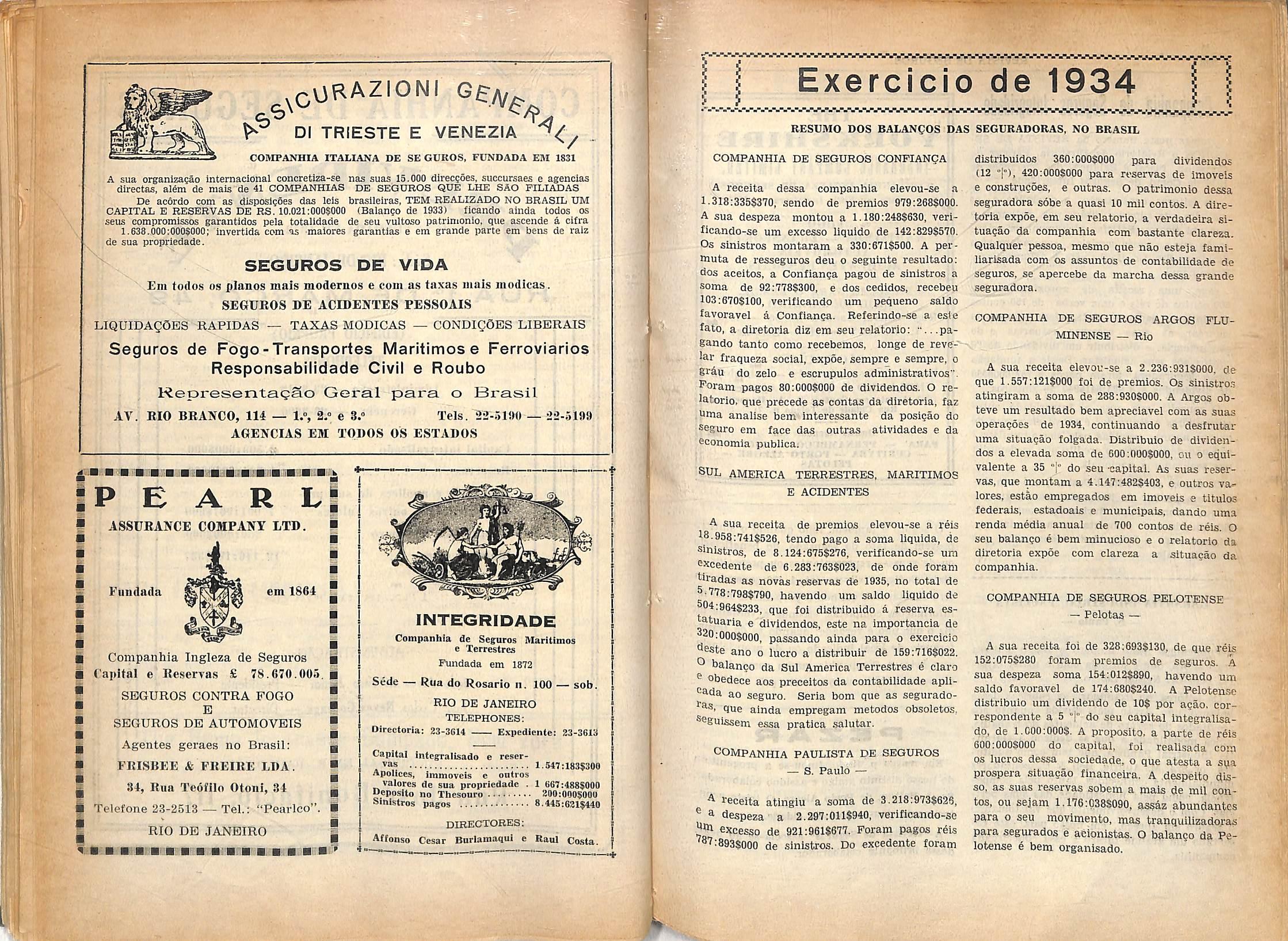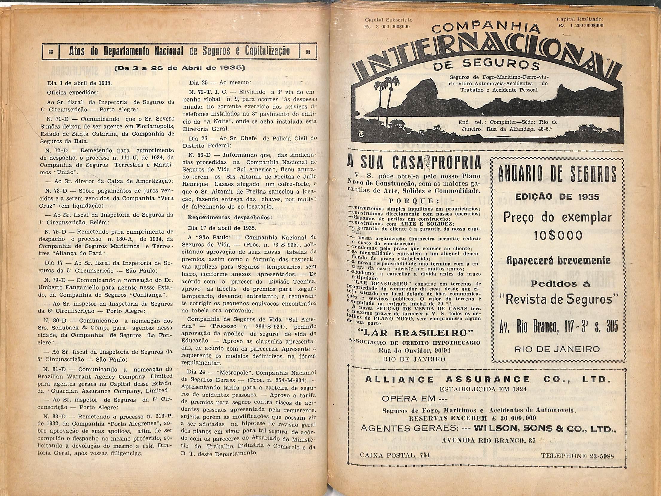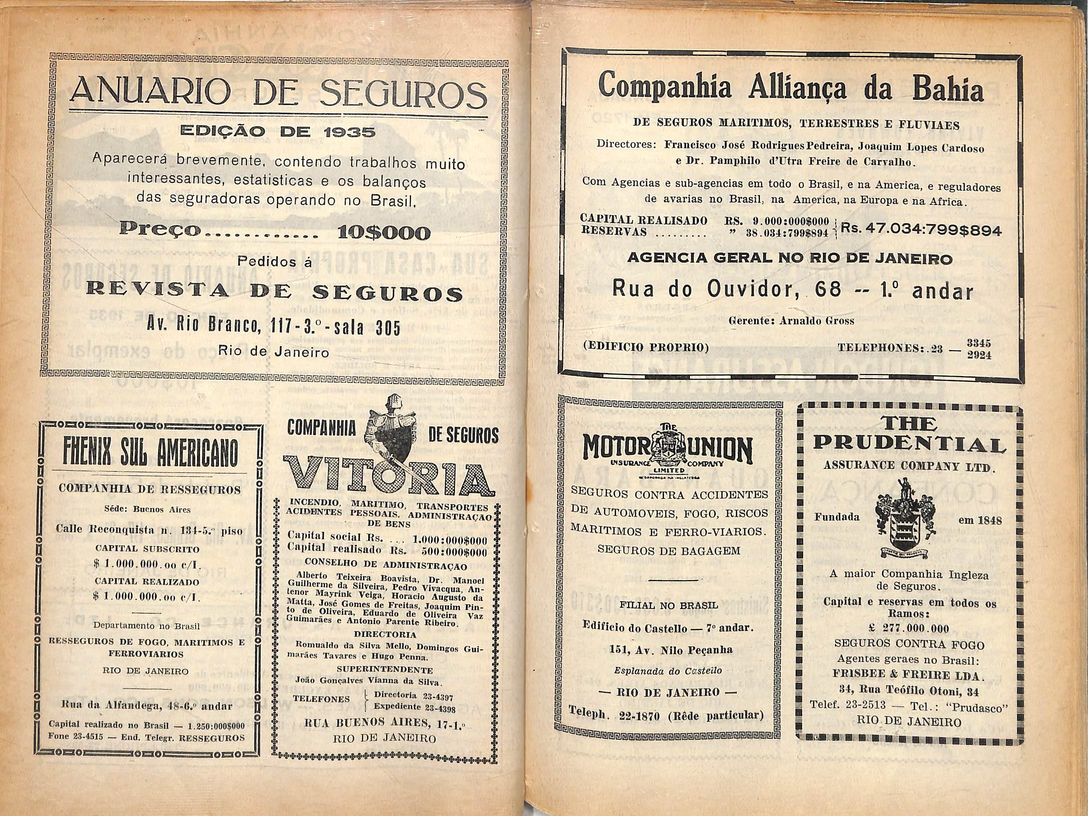 Represcntagao Geral no Brasil VIVIAN LOWNDES RIO DE JANEIRO RUA DA ALFANDEGA. 81-A—l." Andar Tel.: ZS-i'H AGENCIA GEO. WOOD S. PAUIiO" RUA BOA VTSTA. II 8.° andar, salas 1-5 Tel.: 2-0410 FUNDADA \ EM 1720 i ' I I AGENCIAS em: Bahia — Juiz de Fora — Pernambuco Rio Grande SEGUROS Incendio — Transporte em greral Bagagem de passagrelros LdNDON ASSURANCE Gompanhia de Seguros Marltlmos e Terrestres CONFIANCA FUNDADA EM 1872 Capital Integralizado 1.000:000$000 Deposito no Thesouro Naelonal 200:000$000 Apollces da Dlvida PubUca Federal 1.700:000$000 Reserves em 31 de Dezembro de 1934 741:2038570 Sinlstros pages at§ 31 de Dezembro de 1934 15.229:5878643 Dividendos dlstributdos (121) 4.083:0005000 DIRECTORIA: Cel. Carlos Leite Ribelro. Raymnndo Salgado Guimaraes. Jose Fedreira do Coiilto Ferraz. End. Telegraphico "Seguran^a" Telephones 23-3565 23-3965 RUA D'A ALFANDEGA, 49 (loja) Rio de Janeiro 5 C05rPA>'HIA DE SEGUROS Iguana BARA 5 Seguros contra os riscos de Incendio 5 e Transportes Capital integralizado Ks. l.«00:00(»$«00 FUNDADA EM 1903