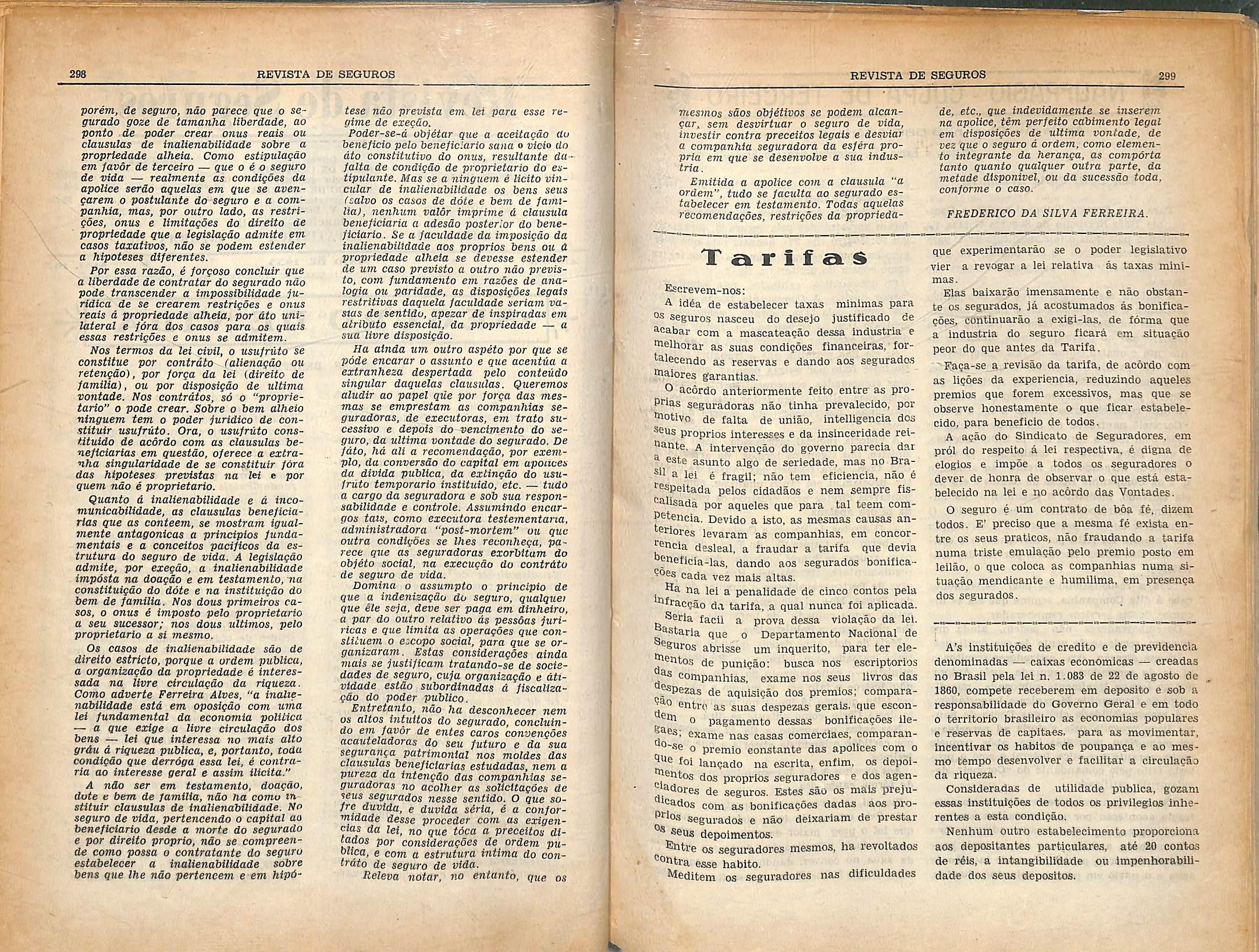 A idea de estabelecer taxas minimas para OS seguros nasceu do desejo justiflcado de acabar com a mascateacao dessa Industria e Welhorar as suas condigoes financeiras,'fortalecendo as reservas e dando aos segurados Waiores garantias.