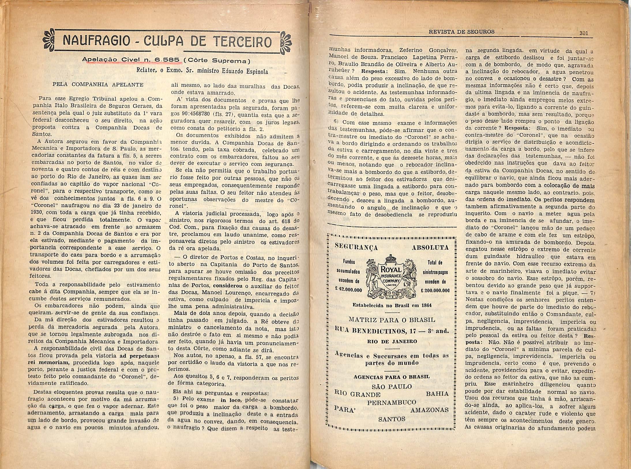 O caso desse naufragio foi objeto de uma decisao desta Corte Suprema. na acao de seguro movida por Carlos F. Oberlander con tra a seguradora do Corpo do navio. Alegava esta que a culpa cabia ao capitao do 'Coronel", mas o Tribunal decidlu: — exataments 0 contrario. Achou estar provada, que a faUa tinha sido dos estivadores do navio. Vide Arquivo Judieiario, vol. 17, pags. 88.