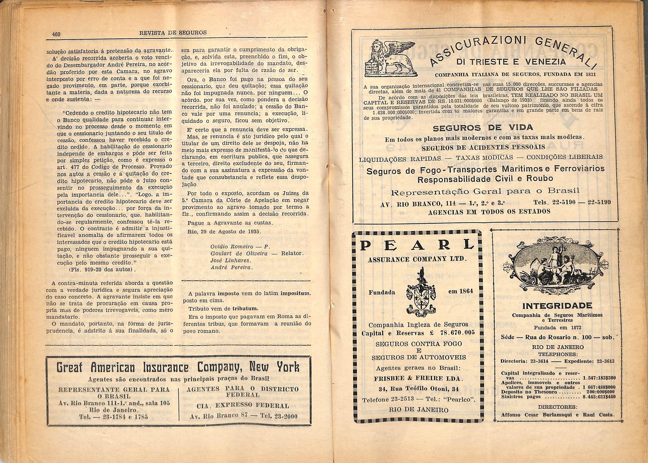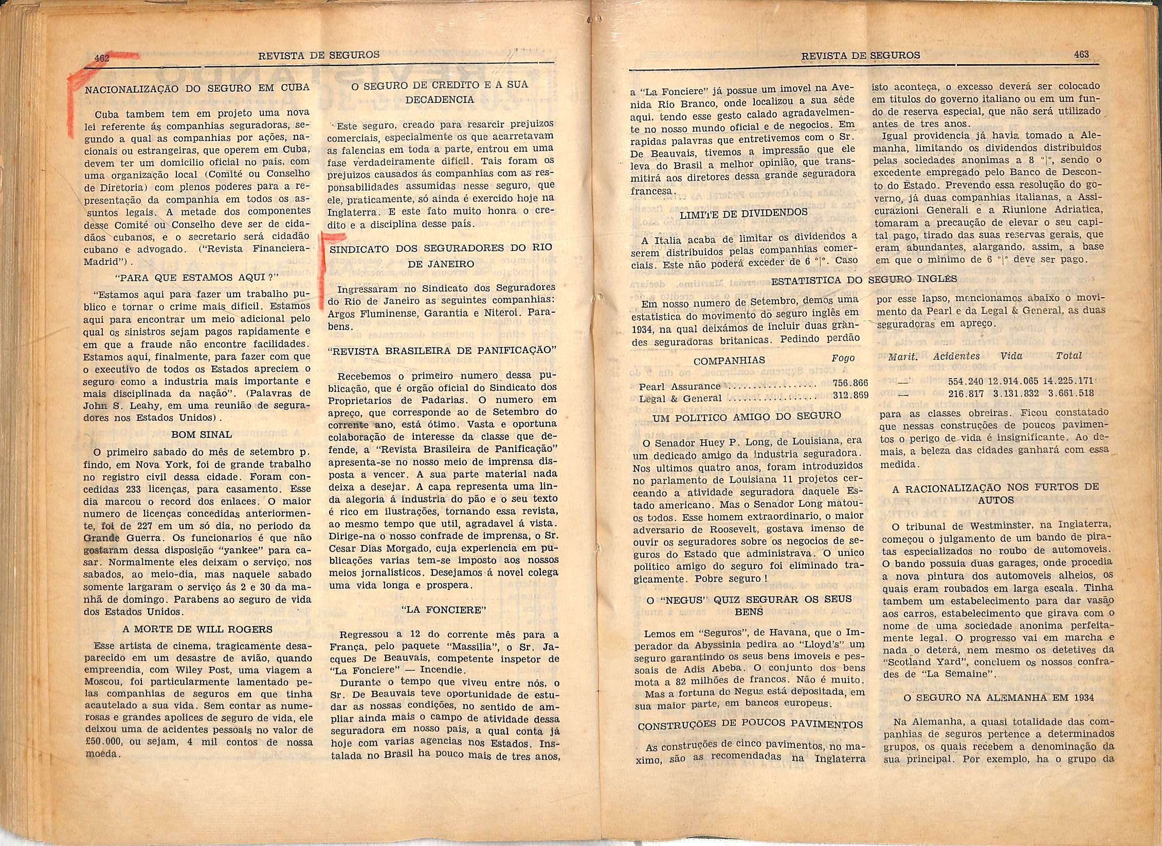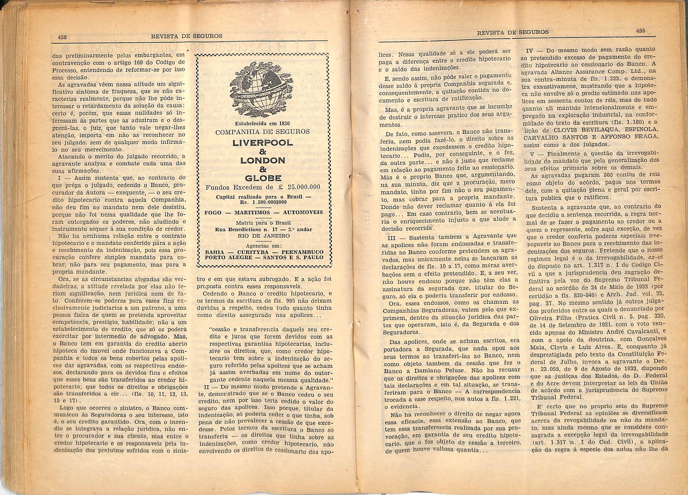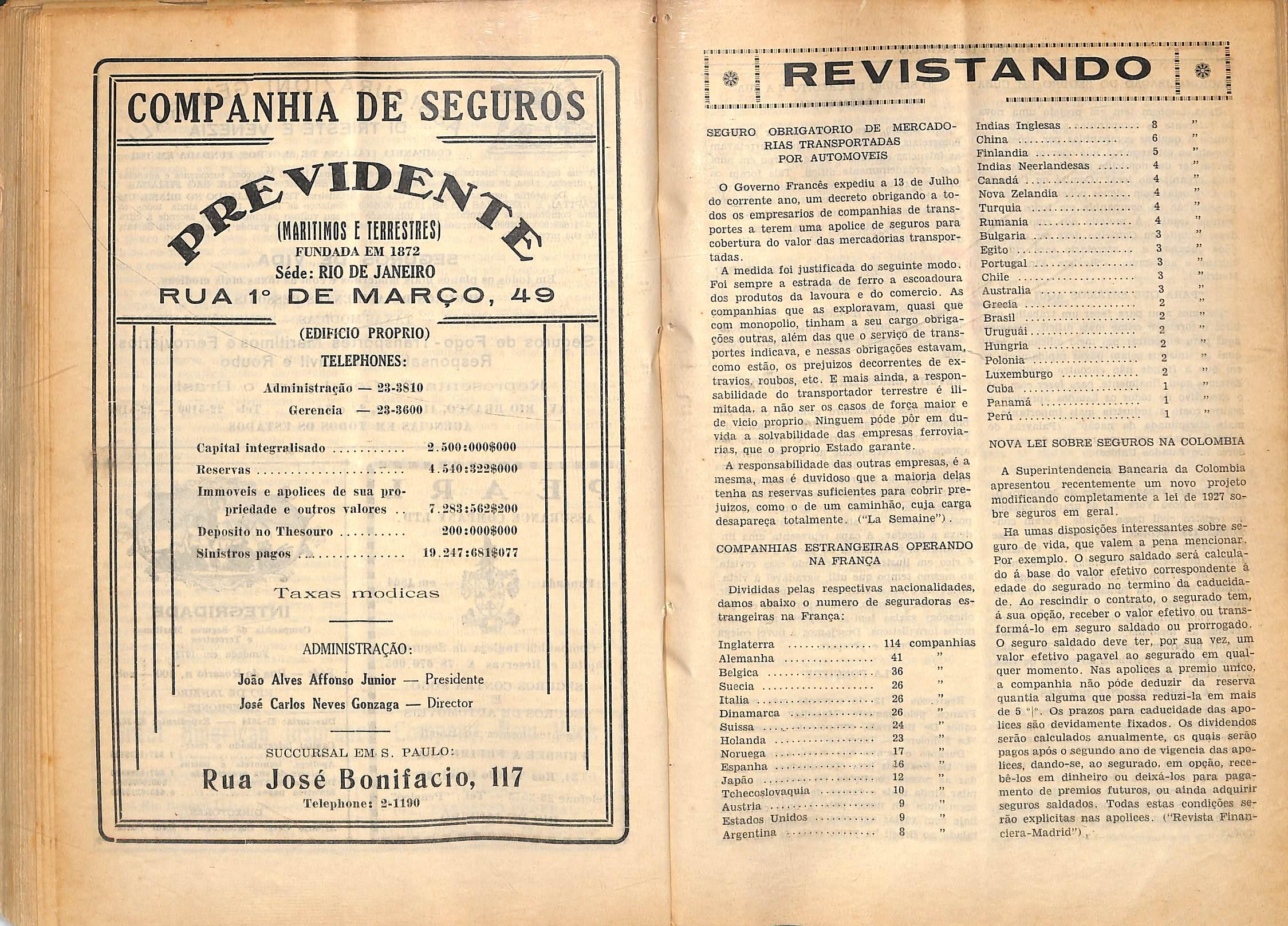 O seguro de vida no Brasil continua a evoluir. As companhias que aqui operam nesse ramo nao tiveram alterado o seu ritmo. A marcha que empreenderam prossegue, oferecendo aos previdentes a soma de beneficios que este Instituto faculta, As reformas oflciais inovadoras do meio ambienfce nacional nao foram entrave, como pareceu a prlmeira vista, ao surto ascencional do nosso fundamentado seguro de vida, calcado na experiencia de seculos de civllizacao.