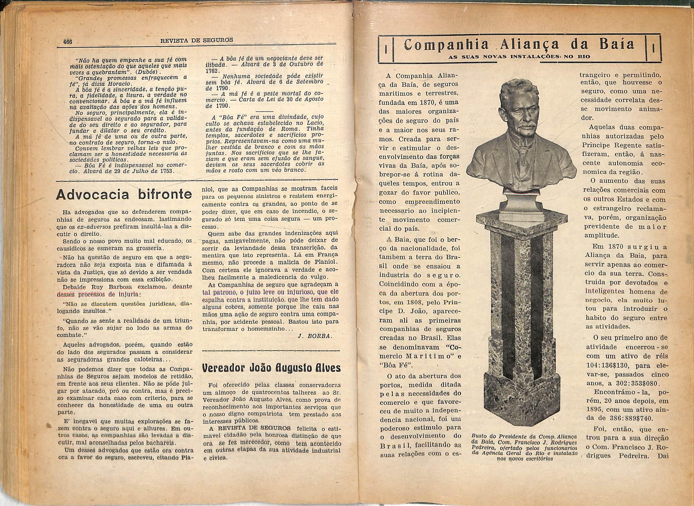 A Baia, que foi o berQo da nacionalidade, foi tambem a terra do Brasil onde se ensaiou a industria do seguro. Coincidindo com a epoca da abertura dos portos, em 1808, polo Prin cipe D. Joao, apareeeram all as primeiras companhias de seguros creadas no Brasil. Elas se denominavam "Comercio Maritime" e "Boa Fe".