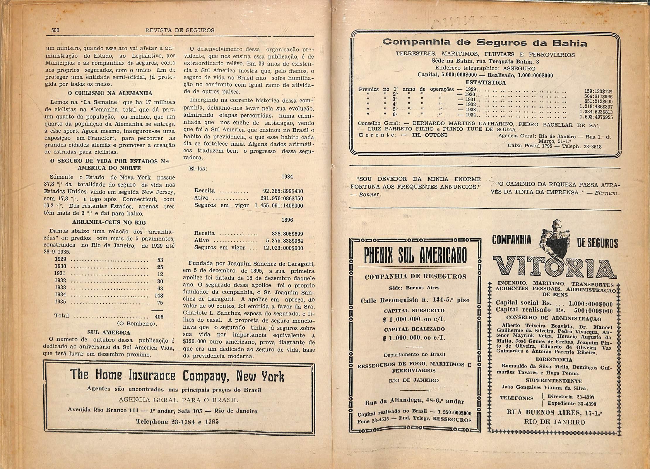 Imergindo na corrente historica dessa com-' panhia, deixamo-nos levar pela sua evolugao, admirando etapas percorridas, numa caminhada que nos enche de satisfa^ao, vendo que foi a Sul America que ensinou no Brasil o habito da previdencia, e que esse habito cada dia se fortalece mais. Alguns dados aritmeticos traduzem bem o progresso dessa seguradora.