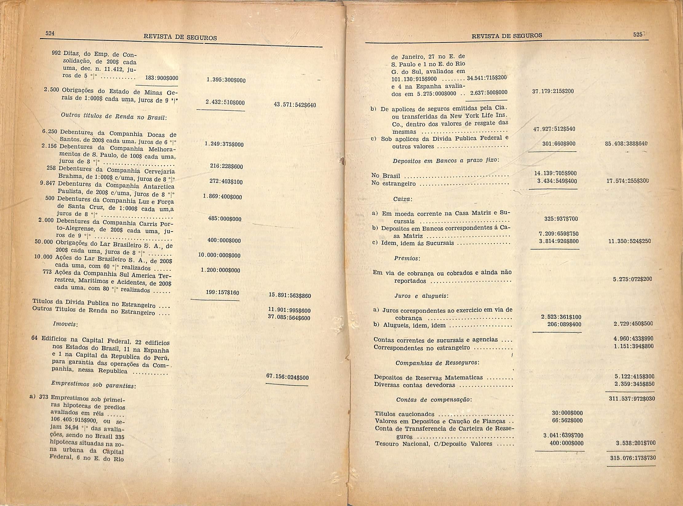 seguro em quasi todas as atividades. Foram pagos sinlstros no total de 1.366:029$602. As novas reservas legais alcangaram a soma de 830:730$844. O balango deixa um saldo liquido de 1.015;163$573, o qual foi aplicado em reservas diversas. Podendo ter distribuido dividendos, nao o fez. Os nossos aplausos.