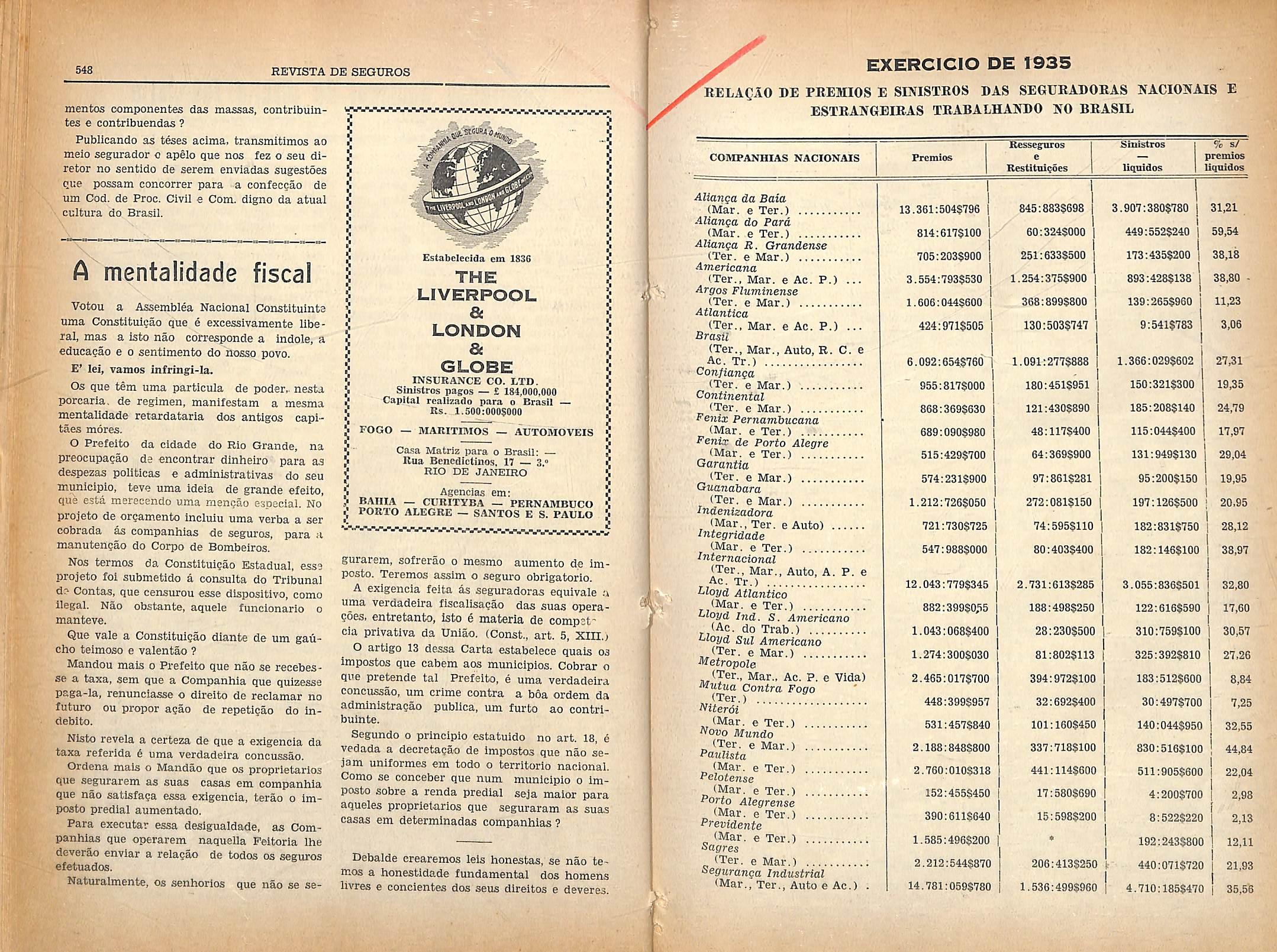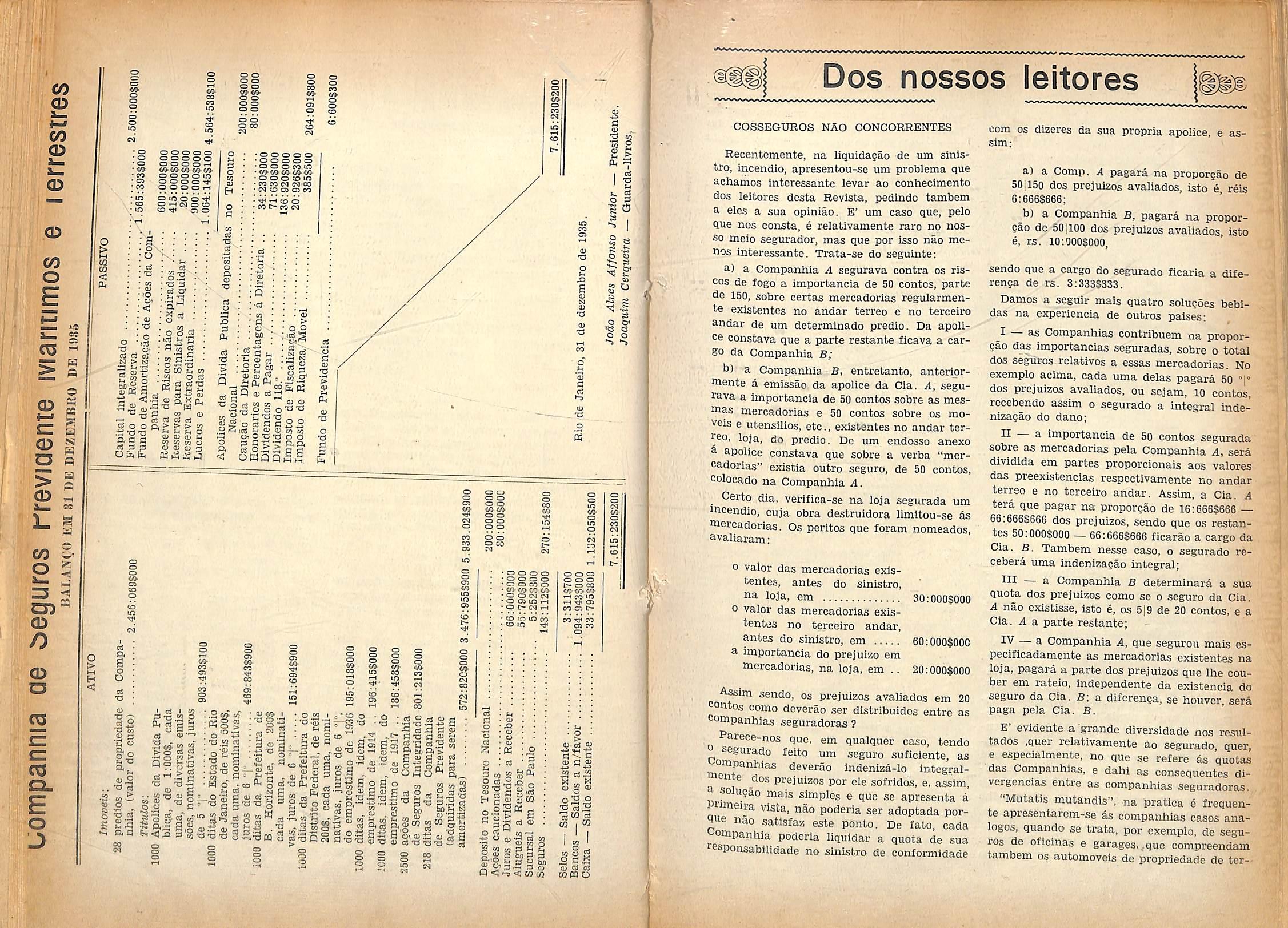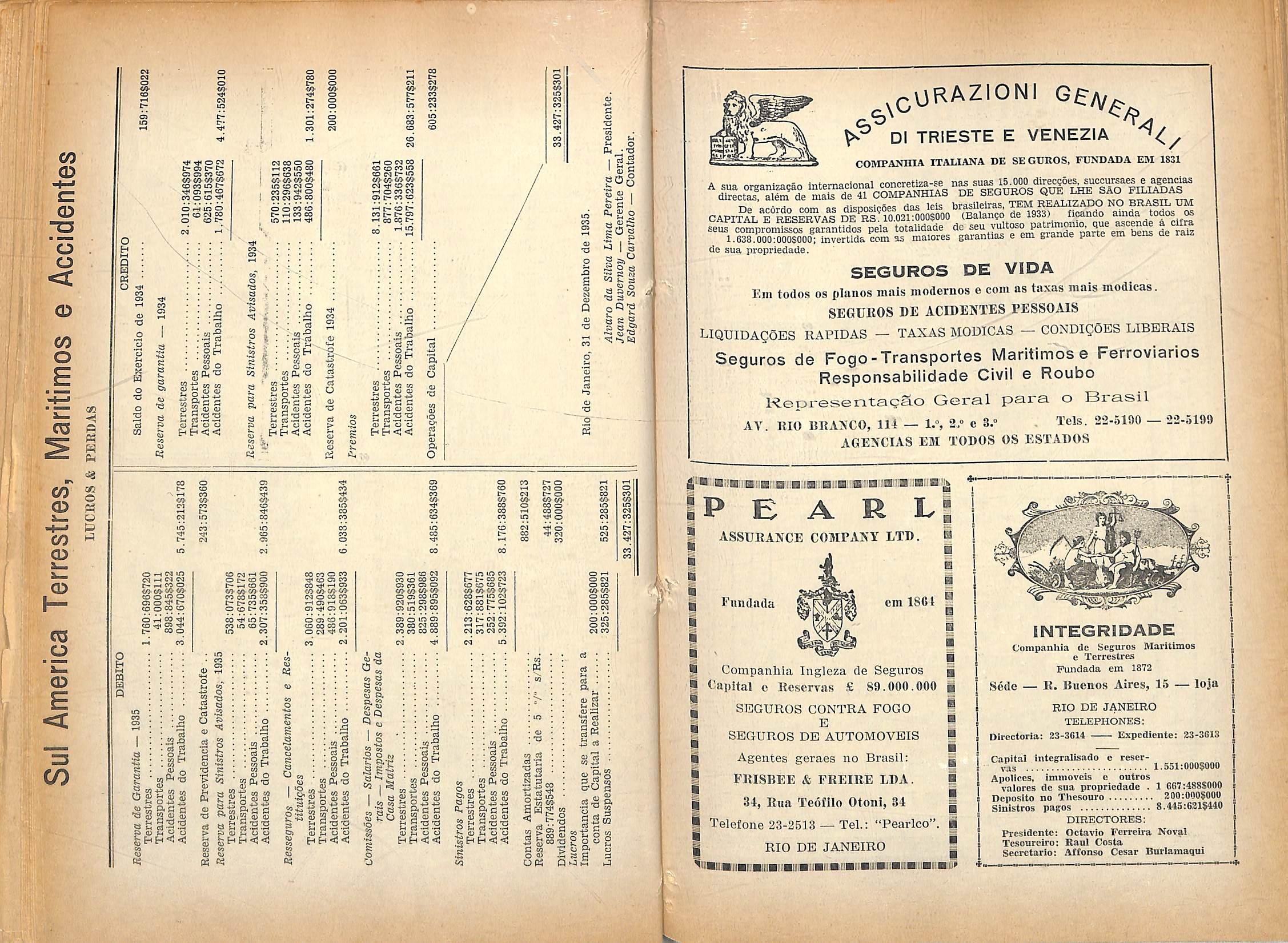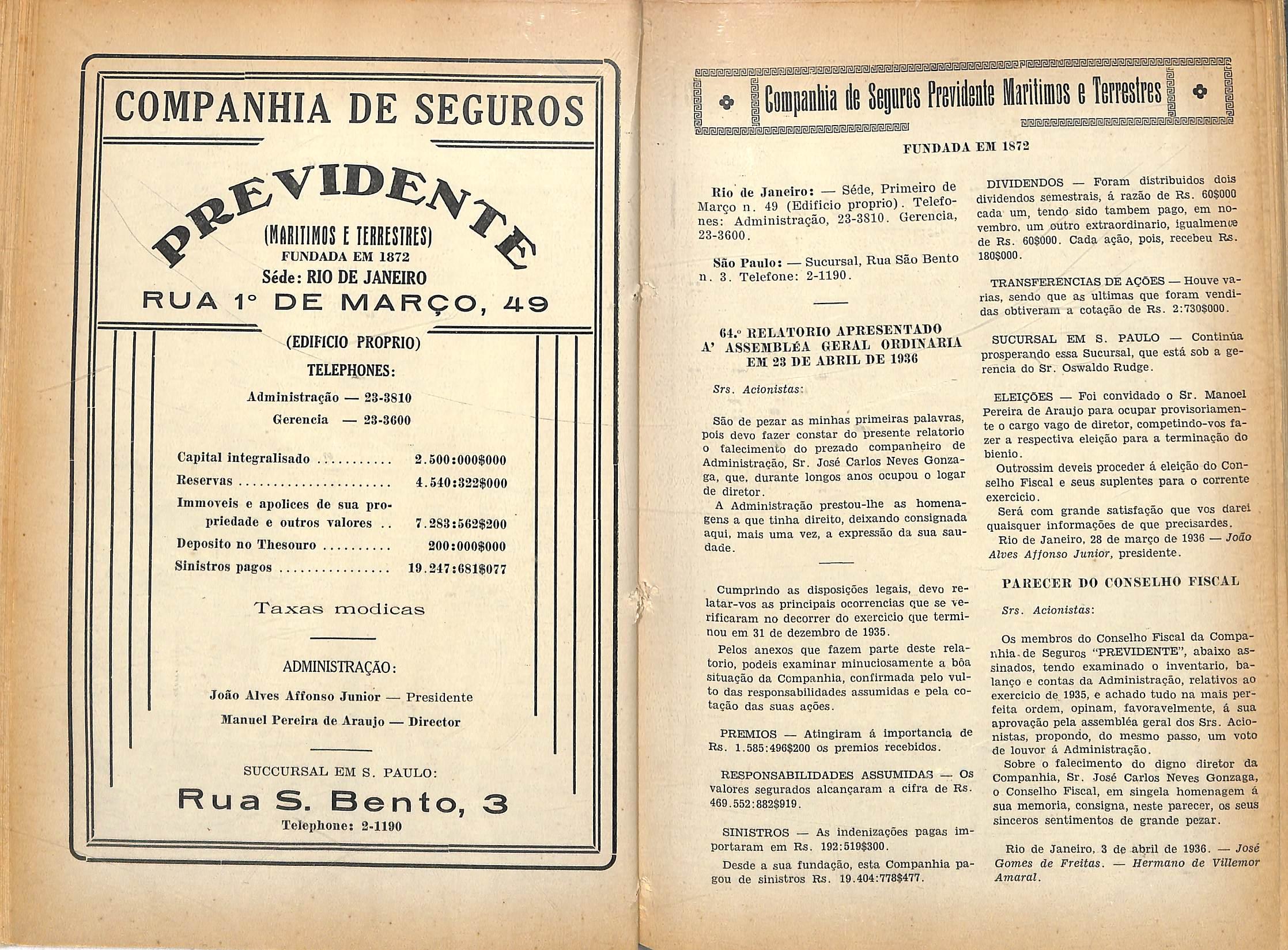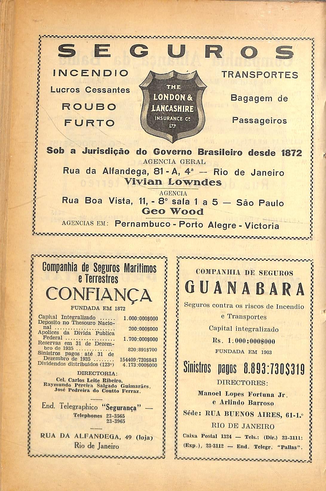 Segiiros contra os riscos FUNDADA EM 1872 Caplial Integrallzado 1.000:0005000 Deposito no Thesouro Nacionaj 200:0005000 Apoiices da Divlda Publica Federal 1.700;000$000 Reservas em 31 de Dezembro de 1935 820:8915700 Sinistros pagos at6 31 de Dezembro de 1935 154409:7205843 Dividendos distribuldos <123") 4.173:0005000 DIRECTORIA: Cel. Carlos Lcite Ribeiro. Raymundo Pcreiv.T Salgado Gulinaraes, Jose Pedreira do Coutto Ferraz, End. lelegraphico