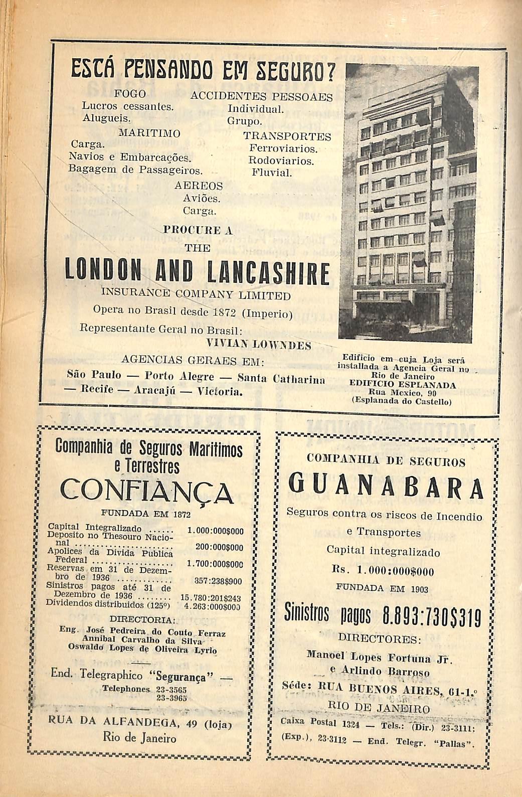 — End. Tclegr. RESSEGLROS onoes^gaaaoBOi .aopoc D o o n o o fl o Estabclecida em 1S36 ^ THE LIVERPOOL & LONDON & GLOBE INSURANCE CO. LTD. Sinlstros pages — £ 184,000,000 f. Capital realizado para o Brasil — ^ Rs. 1.500:0005000 > FOGO — MARITIMOS — AUTOMOVEIS «I Jl Casa Matriz para o Brasil:Rua