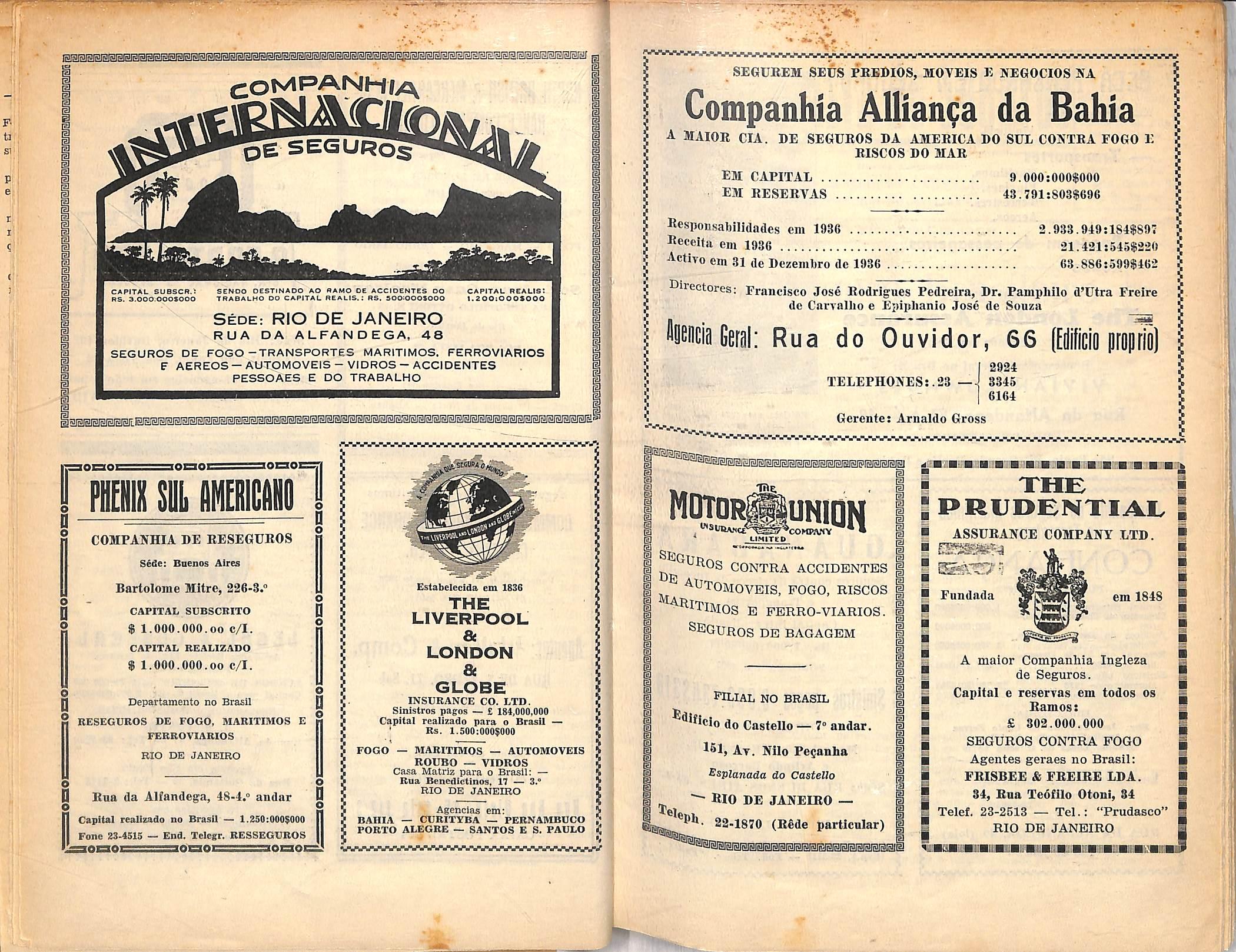 Seguros co PUNDADA EM 1872 Capital Integrallzado 1.000:000$000 Deposlto no Thesouro Nacional 200:0008000 Apolices da Divida Publlca Federal 1.700:0008000 Reservas em 31 de Dezembro de 1936 857:2388900 Sinistros pagos atd 31 de Dezembro de 1936 15.780:2018243 Divldendos distribuldos (125®) 4,263:0008000 DIRECTORIA: Eng. Jos6 Pcdreira do Conto Ferraz Annibal Carralho da Silva Oswaldo Lopes de Oliveira Lyrlo End. Telegraphico