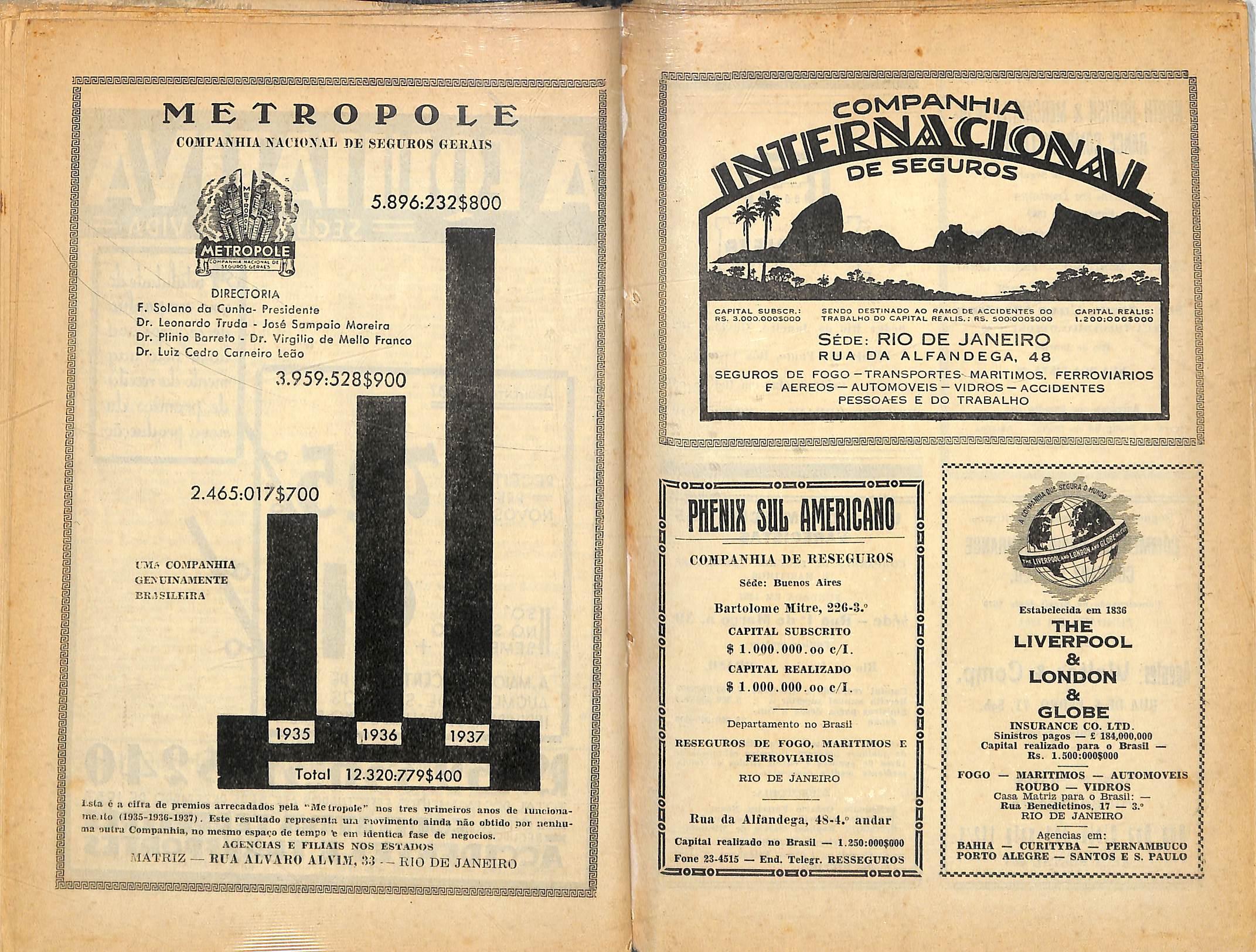 SUL AMERICA TERRESTRES, MARITIMOS E ACCIDENTE! ••O GE^4EQC A VAiOR COV.PANHiA NACIONAL DE 5EGUR05 % } QOADRO COMPARATIVO DOS PREMIOS DIREaOS DE SEGUROS TERRESTRES, MARITIMOS E ACCIDENTES, RECEBIDOS EH 1937, PELAS COHPANfflAS DE SEGUROS QUE OPERARAM NO BRASH Sul America Terreslres, MaTltlTDOs G Accldertcs 34JU:969>73& I NESTE GRAEICO AS COMPANRIAS ESTAO CLASSIFICADAS PELA REGEITA TOTAL DE PREMIOS TERRESTRES. MARITIMOS E ACCIDENTES I seeURANtA INOUSTCtlAL - l6.>92:S7e, ALLIANCA DA BAHIA - 113SS:S95> IHTERNACIONAL DE SE8UR0S - 14.40«;5I6. 109 e<>9, - FEOIX SUO AMERICANO 134 934. - UNIlIO FLUMIHENU « W904, - COOP DOS PROPRimWOS DC HOTEIS \ IM49S, - ODK DOS PROPRIETARIOS OE PADARIAS DO RIO JANEIRO 140 709, - FROTETDRA ISO:771. - NORU OEUTSCHE ITS 108, - IHD09TIBAIS EM CALCADOS E COUAOS tscasf. - MusnsMS mmficacAi e owFeirAfMAs de s. paulo I94«I9« - DOMCWIAHTES ATACADISTAS 00 R. DC JANEIRO ZIS^TB, - UHIAD DOS PItOPRIETAnOS DE MARCEHAAUS aSS:603i - SUE BRASIL ass.ag4, - AU.IAHCA K MINAS 9ERAIS 3I2:S90, - VICTORIA S1S.-9«0| - RW ORANOENSe MCBIt, - PHEWX OE PORTO ALECRC SZKSSO, - SIWMCATO DOS LOJISTAS s*rssi| • PEEOTENSE AOSTOT, - CONSTRUTORES QVIS 4401792, - AtUTOO CONTRA POOD 4SESM, - rONQ^RE SOZlOSe,
