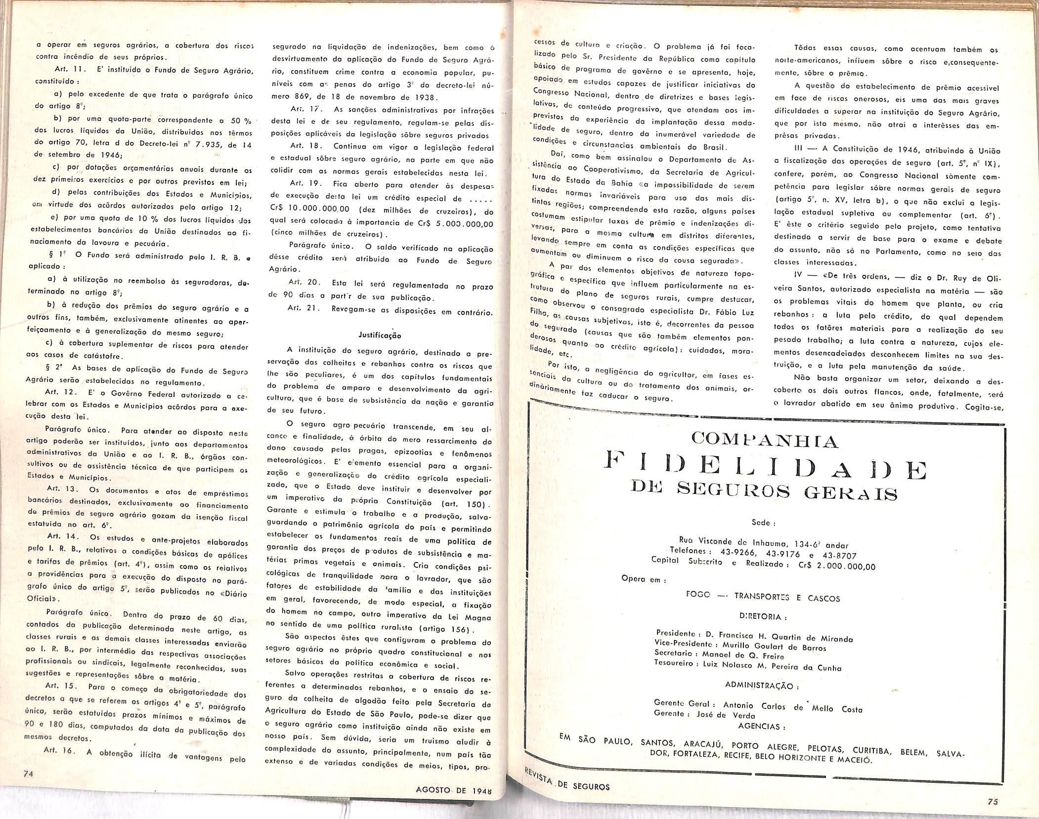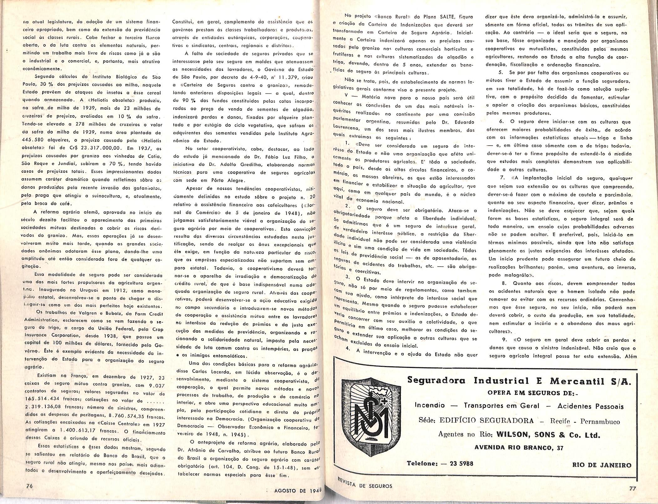 Po' inicioliva do Senodor Atlillo Vivacqua, o je9"ro ogrorio enlrou nos cogilasoes do legislalivo, eons'iluindo projolo em via de discustSo. No CQso de joncionodo, como de esperar-te, noo 9aificQ que ^ seguro agrodo desde logo se ImP le entre nos, porem que o Brasil pasiofo a preo^ como providencla inadiovel, preen® deslo sorle umo locuna inodmissivel em pois ImeWe agritolo, e ossim sonora umo loiho imperdoavel f ^ • c assunto de polpiionte oluolidade, porolelo