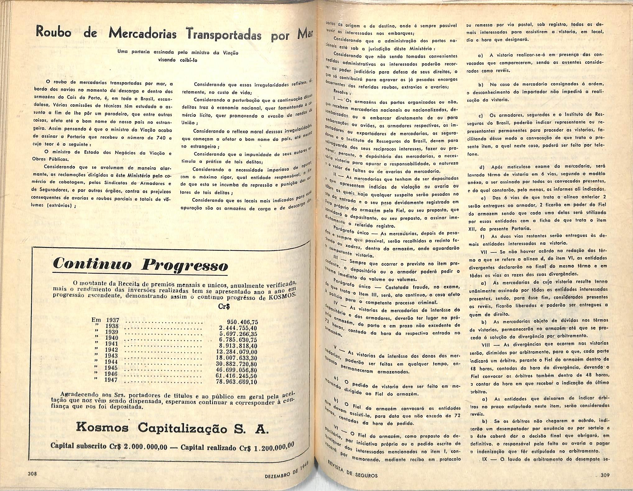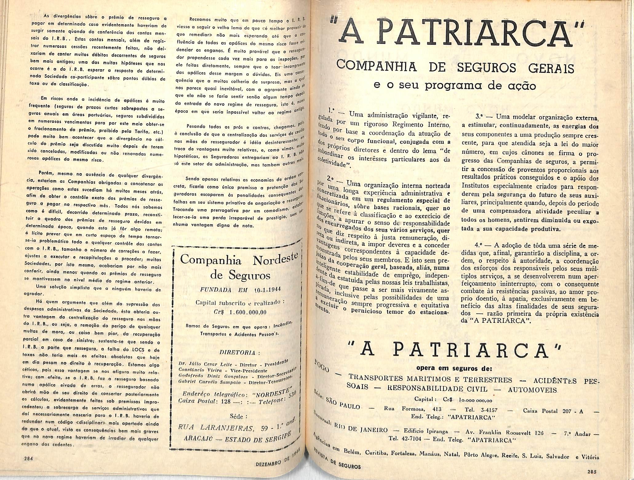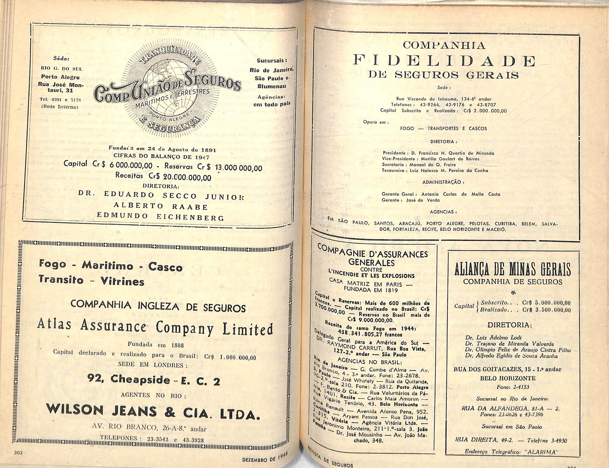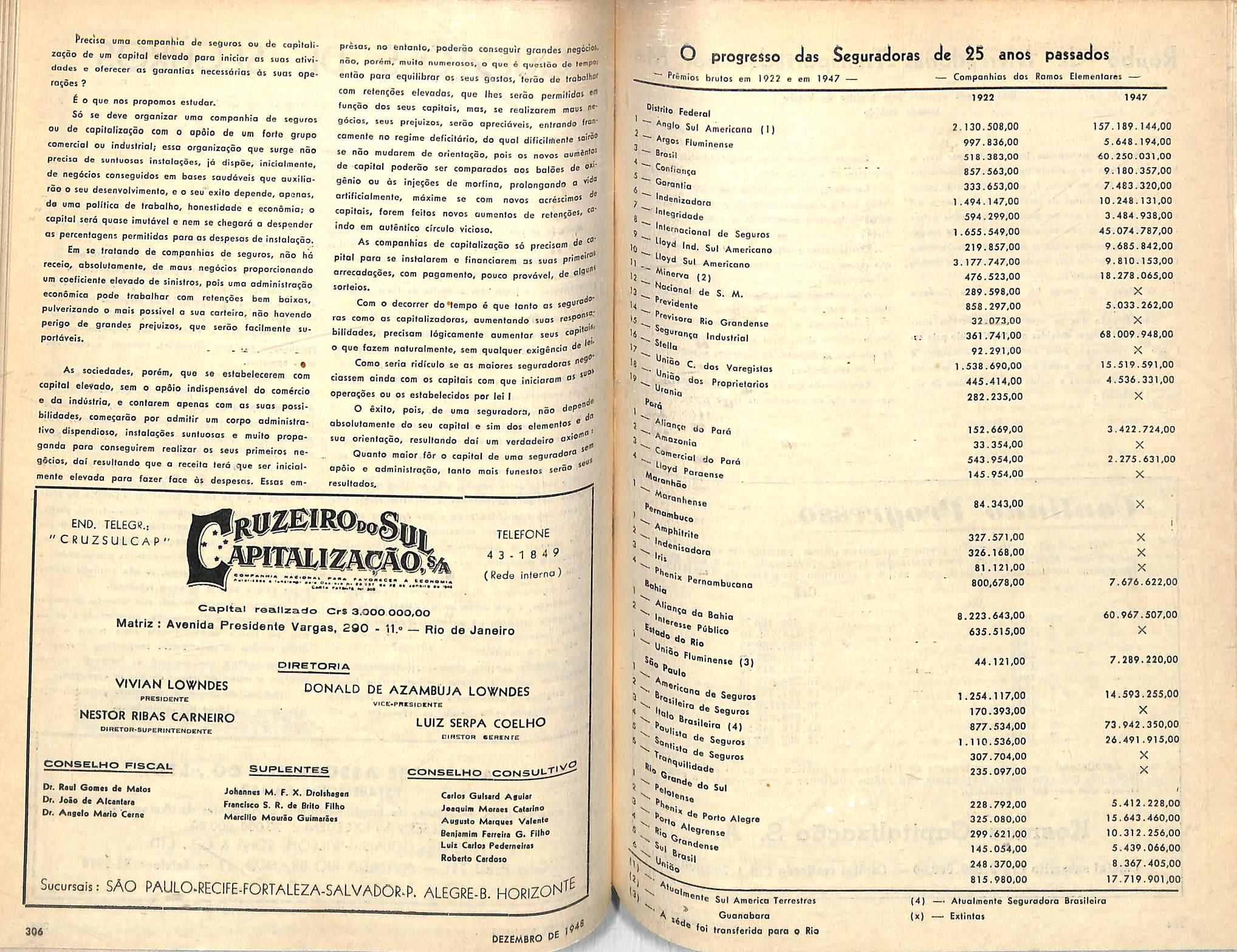 ANO RESPONSABILIDADE PREMIOS SINISTROS 1940 3.929.719.012,00 20,031.545,00 7.323.826.00 1941 4.748.338,249,00 25.684.553,00 7.426.313,00 1942 4.999.477.500,00 50.870.645.00 17.049.151,00 1943 5.978.401.755,00 53.153.992,00 26.463.003,00 1944 6.375.868.060,00 49.694.579,00 16.241.324,00 1945 6.768.916.151,00 44.472.435,00 19.416.645,00 1946 8.123.219.757.00 56.473.221,00 22.706.390,00 1947 8.921.004.214,00 61.582.236,00 28.129.151,00 Diretores