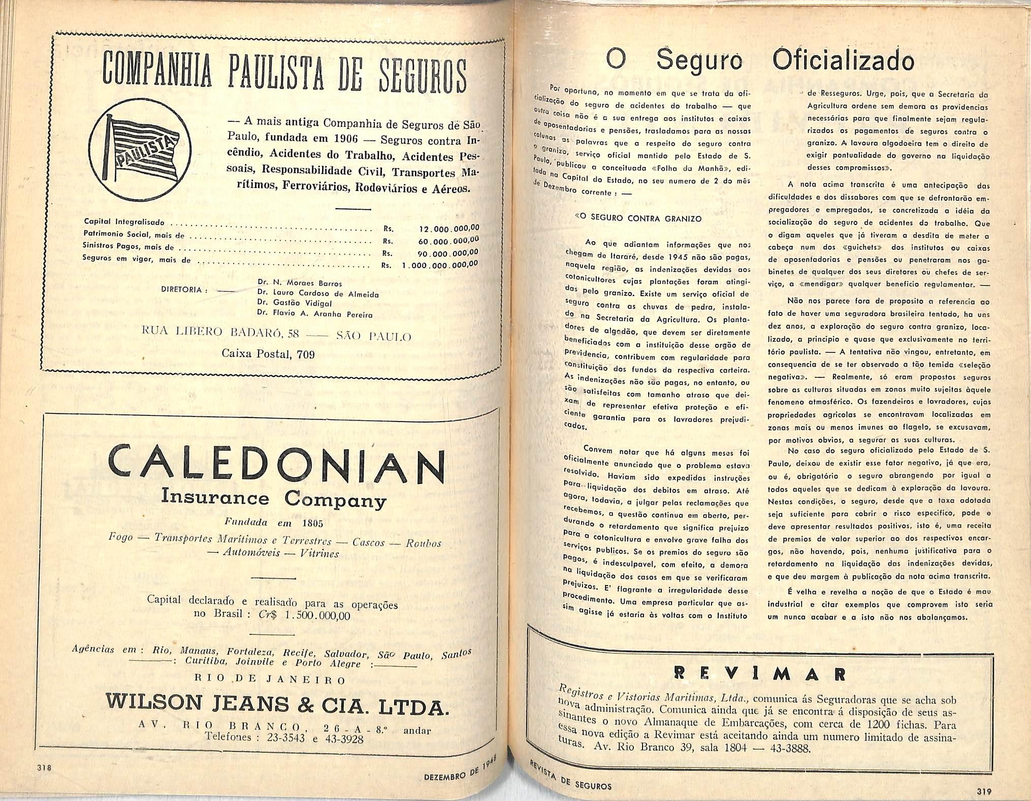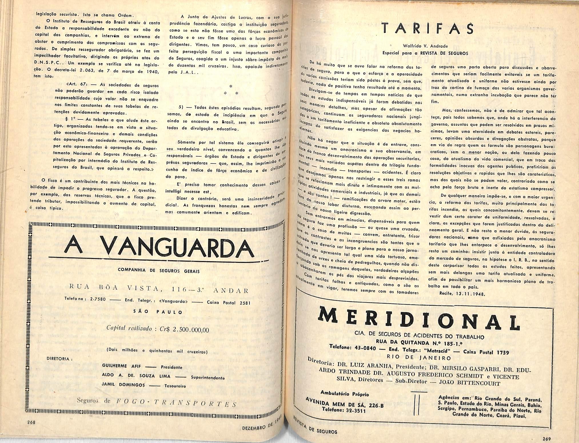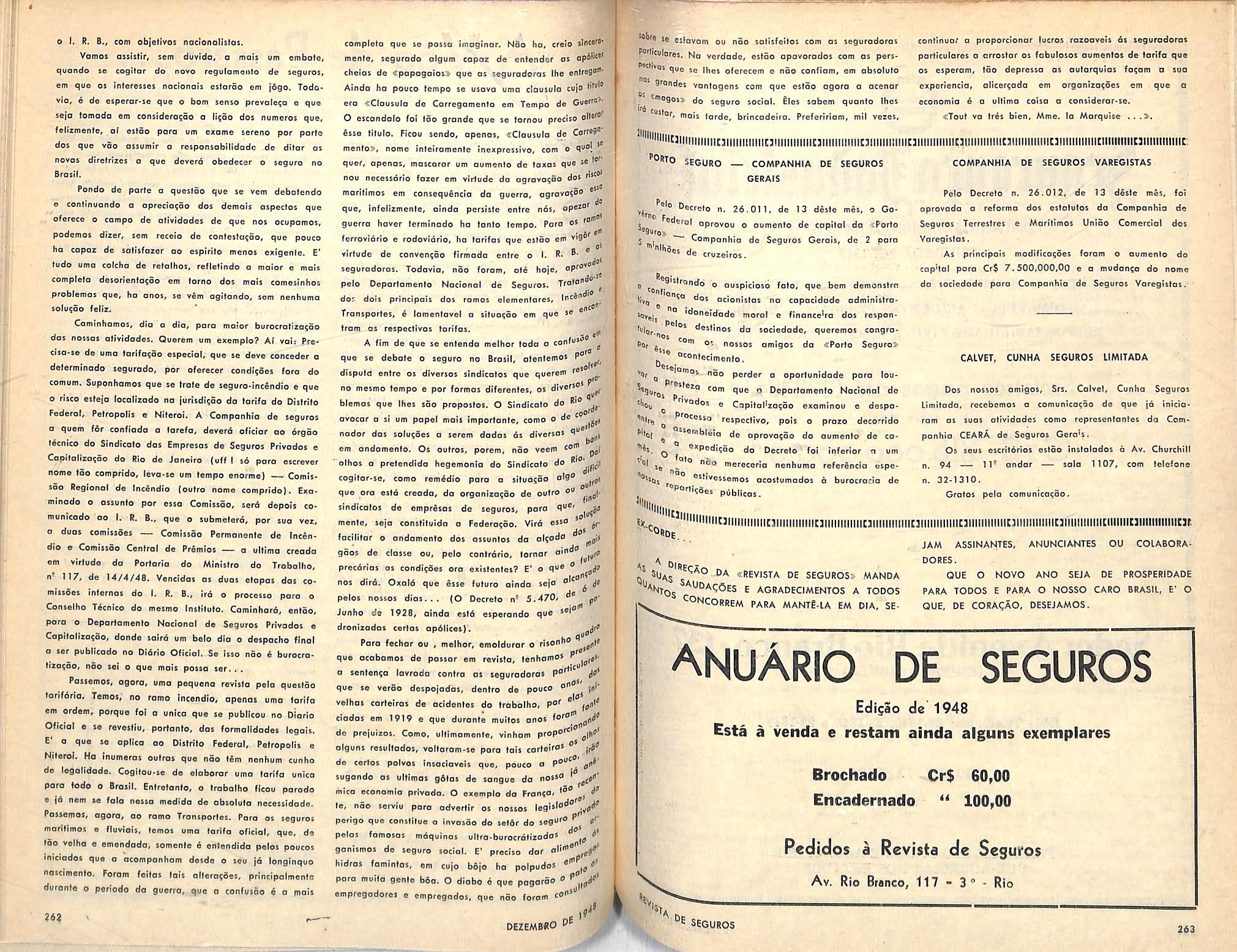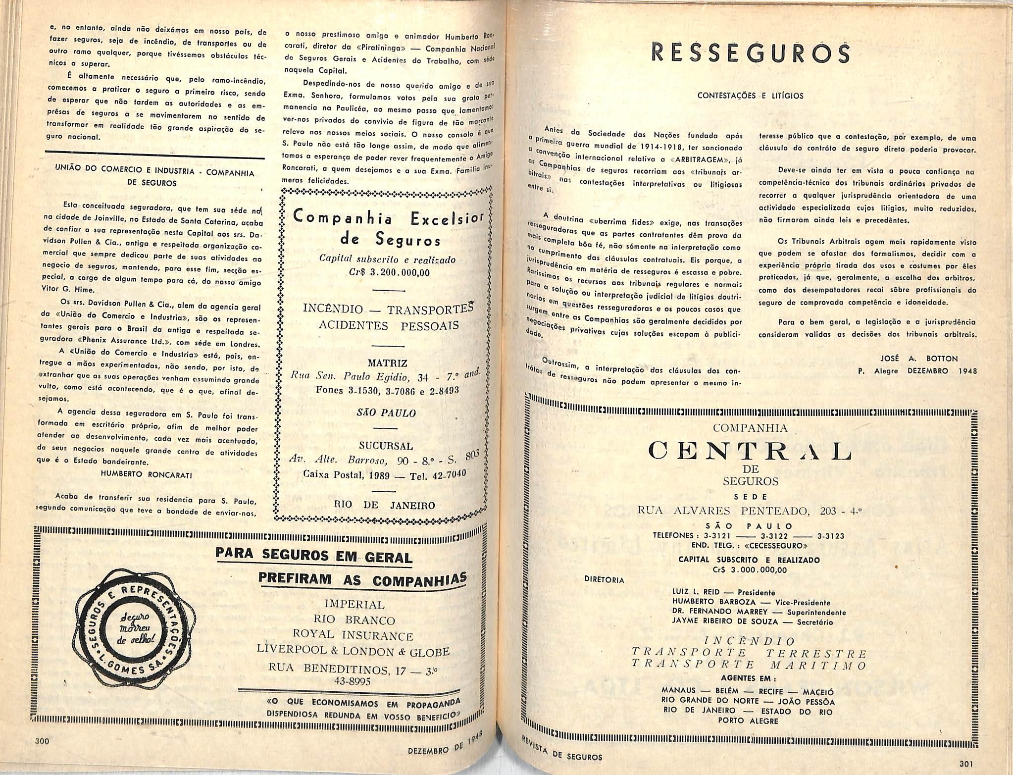 ANO RESPONSABILIDADE PREMIOS SINISTROS 1940 3.929.719.012,00 20,031.545,00 7.323.826.00 1941 4.748.338,249,00 25.684.553,00 7.426.313,00 1942 4.999.477.500,00 50.870.645.00 17.049.151,00 1943 5.978.401.755,00 53.153.992,00 26.463.003,00 1944 6.375.868.060,00 49.694.579,00 16.241.324,00 1945 6.768.916.151,00 44.472.435,00 19.416.645,00 1946 8.123.219.757.00 56.473.221,00 22.706.390,00 1947 8.921.004.214,00 61.582.236,00 28.129.151,00 Diretores