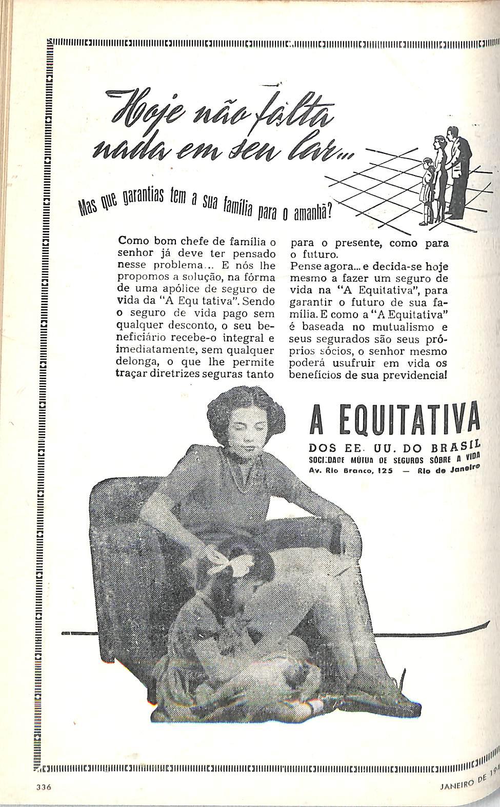 Como bom chefe de familia o senhor ja deve ter pensado nesse problema. E nos Ihe propomos a solugao, na forma de uma apolice de seguro de vida da "A Equ tativa". Sendo o seguro de vida pago sem qualquer desconto, o seu beneficicirio recebe-o integral e imediatamente, sem qualquer delonga, o que ihe permite tra^ar diretrizes seguras tanto