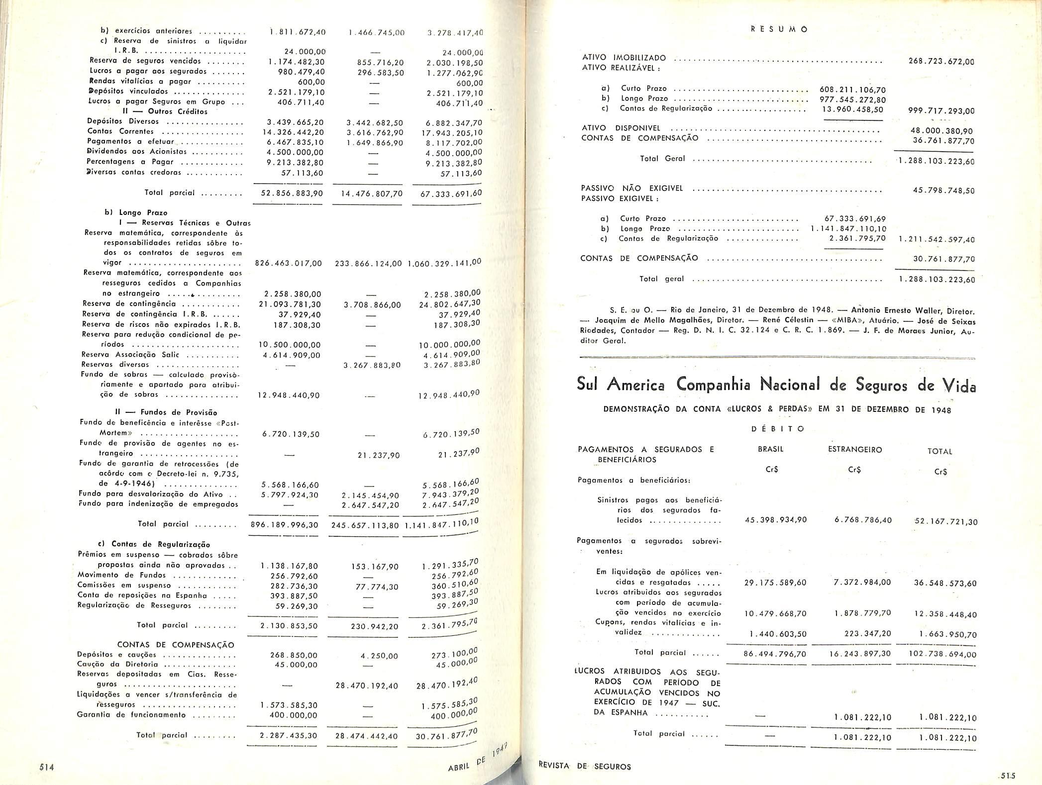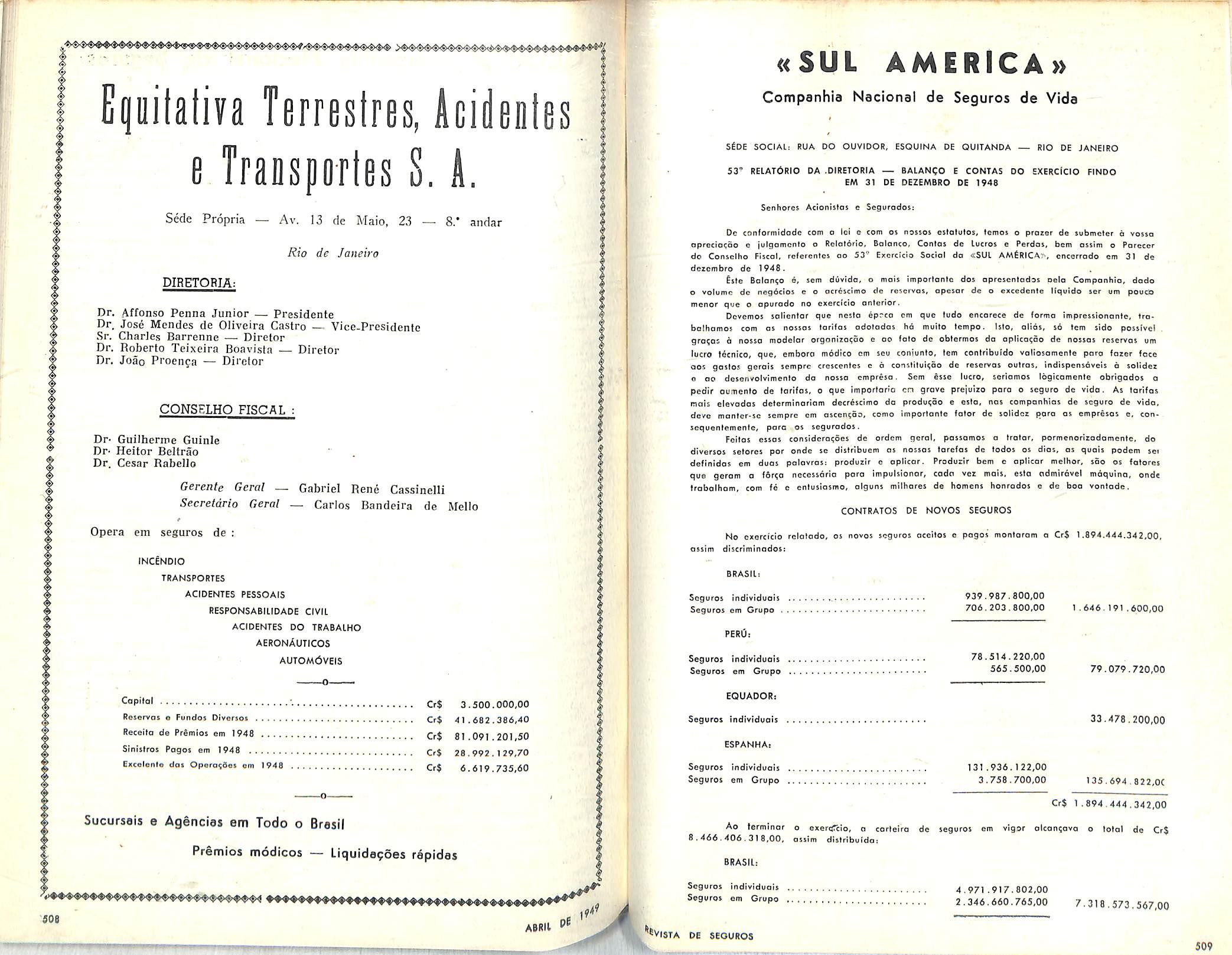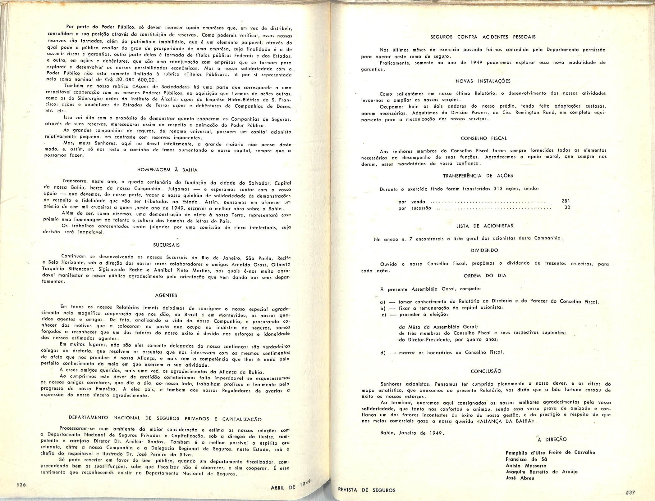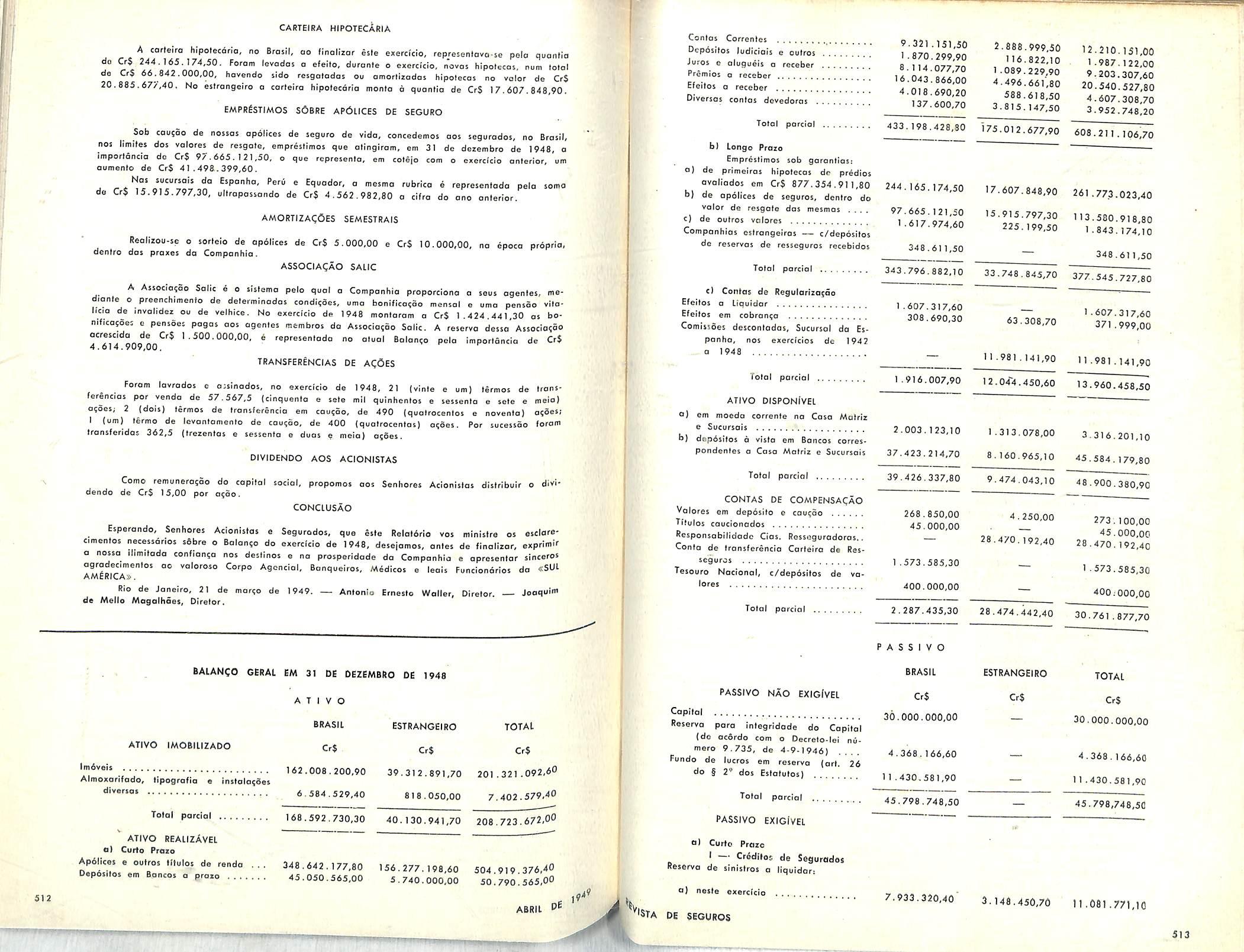 SEGUROS INCENDIO E TK.\.VSPORTES. DE 1870 A 1948 ANO '| RESPONSABILIDADE 1 PREMIOS SINISTROS 1870 a 1879 274.407.661.50 2.1 10.429,10 1.723.606,10 1880 a 1889 2)9.548.666,50 1 .274.955,80 705,262,40 1890 e 1899 487.362.088,40 2.866.160.80 2.198.990,90 1900 a 1909 1 .926.231 .531,00 ,10.212.620.00 7.243.656,00 1910 0 1919 7.429.043.543,00 38.484.631,00 26.465.354,00 1920 0 1929 25-597-750.822,00 122.984.615,00 69. 113.011,00 1930 0 1939 28.731.803.961.00 138.542.357,00 49.994.904,00 1940 a 1948 60.049.572.984,70 377.244,580,30 160.958.876,50 124.715.721 .258,10 693.720.349.00 318.403.660,90 1870 0 1939 64.666.148.273,40 316.475.768,70 157.444.784,40 1940 a 1948 60.049.572.984,70 377.244.580,30 160.958.876,50 VALORES DO BALANG-O DE 194S Imovitis 49.438.933,30 Tifulos do Rende 37.876.268,70 Dinheiro cm Coixe c cm Bonces 25. 159.026,40 Oulras centos 24.694,674,30 137.168.902,70 Sr-DE : SALVADOR — ESTADO DA BAHIA EUNDADA EM 1870 Diretores : Dr. Pamphilo d'Utra Freire de Carvalho — Presidente Dr. Francisco de Sa Amsio Massorra Dr. Joaquim Barreto de Araujo Jose Abreu