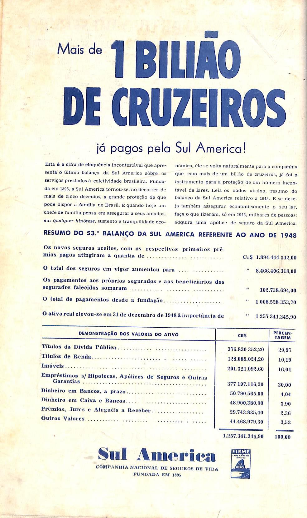 nomlca, Gle se volta naturalmente para a companhla quo com mals de um bil.ao de cruzeiros, Jd fol o inslrumento para a protegao de um ni'imero inconidvel de lares. Leia os dados abaixo. resume do balango da Sul America relativo a 1948. E se deseja lambdm assegurar econumicamenle o seu lar. faga o que Ilzeram, s6 em 1948. mllhares de pessoas; adqulra uma apdlice de seguro da Sul America. RESUMO DO 53." BALANQO