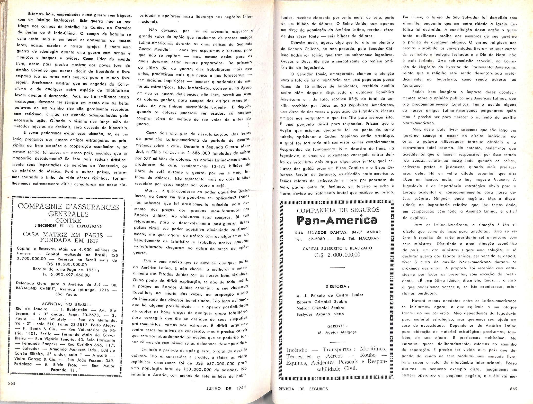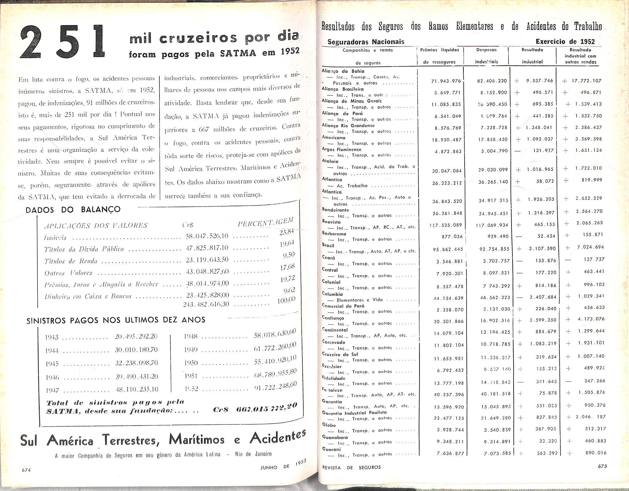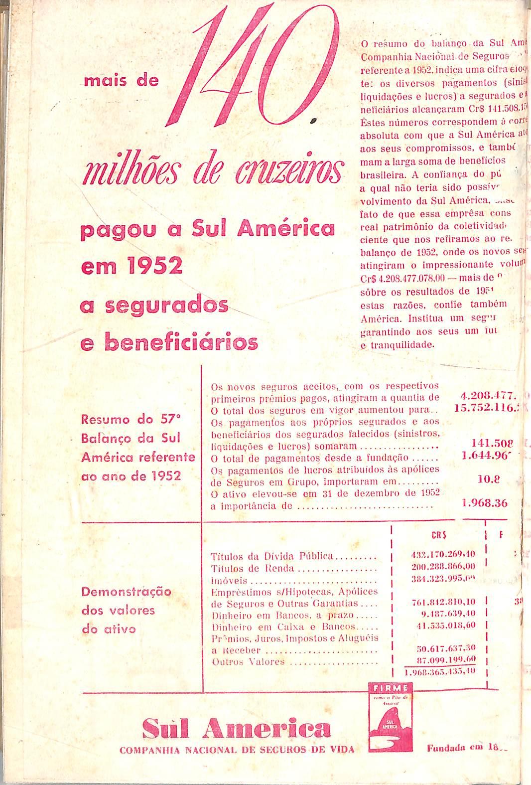 Companhia Nacioiuii de Seguros referenlea 11)52.indica uma cirt'aeiov te: OS ciivei-sos pagamentos (sinis liqiiidagoes e lucros) a segurados ei neficiiirios alcaiigaram CrS 111.50S.1' Esles muneros corresponcieni 5 ooHj absoluta com que a Sul America aos sens compromissos, e tainbi iriam a iarga soma de beneficios brasileira. A coiitiaiiga do pii ' a qual nao teria sido poss.'v 1 volvinieuto du Sui America. fato de que essa empresa cons real patrimOnio da coietividadi ' ciente que nos reliramos ao re. j balango dc 1952. onde os novos ses) Utingirnni o impressioiiante volui" CrS 4.208.477.078,0(1— mais de" ' sobre os resultados de 195' j eslas razoes. confie tambem ' America. Iiistitiia urn seg'U y; garantiiuio uos seus vim lui j e traiiquilidade. ,