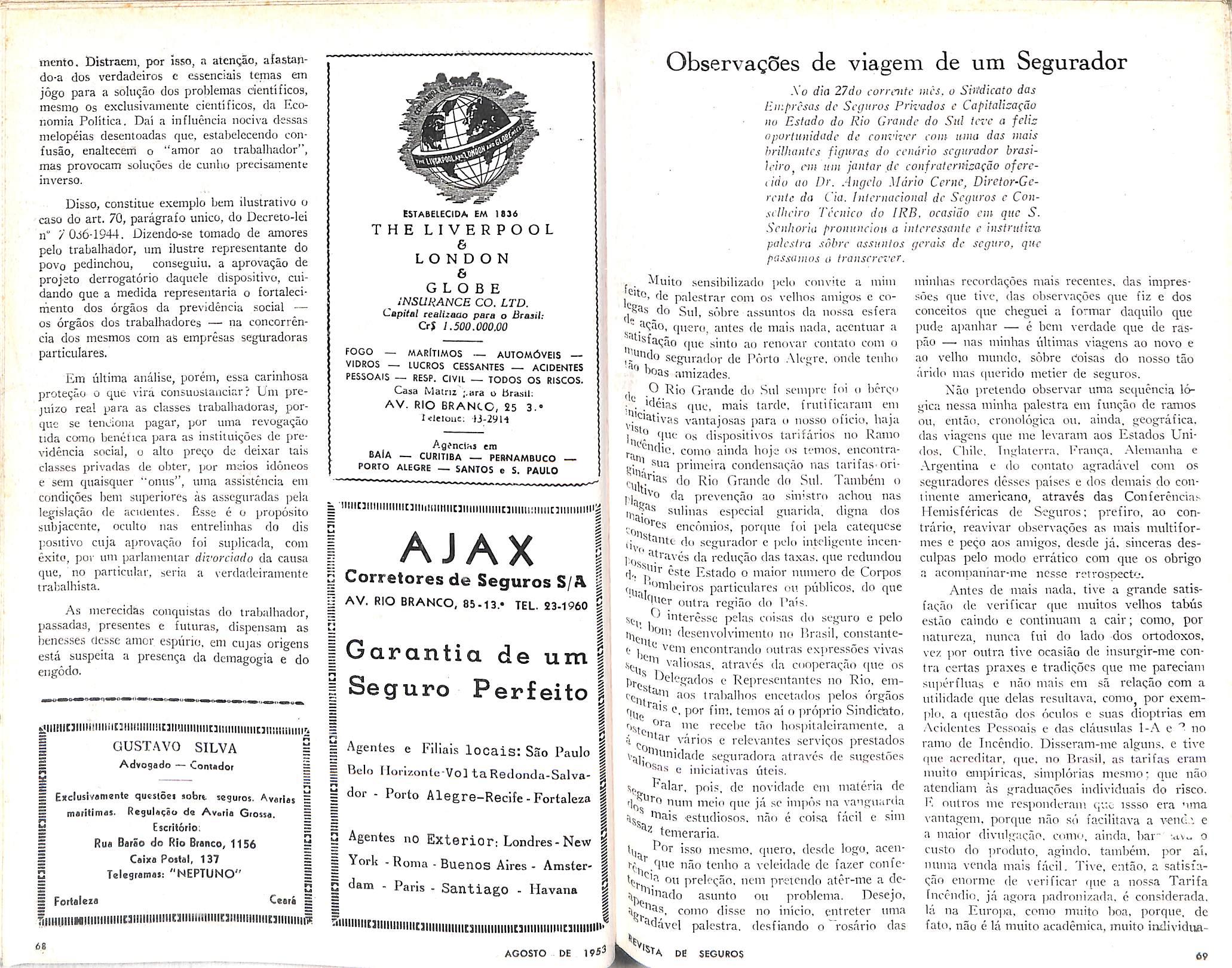 nistro para a nossa renasceiite democracia,^ uma progressiva socializaqao das diversas OT dalidades em que o Seguro Privado se desd'fj bra; desso pensamento dorsal elaborado e de?! veladamente vitalizadn uos esconsos iabora^ rios onde se manipulam, para a reestrutura?^ social do pais, as teorias politicas indica'l' para aplainar os camuihos que cDuduzani ^ novos rumos ciuc sc teuciona cstabelecer para ordem ecoiiomica da Xaqao: dessas .foiites' purias e nocivas para o regime politico eni Q' vivemos. c que tern broiadfj. certainentc. csse enxamc de iniciativas e de pregaqoes rJ® trinarias em que repnnia. expressa ou citamente, a preocupaqao ou o dcscjn de ^ irar as bases da interveiiqao estata] na dade doa organismos seguradores privados^