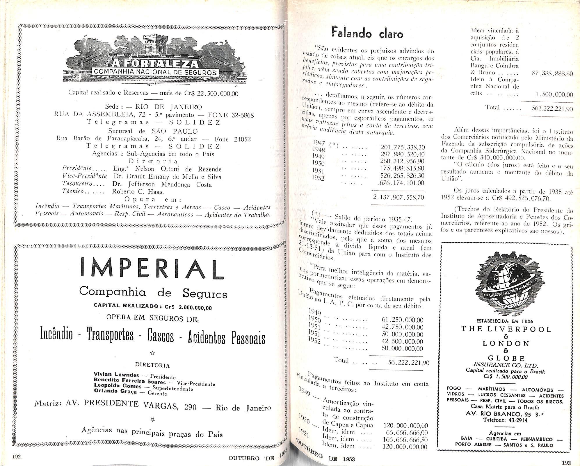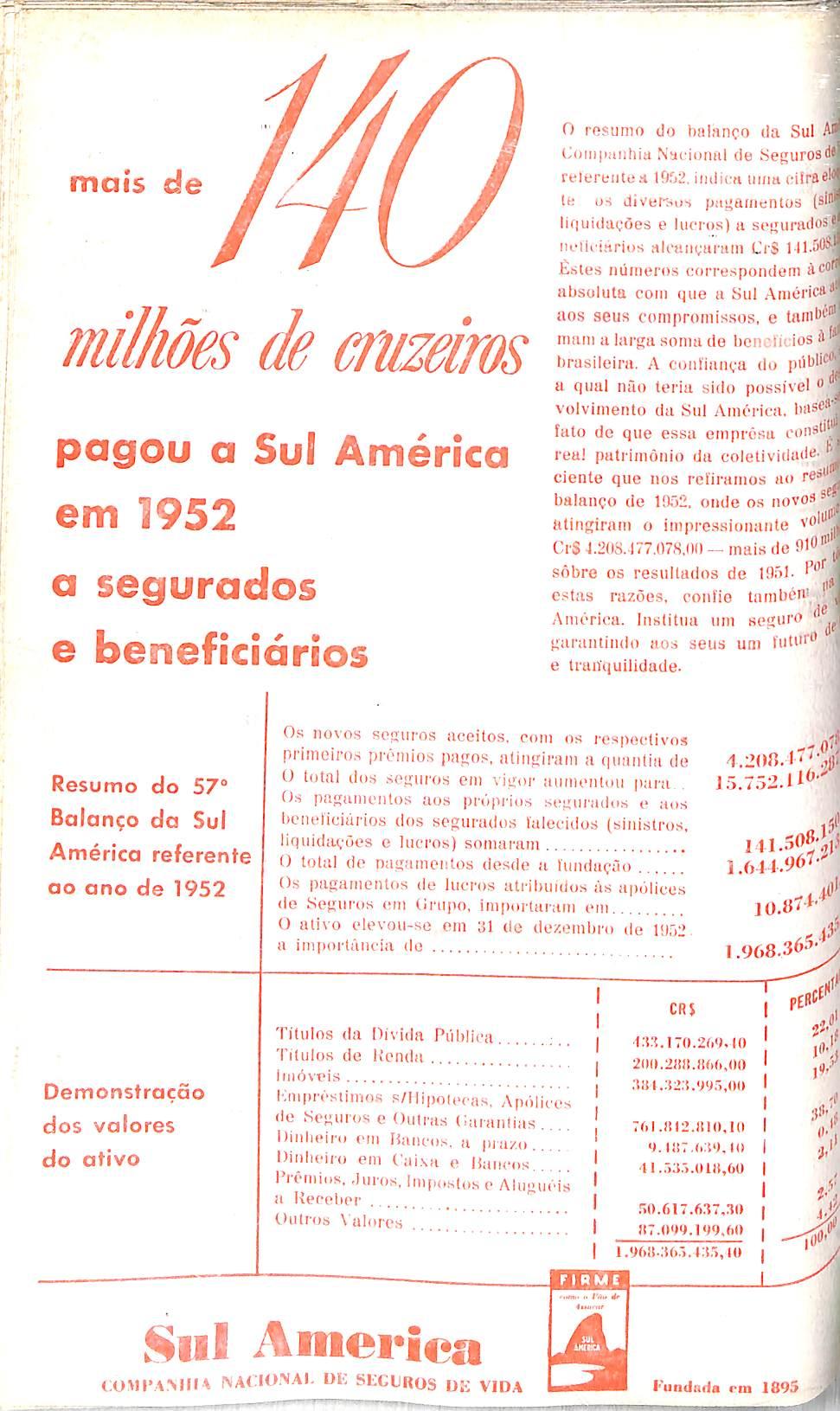 0 resumo do hiilanco lia Sul i^oiniiiiiihiu Nai iijiial (ie Sesuros relereutoH iiniica iiiiik Ih OS (3iversii-i jjiioaiiicntos l^I lif|uida(;6es e lucros) a scjjiirado! iH'ik'iarids Hli'niivanini CiS Ml.5® Esit's miiiieros cdtTespondom AC absoluta com gue u Sul Amei'ic®' aos seus coniproniissos, e mam a iargu soiua do bciK-iirios A: brasiloiru. A Cniilumva du a giial nTio (erla sidu possivel ® volviniento da SnI Am<^i-ica. I'US® falo do quo essa empresu co""^ roa! pulrimonio da coletividad^ ciente quo iios rcnrainos ao r®'*'' balan?o de onde os novos (ititiffiruiii 0 impfcssionaiilo vd"'