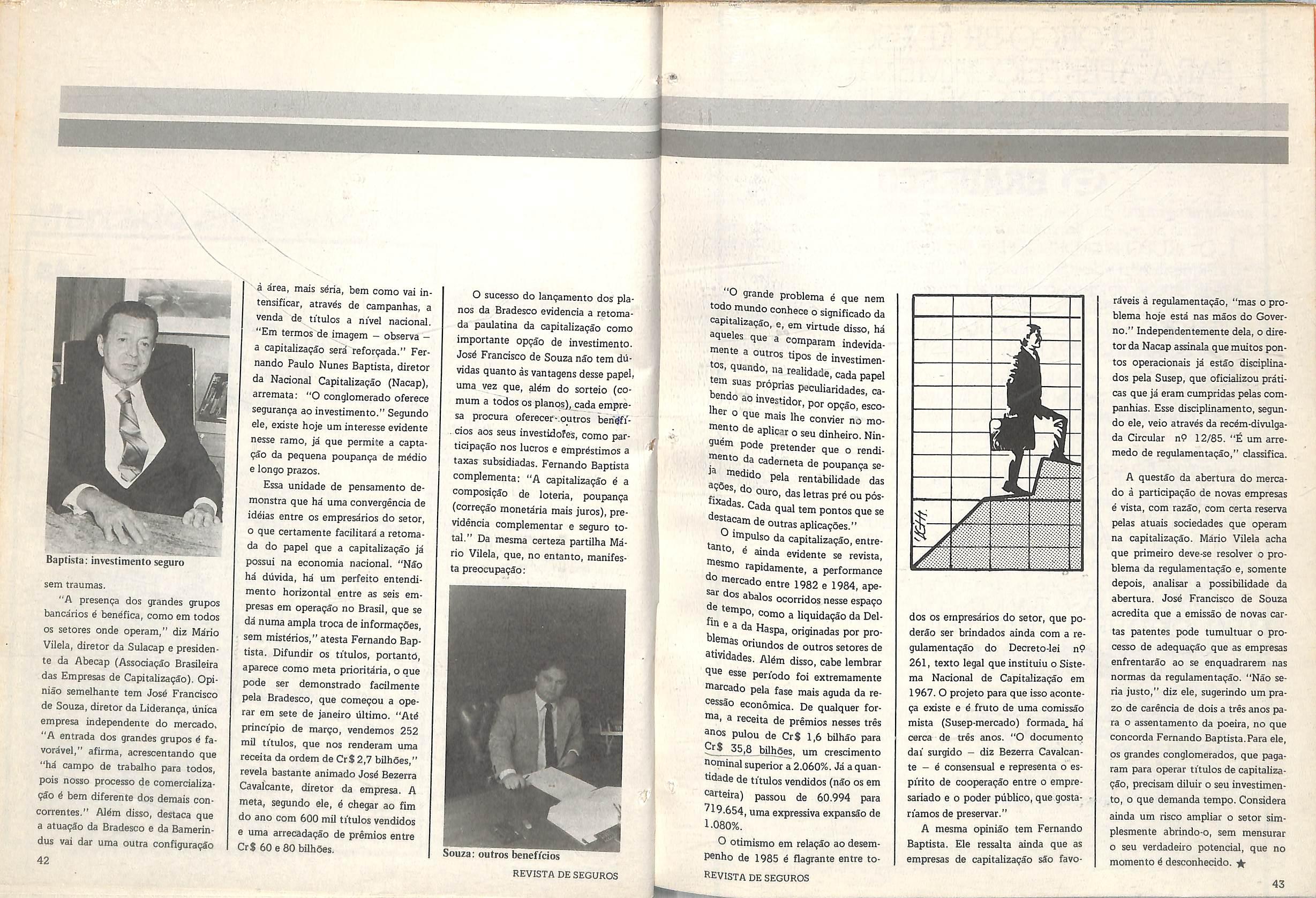 riveis a regulamentagao, "mas o pro blema hoje esta nas maos do Governo." Independentemente dela, o dire tor da Nacap assinala que muitos pon tos operadonais ja estSo disdplinados pela Susep, que oficializou praticas que ja eram cumpridas pelas companhias. Esse disdplinamento, segun do ele, veio atraves da rec^m-divulgada Circular nP 12/85. "E um arremedo de regulamentagao," classifica.