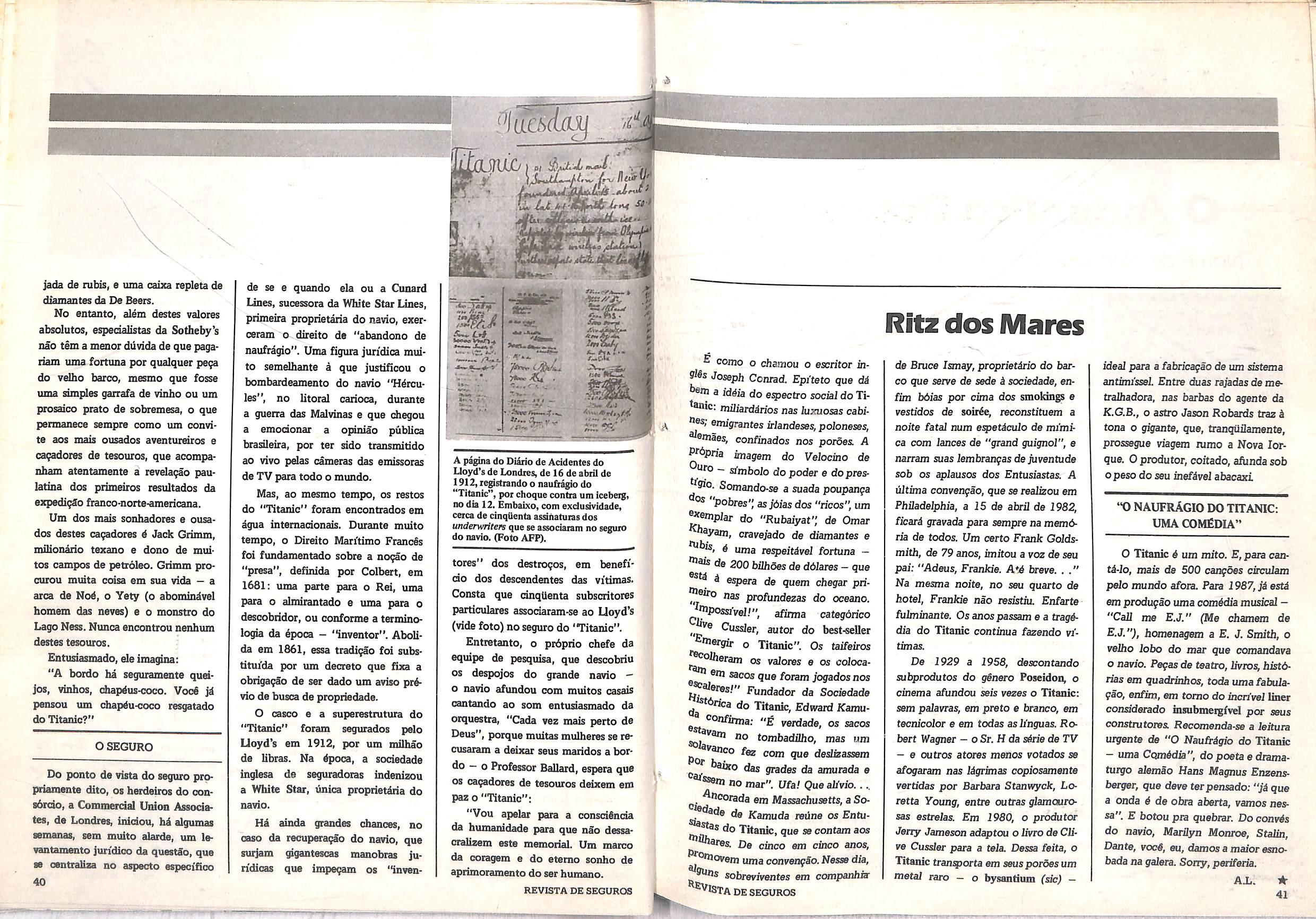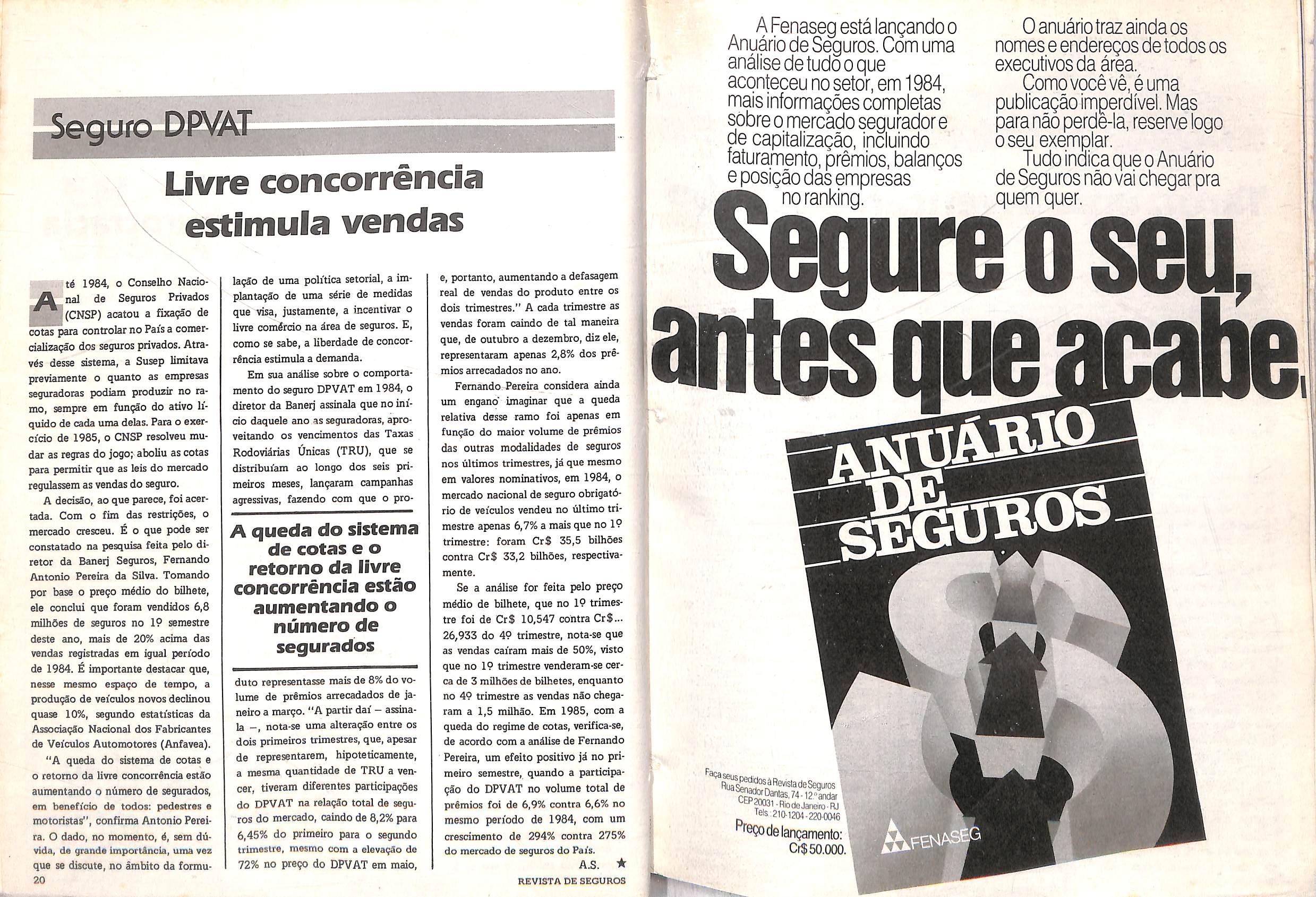 REVISTA DE SEGUROS*- Oig2o OGdal da Federi?ao Nacional das Empresas de Sesuios Piivados e de CapitaliiafSo (Fenaseg). Rua Senador Dantas, 74/129 andar. Tel.: 210-1204. Endere^o Teles' fico; Fenaseg.Telex:34505P BR.CEP 20031.