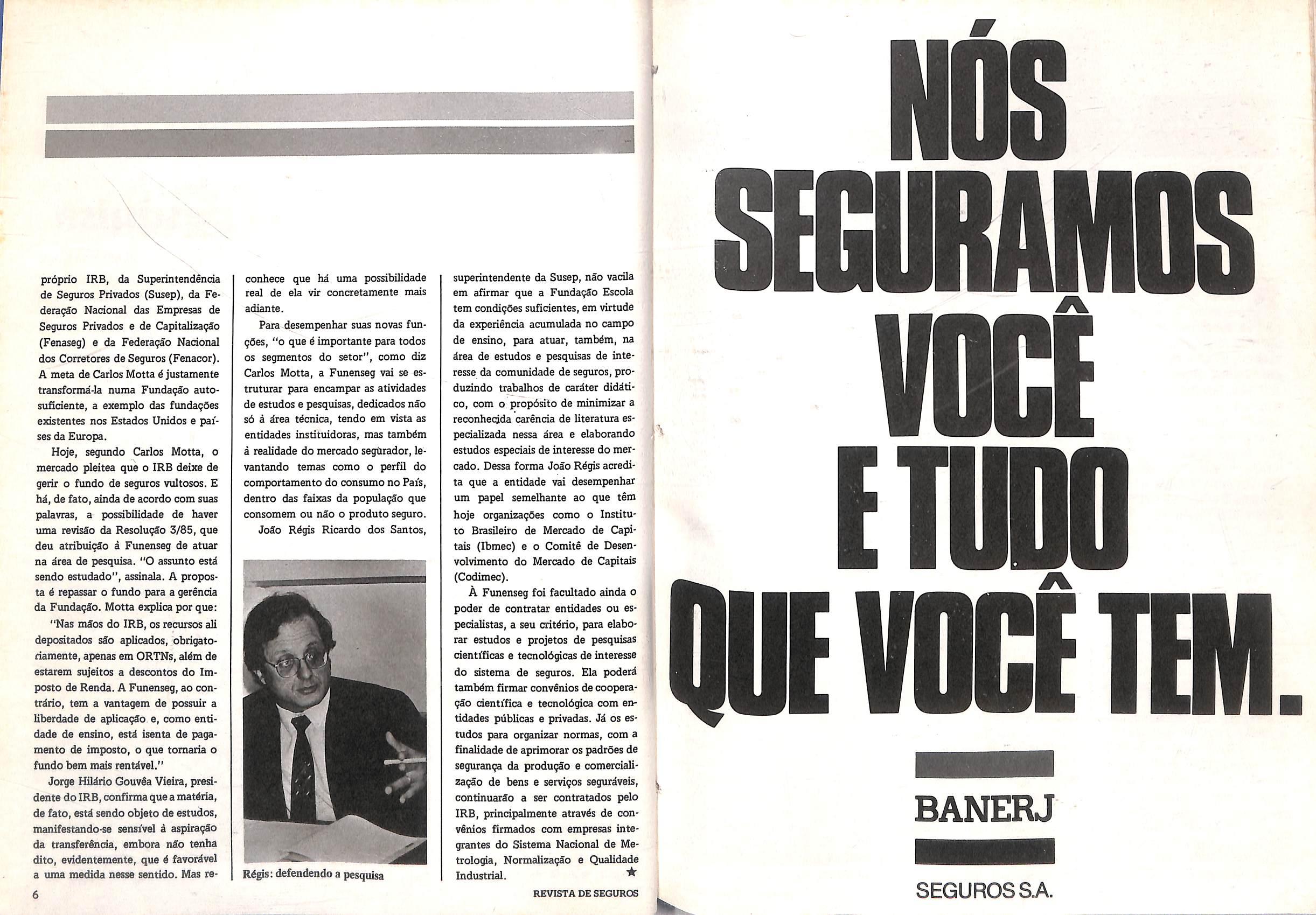superintendente da Susep, nSo vacila em afirmar que a Fundag£o Escola tern condigOes suRcientes,em virtude da experienda acumulada no campo de ensino, para atuar, tambdm, na drea de estudos e pesquisas de interesse da comunidade de seguros, produzindo trabalhos de cardter diddtico, com o propdsito de minimizar a reconhedda carencia de literature especializada nessa area e elaborando estudos especiais de interesse do mer cado. Dessa forma Jodo Rdgis acredita que a entidade vai desempenhar um papel semelhante ao que tim hoje organizagfies como o Instituto Brasileiro de Mercado de Capi tals (Ibmec) e o Comite de Desenvolvimento do Mercado de Capitals (Codimec).