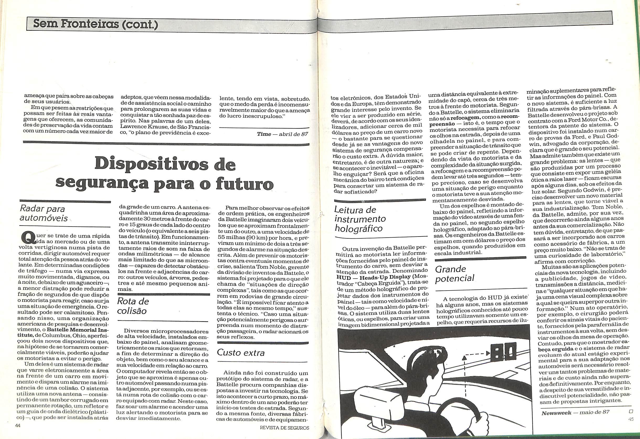 minagaosuplementarespararefletir asinformagoes do painel.Com o novo sistema, A suficiente a luz filtrada atraves do para-brisas. A Battelle desenvolveuoprojeto sob contratocom aFbrd Motor Co.,d^ tentora da patents do sistema. O dispositive foiinstalado num car ro de provas da Fbrd,e Paul God win,advogado da corporagao, declara que A grandeoseu potencial. Masadmitetambem que existeum grande problema;aslentes — que sao produzidas por um processo que consiste em expor uma geleia otica a raioslaser —ficam escur^ apos algunsdias,sob osefeitos da luz solar. Segundo Godwin,A pre cise desenvolver um novo material para as lentes, que torne viavel a sua industrializagao.Itom Noble, da Battelle, admite, por sua vez, que decorrerao ainda alguns anos antes dasuacomercializagAo.Nao tem duvida,entretanto,de que passarA a ser incorporado aos carros como acessorio de fAbrica, a um prego muito baixo."Naosetratade uma curiosidade de laboratorio. afirma com convicgao. Muitassao asaplicagSes potenciaisdanovatecnologia,incluindo a publicidade, jogos de video, transmissoes a distancia,medicinae"qualquersituagaoem quehajaumacenavisualcomplexasobre a qualse queirasuperpor outrainformagao." Num ato operatono, por exemplo, o cirurgiao podera conferir ossinais vitais do paciente,fornecidos pelaparafernaliadeinstrumentosasua volta,sem des viar os olhos da mesa de operagAo. Contudo,para queo mostrador cabega erguida e o sistema de radar evoluam do atual estagio experi mental para a sua adaptagAo nos automoveis serA necessArio resolver unstantos problemasde mate rials e de custo ainda nao superadosdefinitivamente.Porenquanto, a despeito de sua versatiUdadee indiscuiivel potencialidade, nao passam de propostas intrigantes.