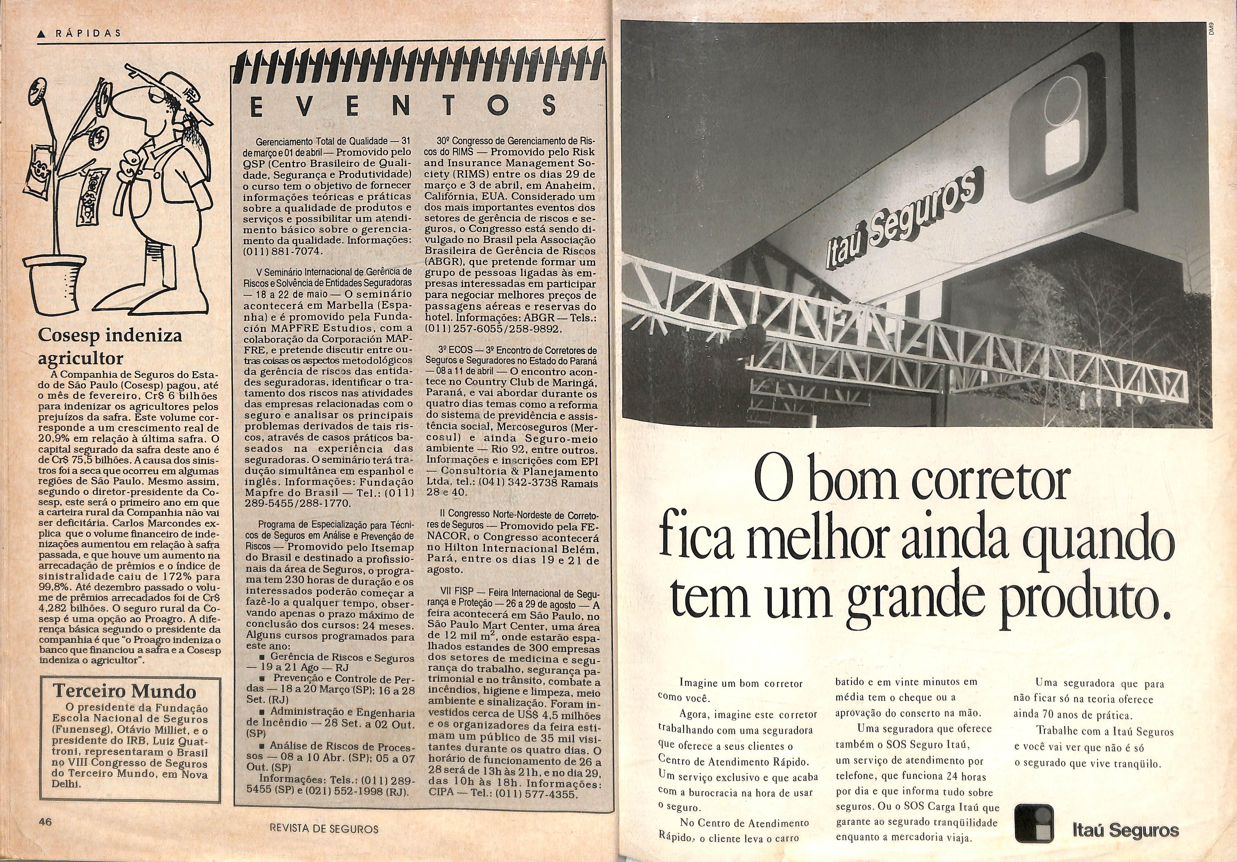 30' Congresso de Gerenciamento de Ris cos do RIMS — Promovido pelo Risk and Insurance Management So ciety(RIMS)entre os dias 29 de margo e 3 de abril, em Anaheim, California, EUA. Considerado um dos mais importantes eventos dos setores de gerencia de riscos e se guros, o Congresso esta sendo divulgado no Brasil pela Associagao Brasileira de Gerencia de Riscos (ABGR), que pretende format um grupo de pessoas ligadas as em presas interessadas em participar para negociar melhores pregos de passagens aereas e reservas do hotel. Informagoes: ABGR — Tels.: (Oil)257-6055/258-9892.