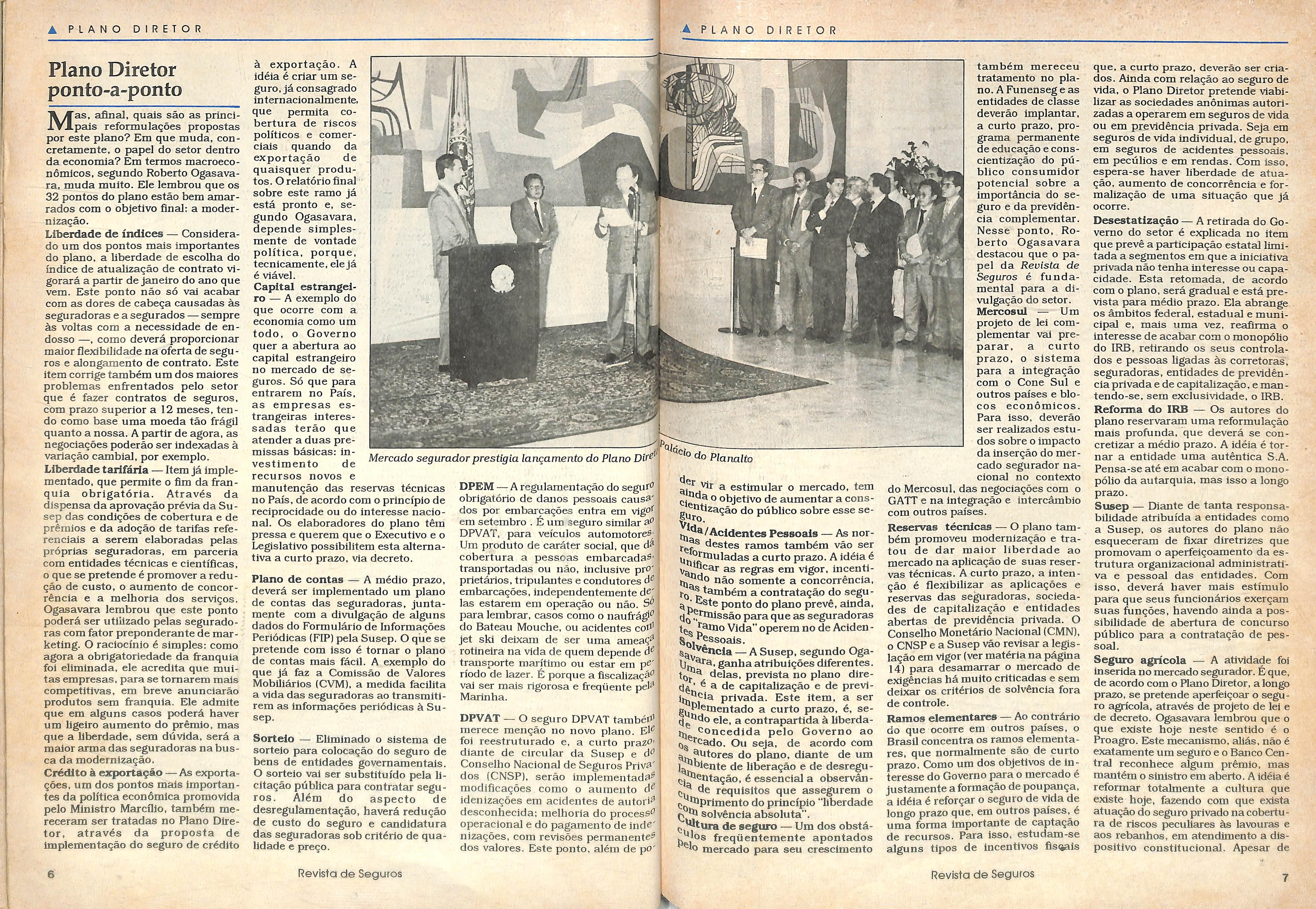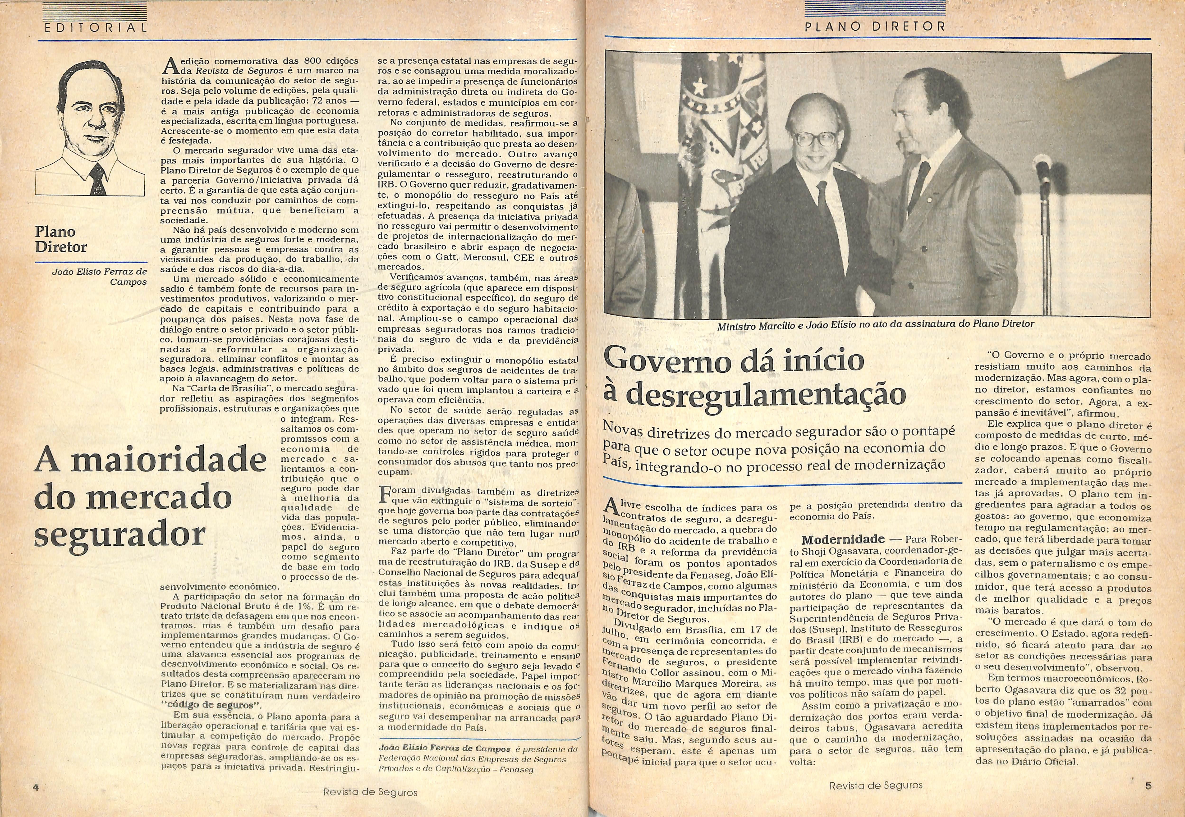 juijjQ^'S^do em Brasilia, em 17 de cerimonia concorrida, e presengade representantes do de seguros, o presidente blg^j.^do Collor assinou, com o Midij-^t^. ^brcflio Marques Moreira, as VaQ que de agora em diante um novo perfil ao setor de tetaj. ^ aguardado Piano Dimercado de seguros finalute saiu. Mas, segundo seus aupOht ^®Peram, este e apenas um ^Pe inicial para que o setor ocu-