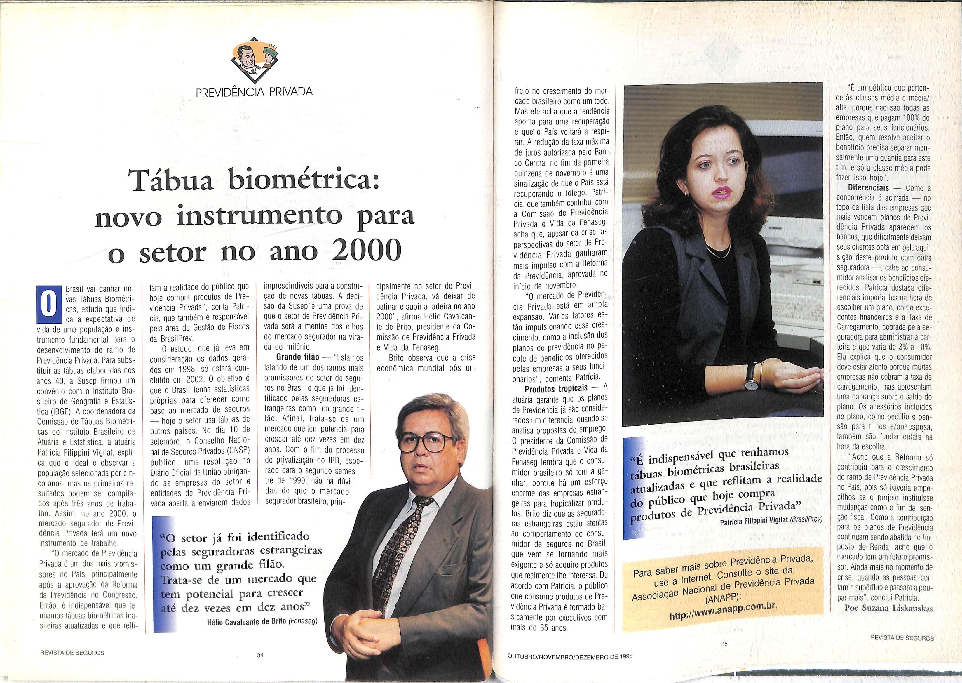 vas Tábuas Biométricas, estudo que indi ca a expectativa de vida de uma população e ins trumento fundamental para o desenvolvimento do ramo de Previdência Privada. Para subs tituir as tábuas elaboradas nos anos 40, a Susep firmou um convênio com o Instituto Bra sileiro de Geografia e Estatís tica (IBGE). A coordenadora da Comissão de Tábuas Biométricas do Instituto Brasileiro de Atuária e Estatística, a atuária Patrícia Filippini Vigilat, expli ca que o ideal é observar a população selecionada por cin co anos, mas os primeiros re sultados podem ser compila dos após três anos de traba lho. Assim, no ano 2000, o mercado segurador de Previ dência Privada terá um novo instrumento de trabalho.