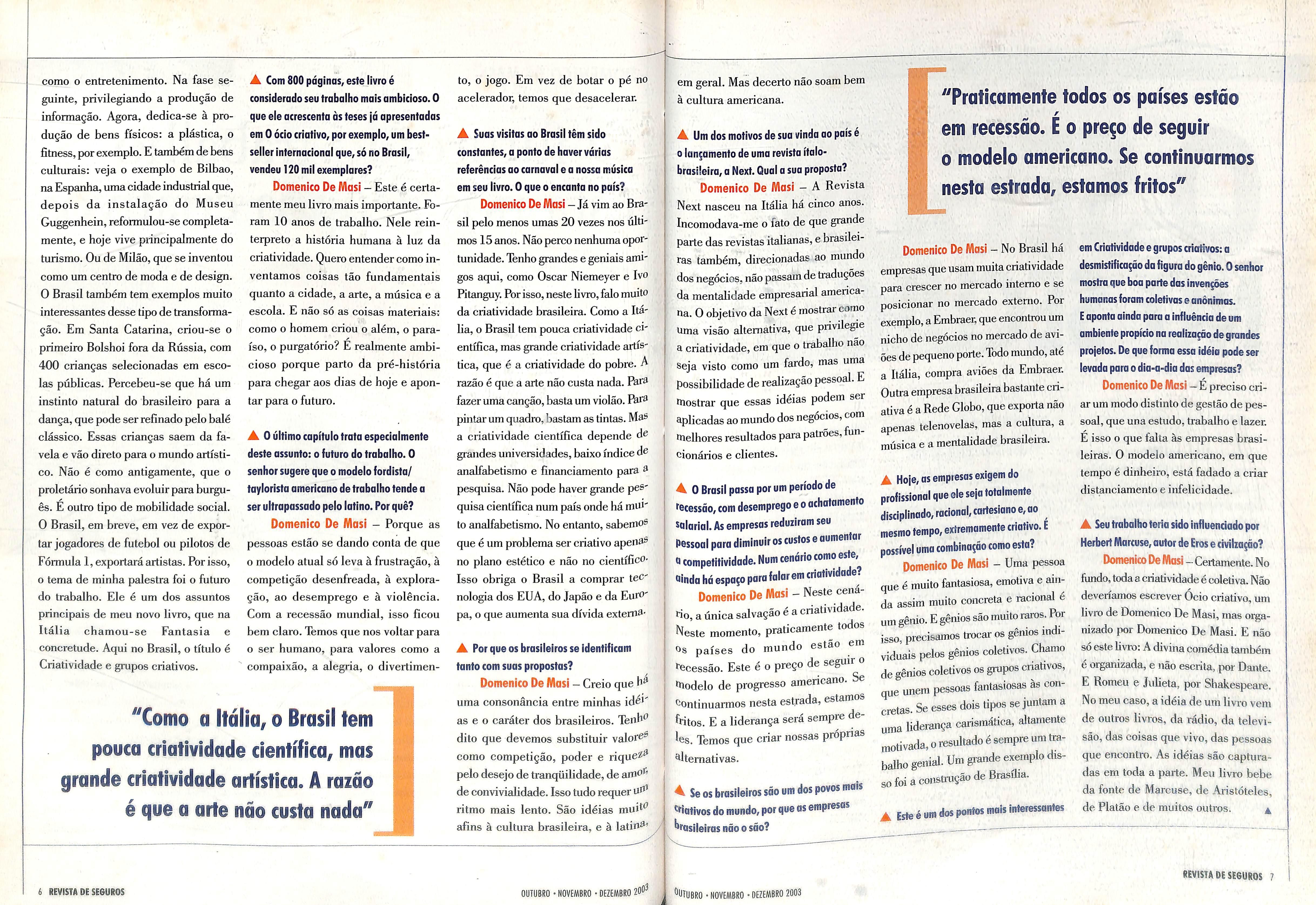 ^titeramericana de Empresas de ^eguros,que aconteceu na ^epublica Dominicana ENTREVISTA 0 sociologo italiano Domenico De Masi, que veio ao Brasil para participar da 2® Conseguro, elogia a criatividade do brasileiro SIVIAIS..._ ^ 4 EDITORIAL 44 RAPIDAS 45 BIBLIOTECA 46 PPINIAO Capitalizagao e tema de concoriido workshop na 2® Consegui*o Banking Technology Para mais Informa^esi Via L2 Norte - SGAN - Qd.601 - Modulo L - Brasilia-DF - 70830-010 Telefone:(61)426-8848 - Fax:(61)426-8806 - wwWoOtp.coiii.bT Veja iio