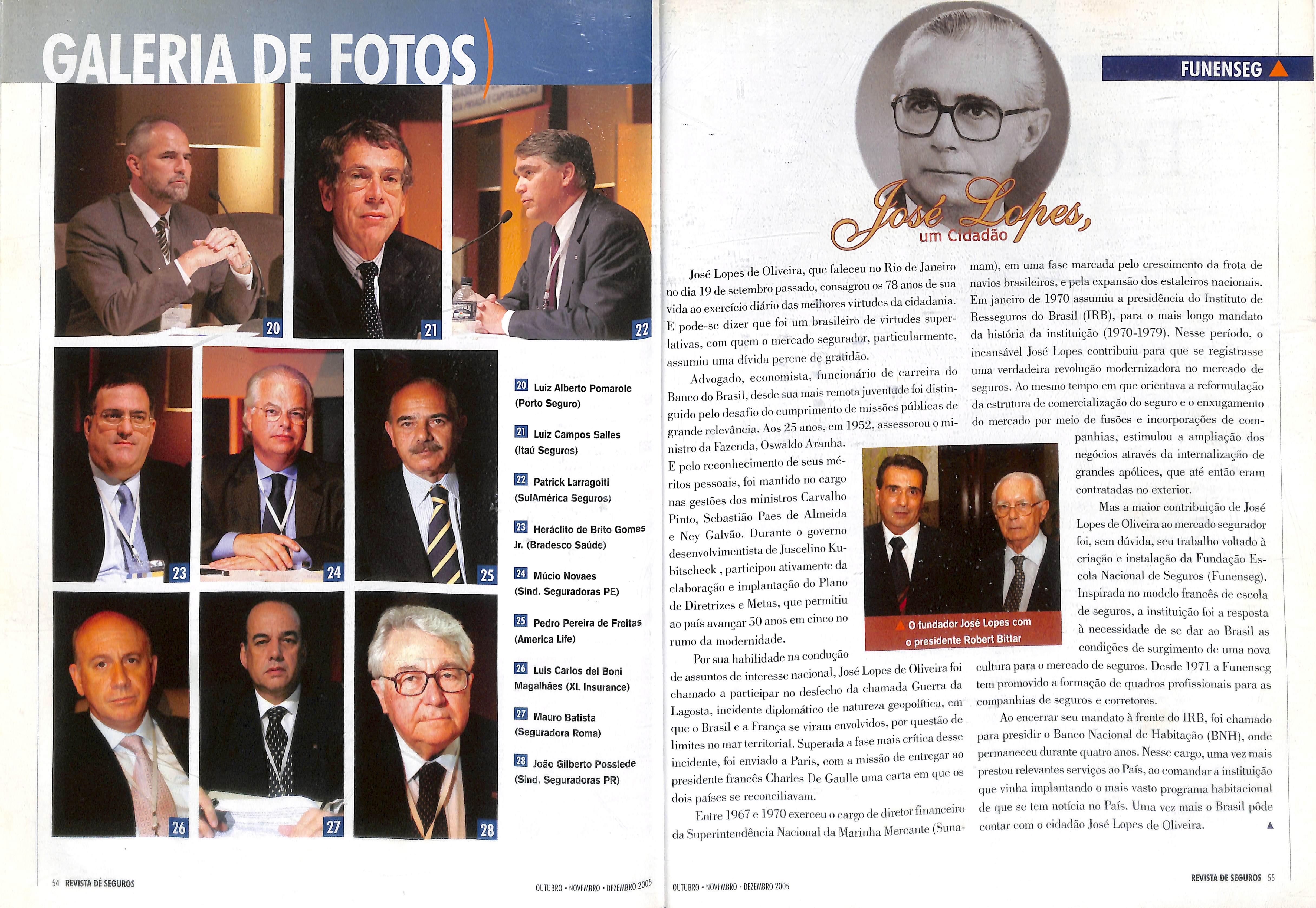 Mas a maior contribuigao de Jose Lopes de Oliveira ao mercado segurador foi,sem duvida,seu trabaliio voltado a criagao e instalagao da Fundagao Escola Nacional de Seguros (Eunenseg). Inspirada no niodelo fiances de escola de seguros, a instituigao foi a resposta a necessidade de se dar ao Brasil as condigoes de surgimento de uma nova cultura para o mercado de seguros.Desde 1971 a Eunenseg tern promovido a forniagao de quadros profissionais para as companhias de seguros e corretores.