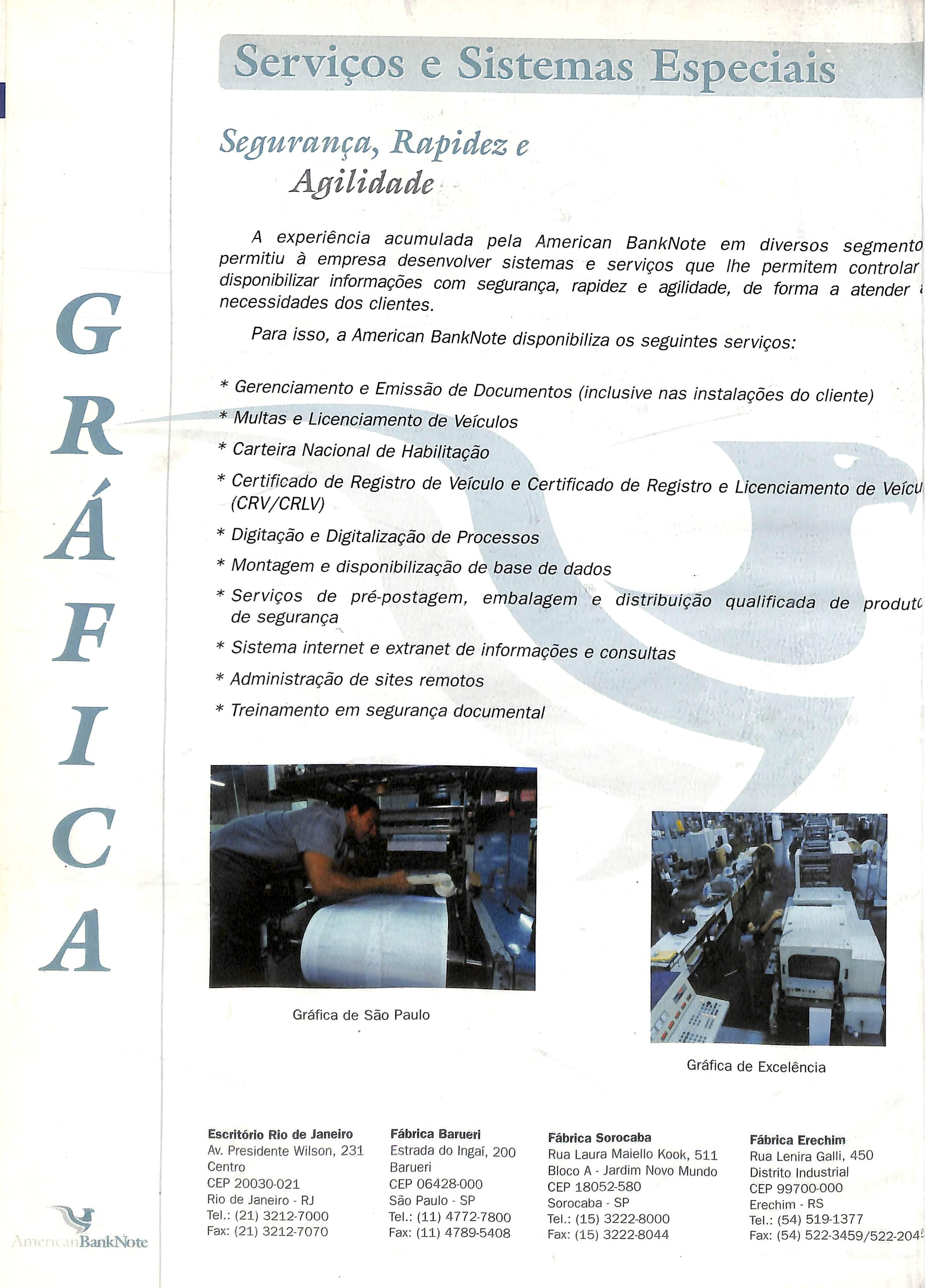 A experiencia acumulada pela American BankNote em diversos segmento permit!u a empresa desenvoiver sistemas e servigos que ihe permitem controlar disponibilizar informagdes com seguranga, rapidez e agiiidade, de forma a atender < necessidades dos clientes.