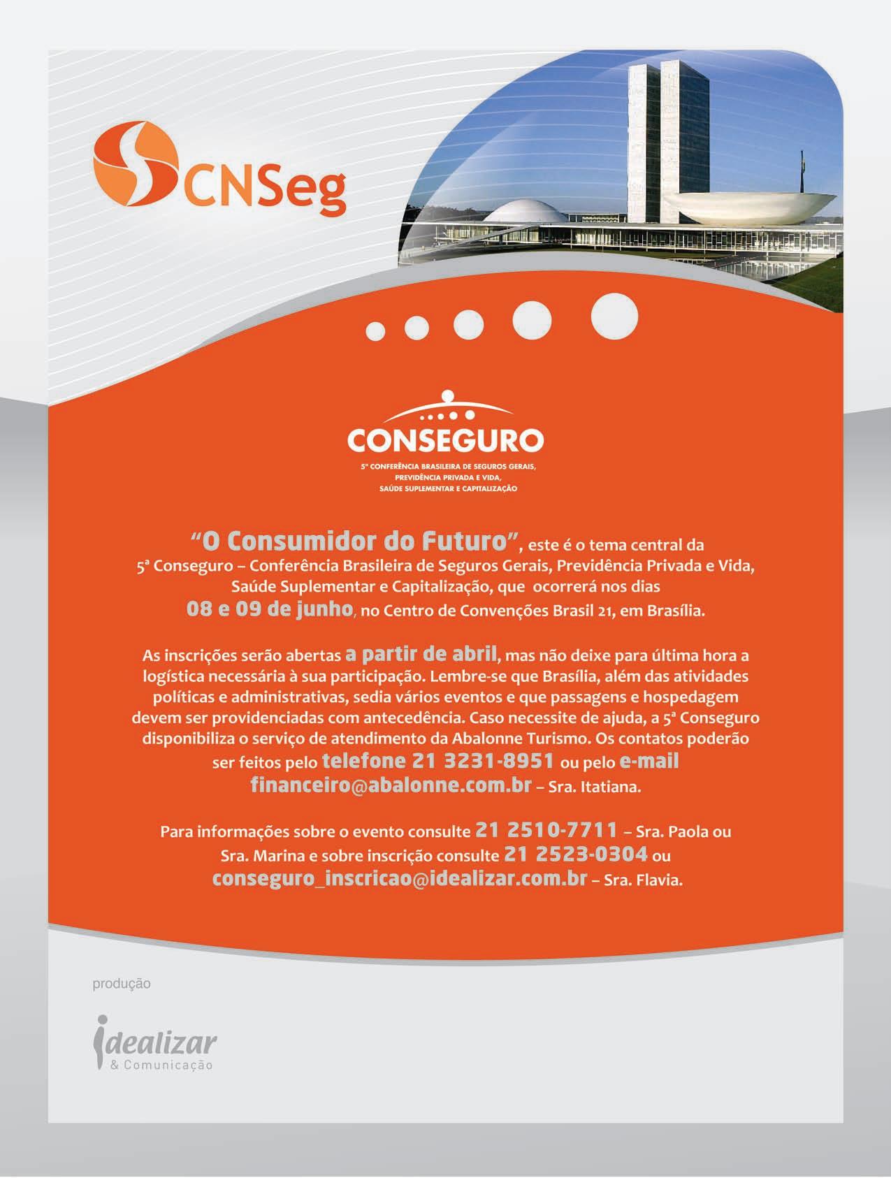 Afinal, os desafios crescem à mesma proporção. Um bom exemplo é o fenômeno da longevidade, que nesta edição ganha destaque como matéria de capa. Estudos do Ipea mostram que, em apenas 30 anos, o Brasil alcançará a idade adulta, pois enquanto a expectativa de vida está aumentando, a taxa de fecundidade está caindo. Informações desse teor são suficientes para levar o mercado a repensar as estratégias de atendimento e de desenvolvimento de novos produtos para essa população que cresce a olhos vistos. Não por acaso, portanto, a CNSeg escolheu o Consumidor do Futuro como tema central da 5ª edição do seu fórum bianual, a Conseguro, que será realizada nos dias 8 e 9 de junho próximo, em Brasília. Além da terceira idade, faz parte desse novo contexto cerca de 100 milhões de pessoas, das classes C e D, público alvo do microsseguro, modalidade de seguro que aguarda regulamentação do governo.