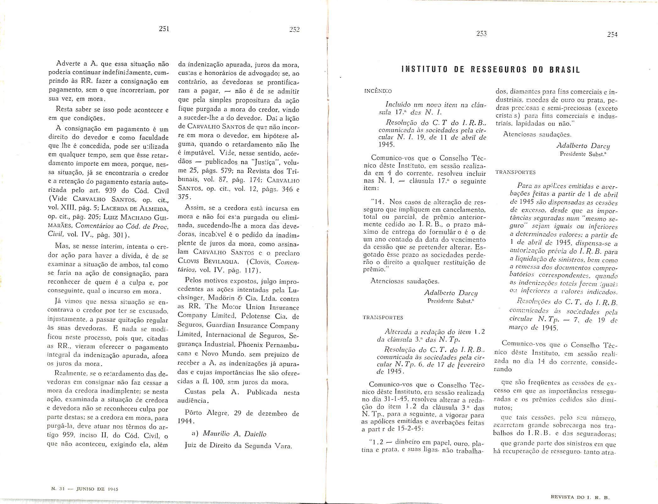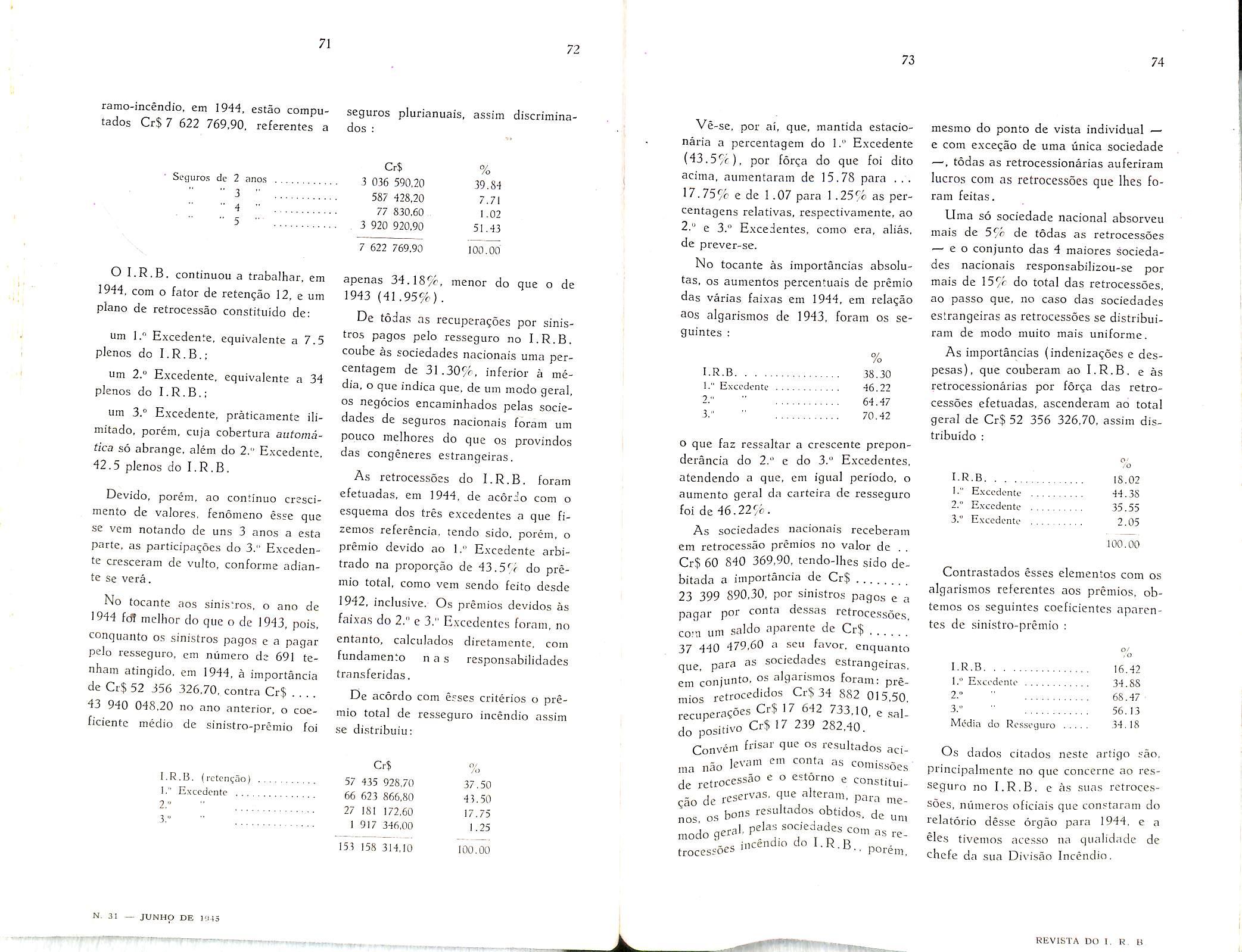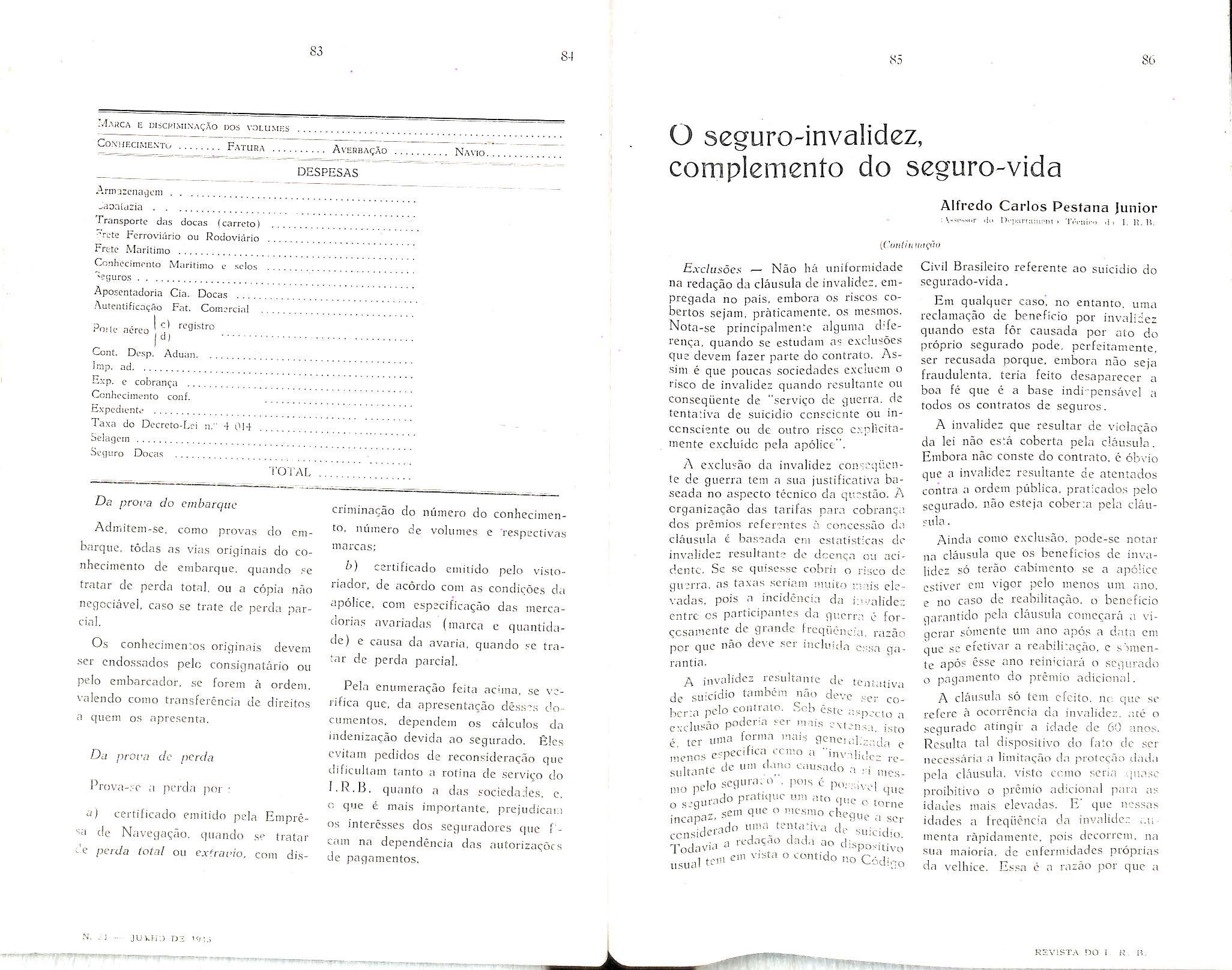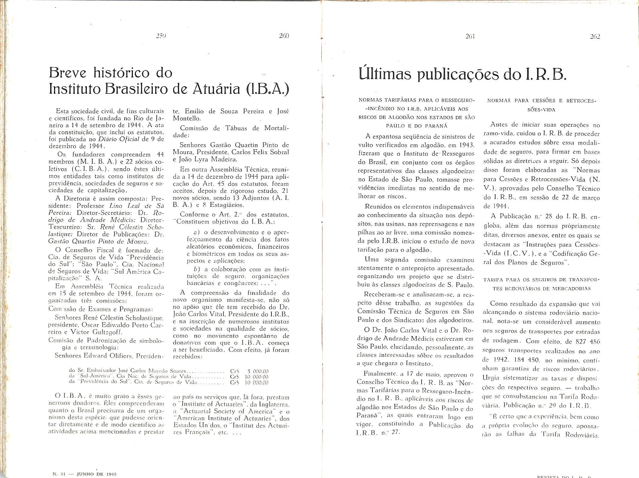 Sinistros Maritimos, col. 7 — Valorizagao do Homem, col. 9 — Institute dos Servigos Socials do Brasil, col. 19 — A proposta no Seguro Terrestre — Joao Vicente Campos, col. 47 — A boa-fe nas declaracoes prestadas pelo segurado Amilcar Santos, col. 55 — O seguro-incendio no Brasil em 1944 — Henrique Coelho da Rocha, col. 59 — Questao de Direito Maritimo — Joao Vicente Cam pos, col. 75 — Dos documentos que acompanham as propostas de liquidagao de sinistros-transportes — Nair de Tole do Camara, col. 79 — O seguro-invalidez, complemento do seguro-vida — Al fredo Carlos Pestana Junior, col. 85 Seguro de Vida — David Campista Filbo, col. 99 — Estudos sobre o ramo-vida Weher Jose Ferreira, col. 107 — Consolidag^ das Normas, Instrugoes e Circulares do I. R. B. — Paulo Barbosa Jacques, col. 115 — O registro de associados e contabilizacao de salaries no seguro so cial dos EE. UU. — A. Raja Gabaglia, col. 125 — Anotacoes a lei das sociedades anonimas. — Jose Pereira da Silva, col. 135 — Bolsa Brasileira de Seguros —EgasSanthiaio,col,