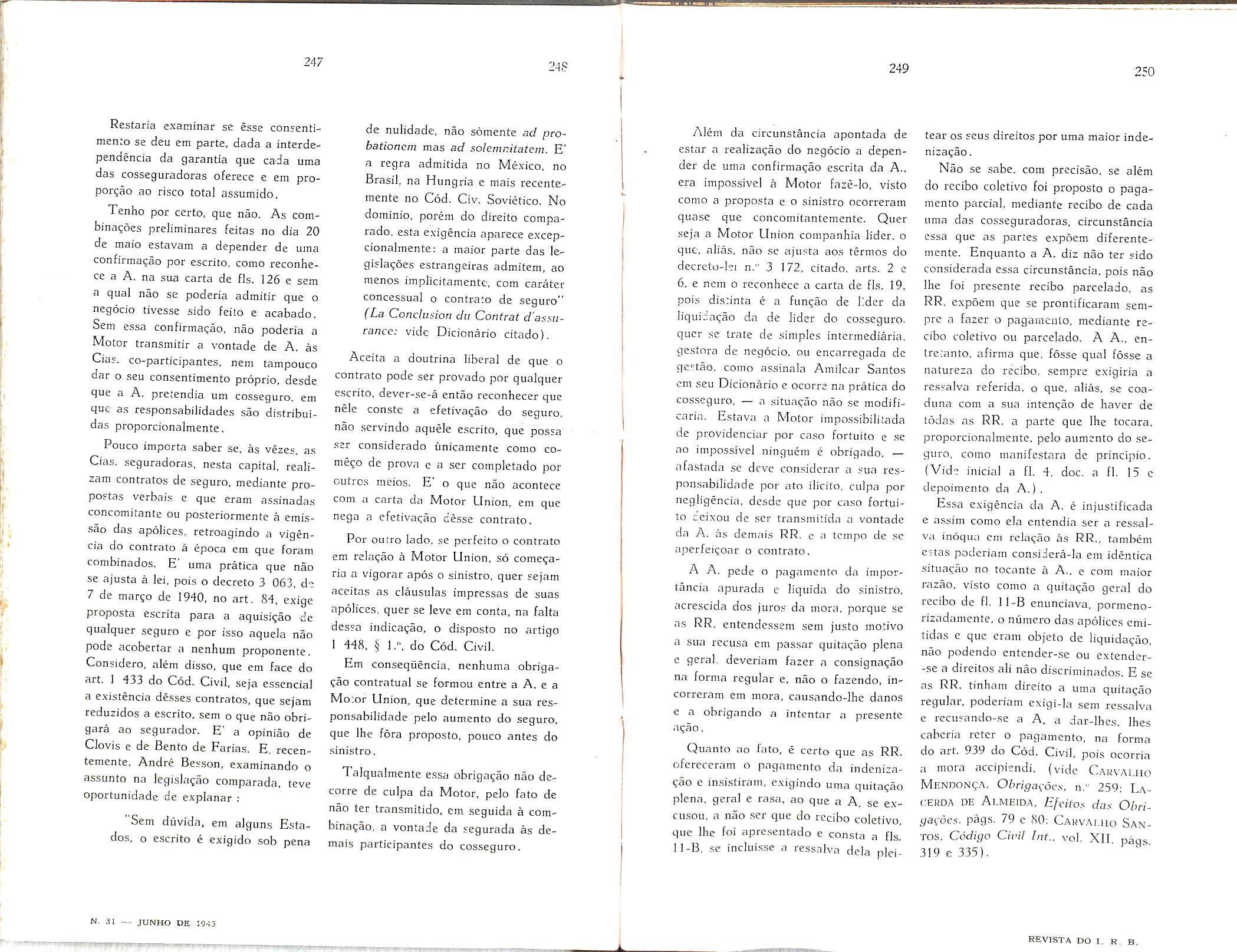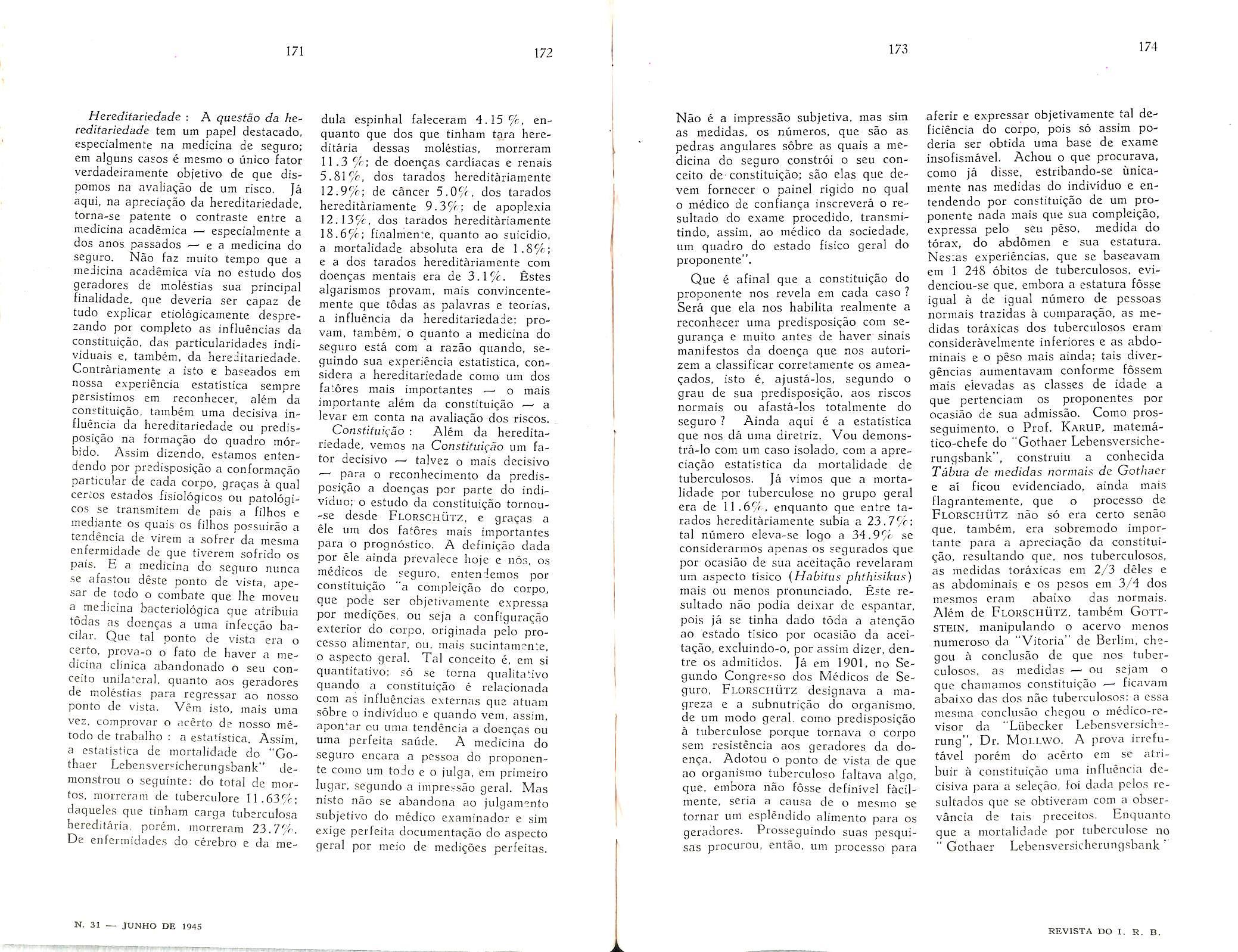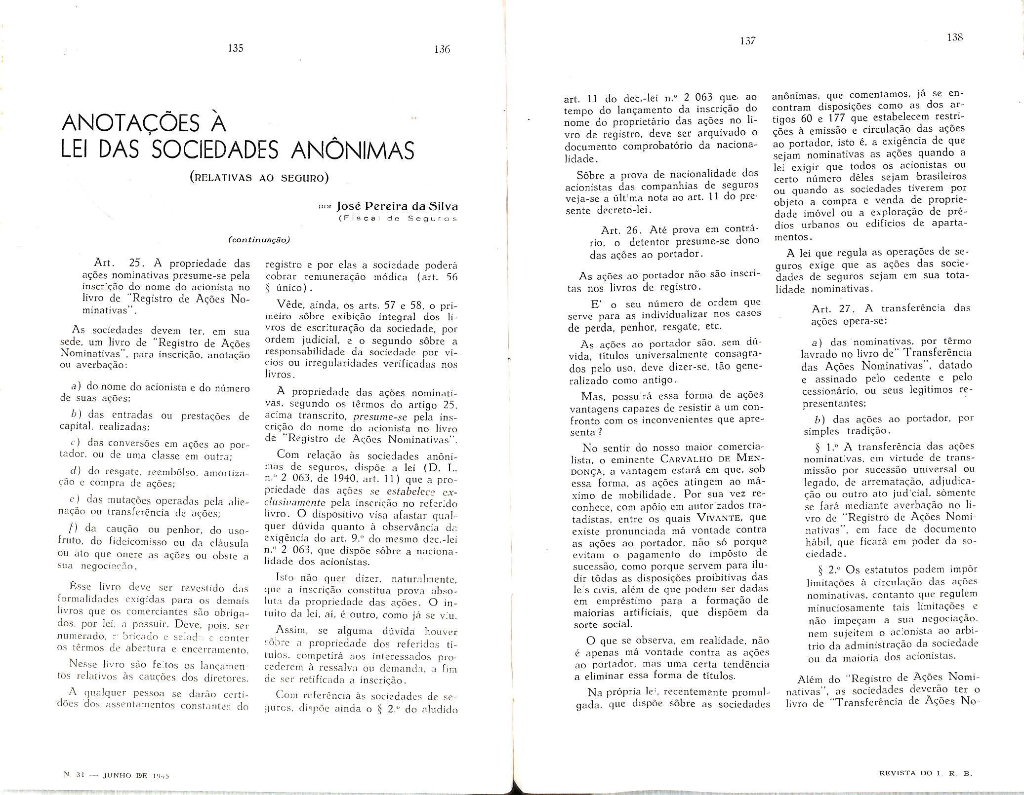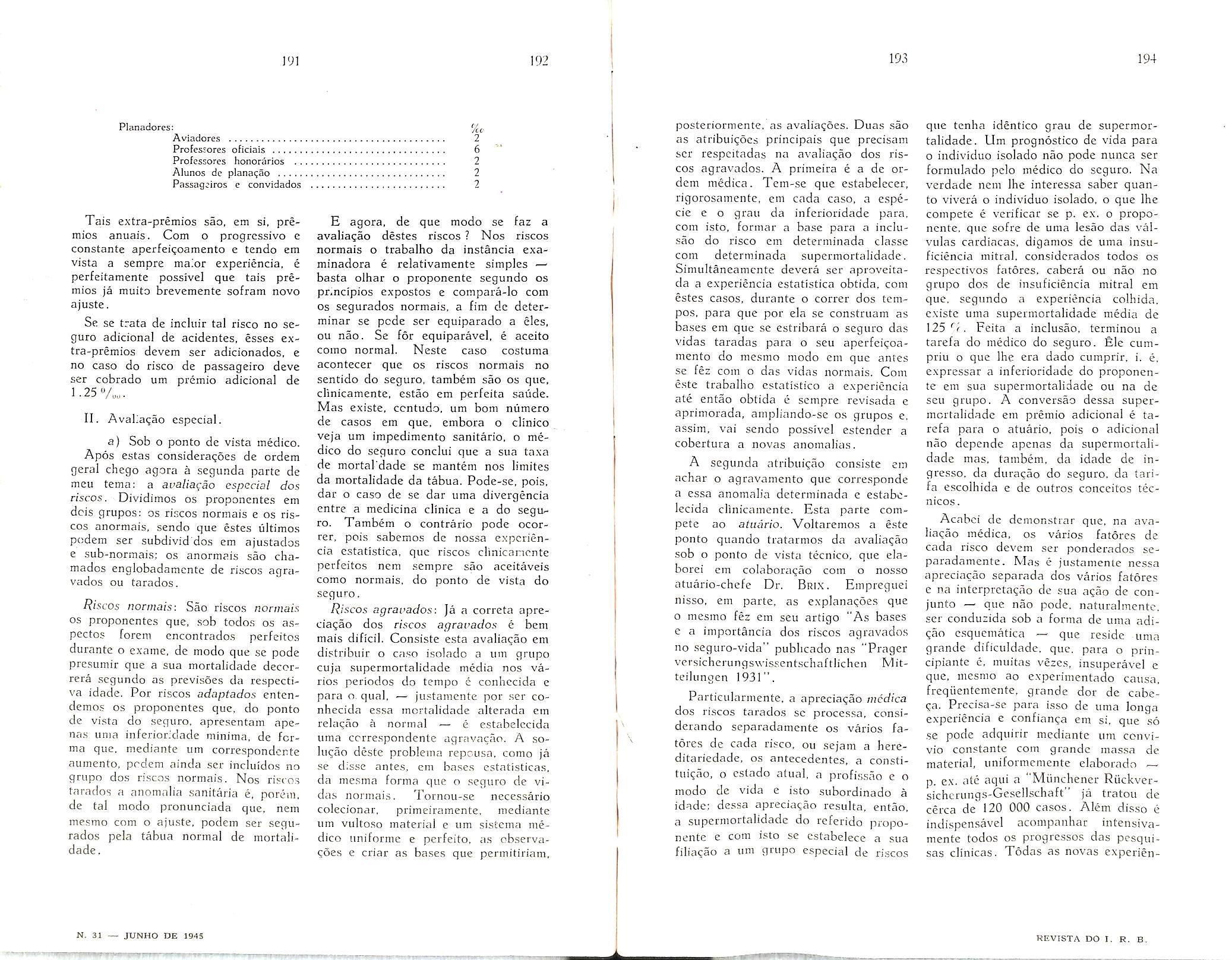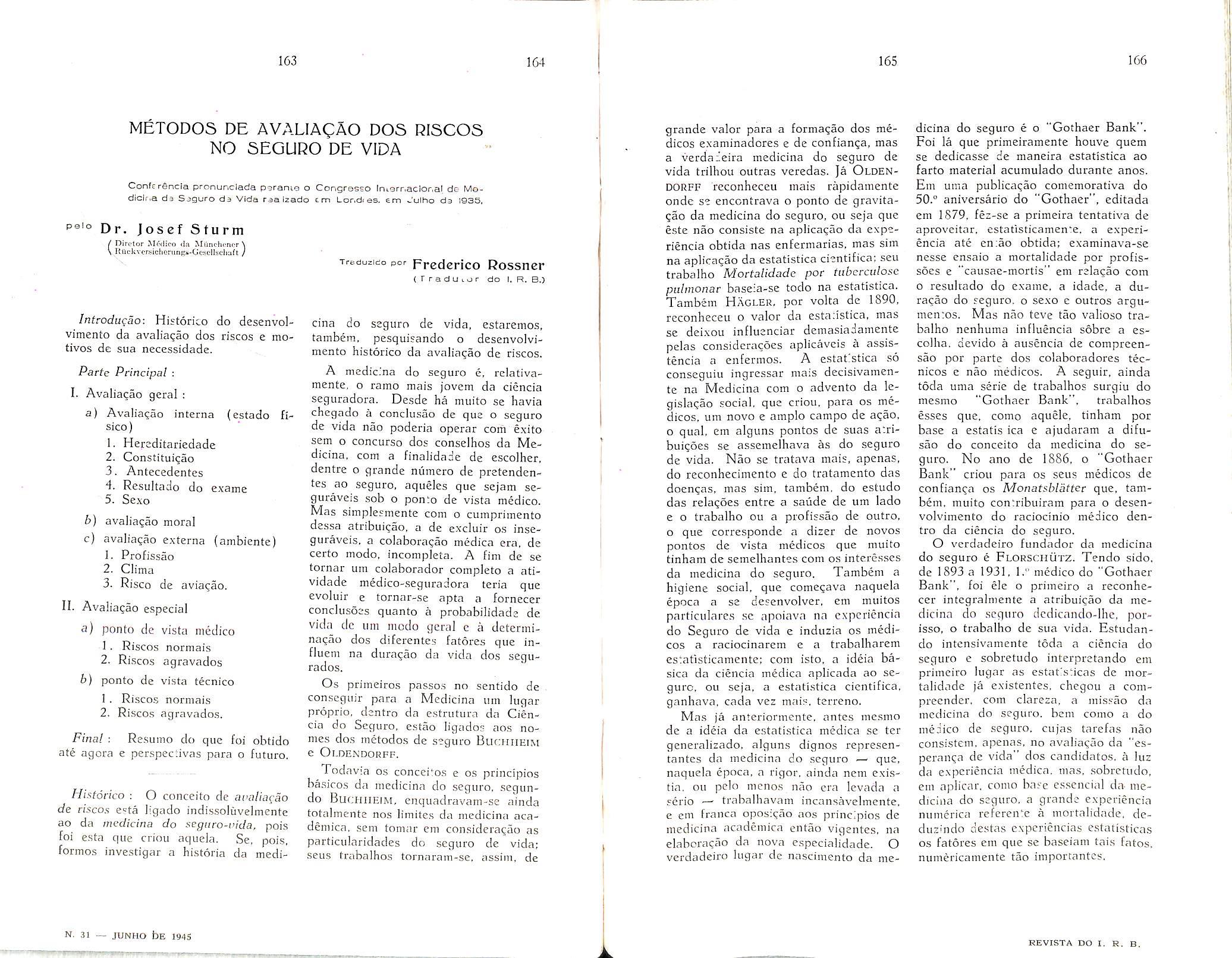 Sinistros Maritimos, col. 7 — Valorizagao do Homem, col. 9 — Institute dos Servigos Socials do Brasil, col. 19 — A proposta no Seguro Terrestre — Joao Vicente Campos, col. 47 — A boa-fe nas declaracoes prestadas pelo segurado Amilcar Santos, col. 55 — O seguro-incendio no Brasil em 1944 — Henrique Coelho da Rocha, col. 59 — Questao de Direito Maritimo — Joao Vicente Cam pos, col. 75 — Dos documentos que acompanham as propostas de liquidagao de sinistros-transportes — Nair de Tole do Camara, col. 79 — O seguro-invalidez, complemento do seguro-vida — Al fredo Carlos Pestana Junior, col. 85 Seguro de Vida — David Campista Filbo, col. 99 — Estudos sobre o ramo-vida Weher Jose Ferreira, col. 107 — Consolidag^ das Normas, Instrugoes e Circulares do I. R. B. — Paulo Barbosa Jacques, col. 115 — O registro de associados e contabilizacao de salaries no seguro so cial dos EE. UU. — A. Raja Gabaglia, col. 125 — Anotacoes a lei das sociedades anonimas. — Jose Pereira da Silva, col. 135 — Bolsa Brasileira de Seguros —EgasSanthiaio,col,