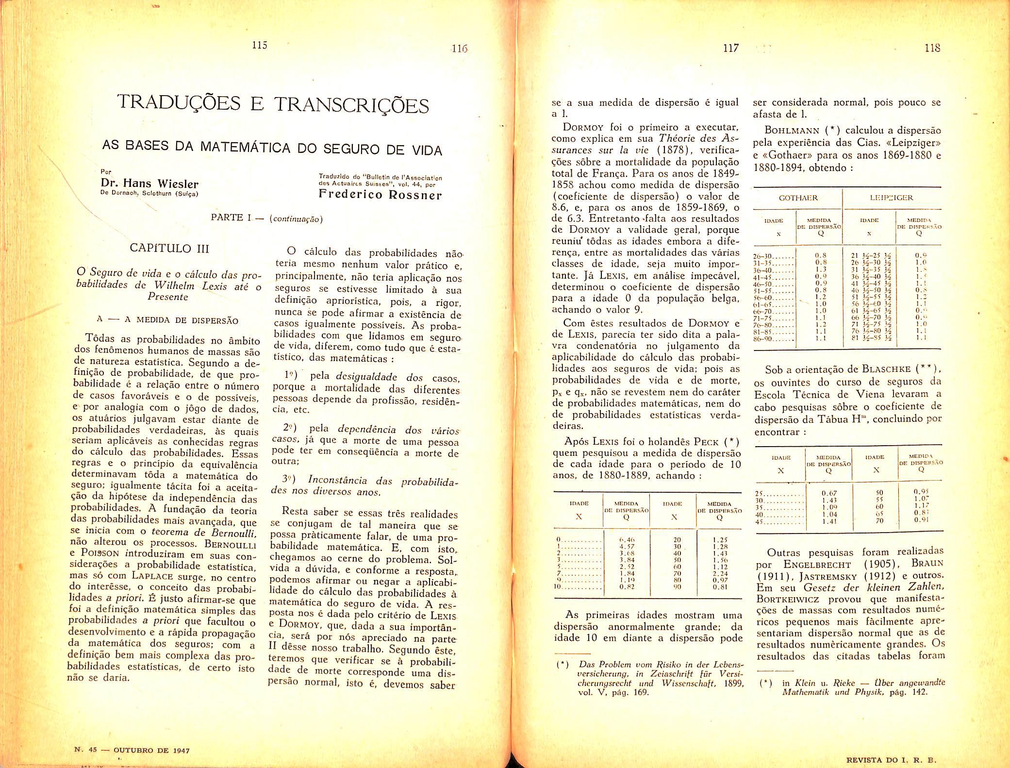 Per outro lado, a cstatistica como instrumento de orienta^ao tecnica e administrativa torna-se, cada vez mais, imprescindivcl a qualquer organiza^ao moderna. Em rela^ao as atividades do seguro c do resseguro •— cujas bases repousam na experiencia adquirida e na obscrva^ao cuidadosa e constante dos fatos economicos, financeiros c sociais — a estatistica tem a mais alta importancia.