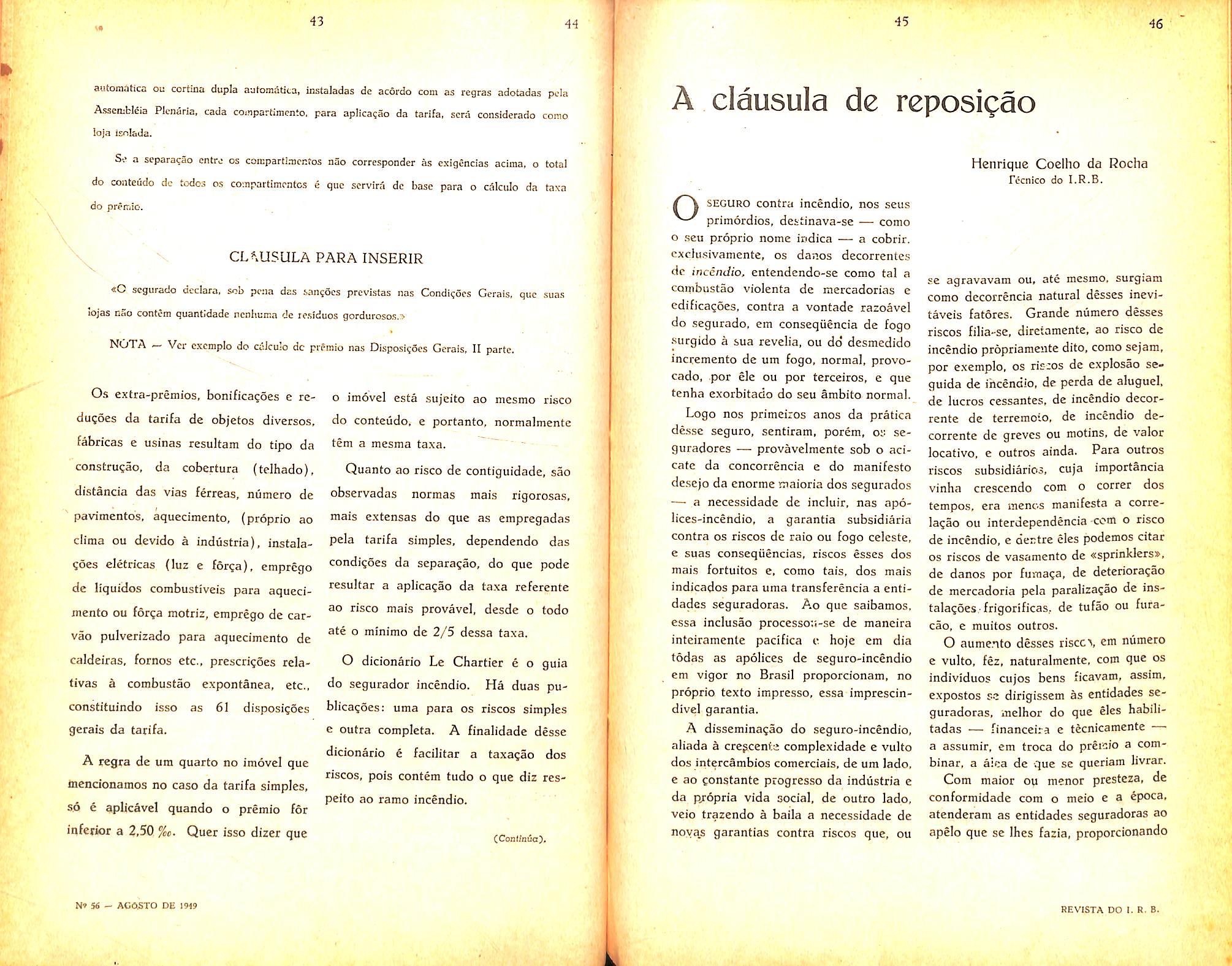 Primeiro Congresso Brasiieiro de Seguros: Carlos Bandeira de Mclh,coluna 3 — Alguns aspectos tecnicos do seguro agricola; Joao Lyra Madeira, coluna 7 — Alguns notas sobre o seguro-incendio em Franga; A. C. Pestana Junior, coluna 27 — A clausula de reposi?ao: Henrique Coelho da Rocha. coluna 45 — A apdlice de seguro-incendio; Jose Sollero Filho, co luna 55 — Aspectos estatisticos dos seguros privados no Brasil em 1948; Mario Trindade, coluna 63 — Apolice e tarifa uniformes para o segtiro-acidentes pessoais; Oswaldo Dias Martins e Jorge Cortes Freitas. coluna 81 —" O riscQ do transporte em maos do portador: /. /. Sauza Mendes, coluna 103
