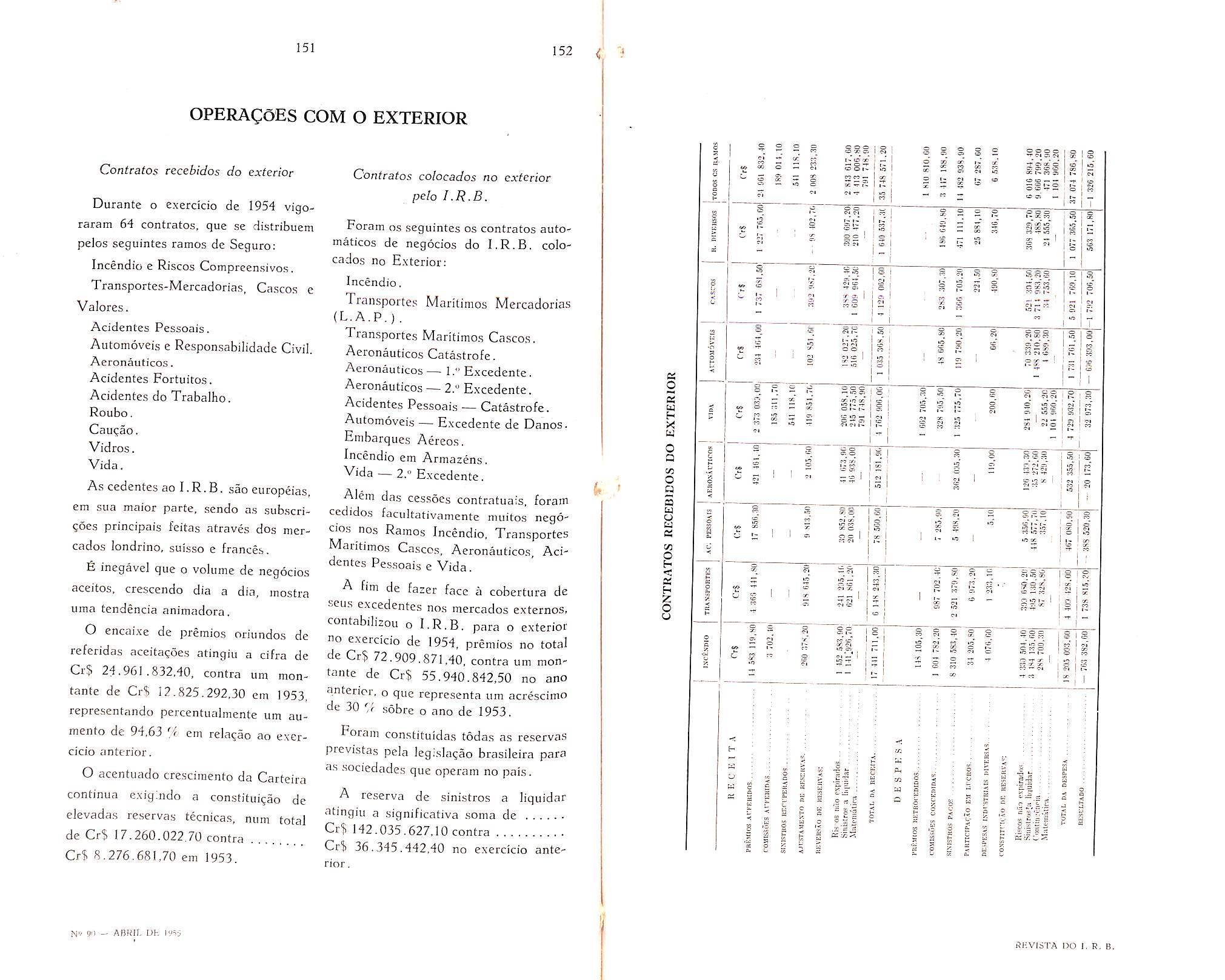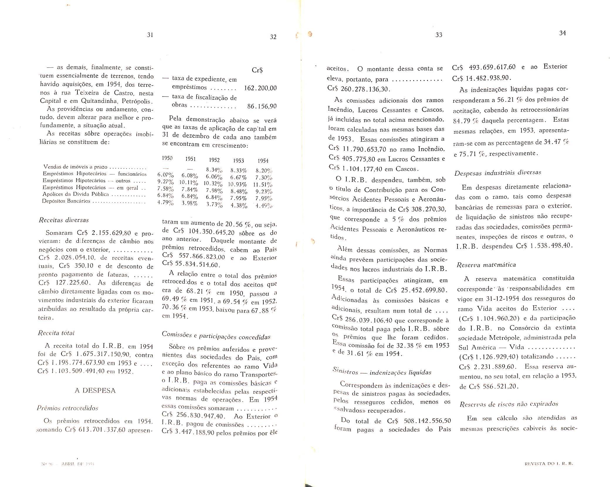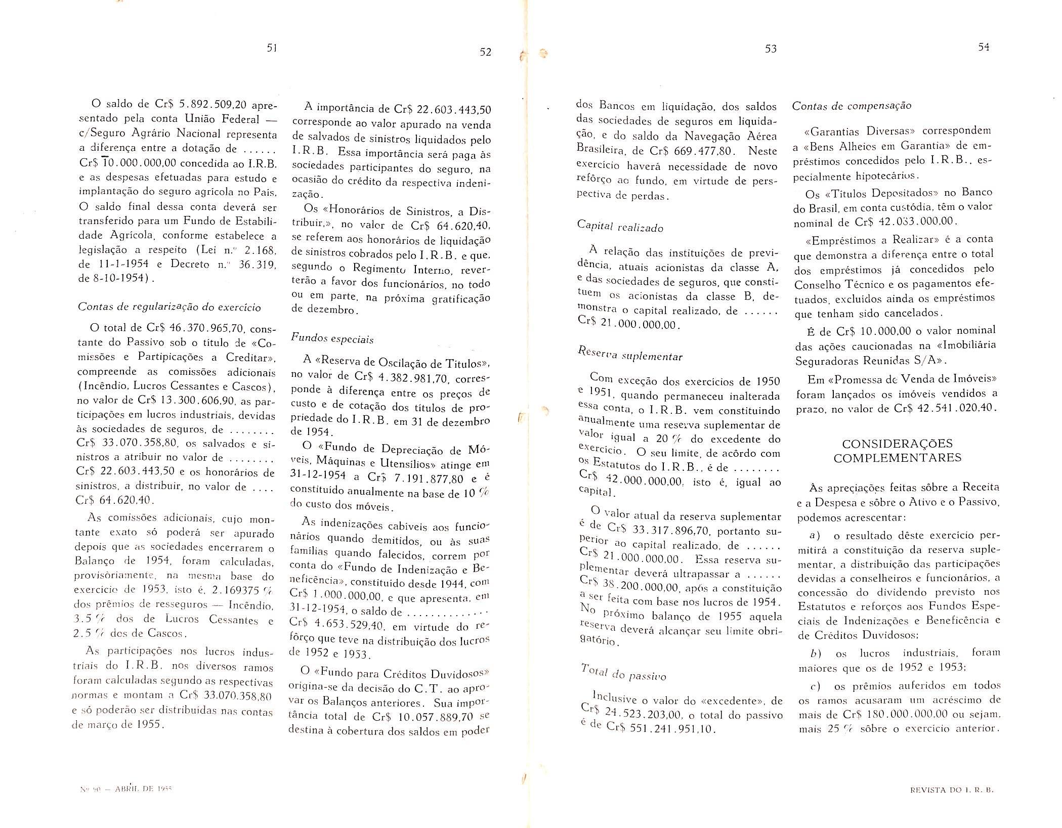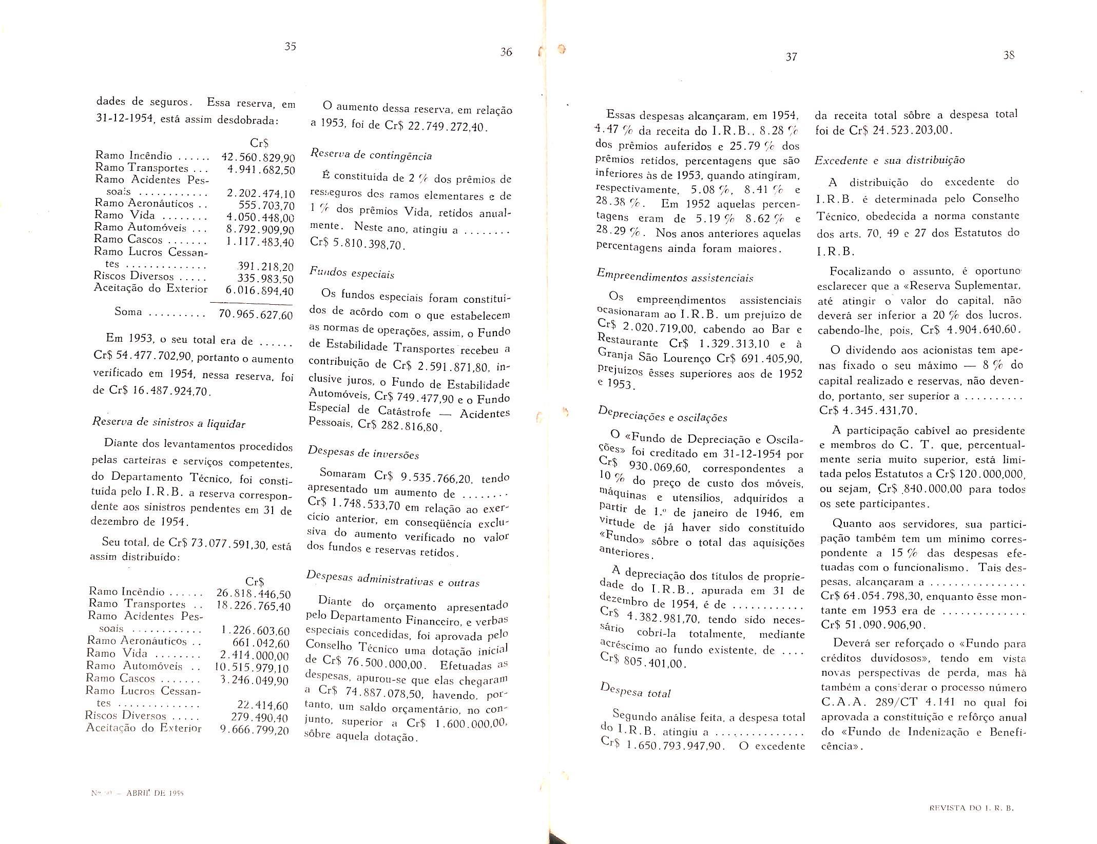 A fim de fazer face a cobertura de sens excedentes nos mercados externos, contabilizou o l.R.B. para o exterior no exercicio de 1954, premios no total de Cr$ 72,909,871,40, contra um montante de CrS 55,940.842,50 no ano anterior, o que representa um acrescimo de 30 ',f sobre o ano de 1953, Foram con.stituidas todas as reservas previstas pcla legisla^ao brasileira para as .sociedades que operam no pais.