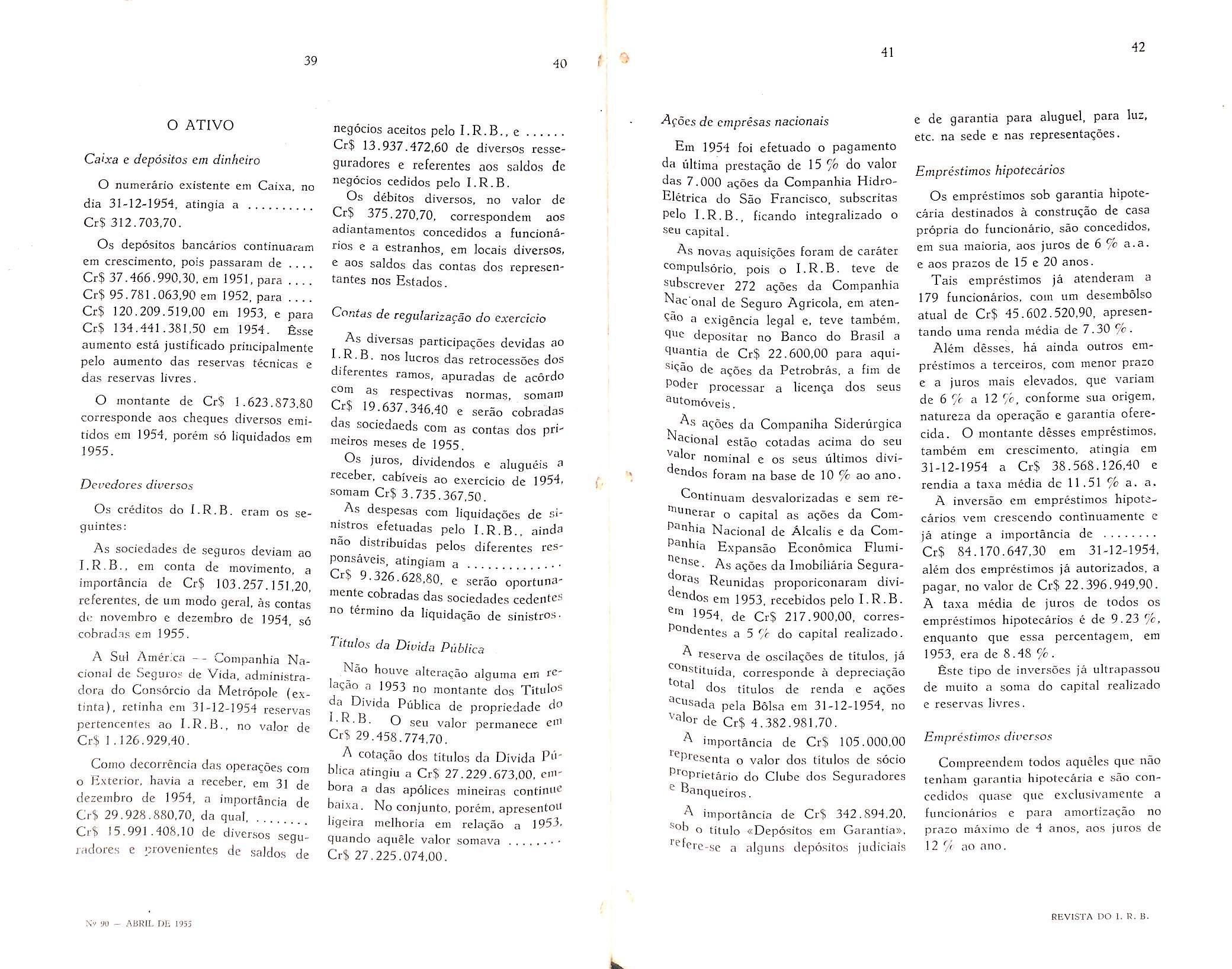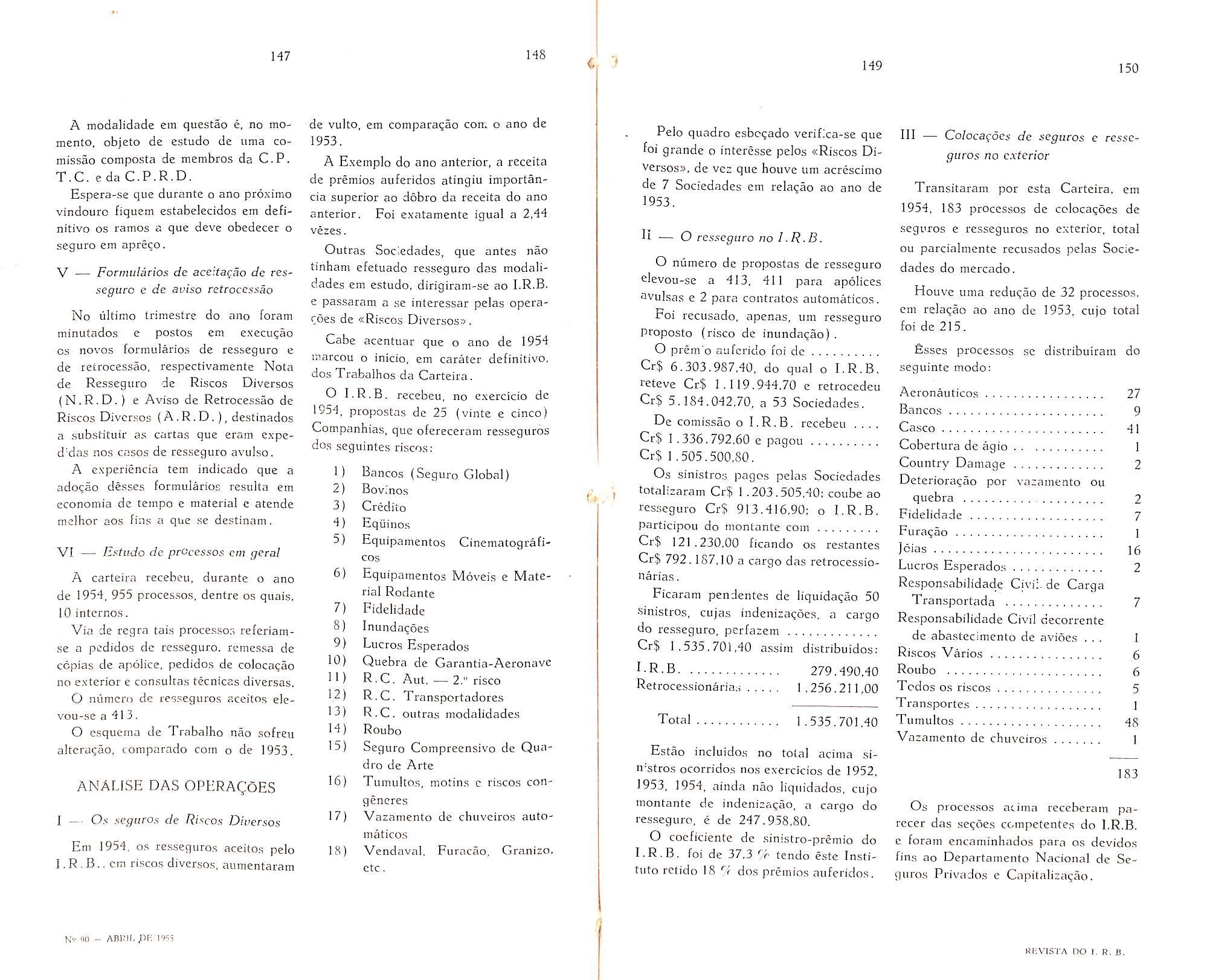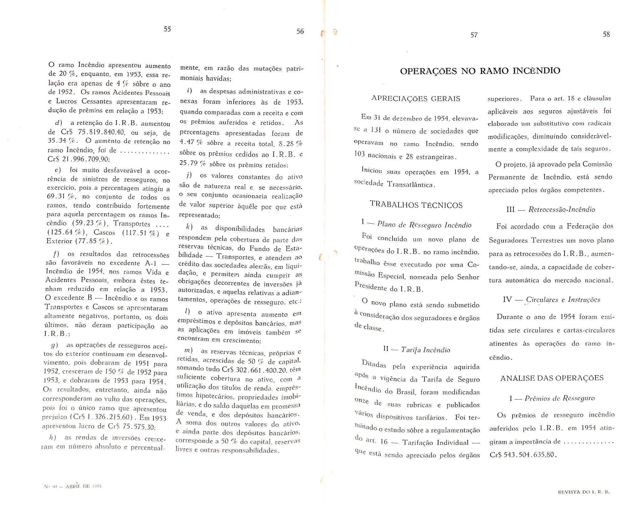 A fim de fazer face a cobertura de sens excedentes nos mercados externos, contabilizou o l.R.B. para o exterior no exercicio de 1954, premios no total de Cr$ 72,909,871,40, contra um montante de CrS 55,940.842,50 no ano anterior, o que representa um acrescimo de 30 ',f sobre o ano de 1953, Foram con.stituidas todas as reservas previstas pcla legisla^ao brasileira para as .sociedades que operam no pais.